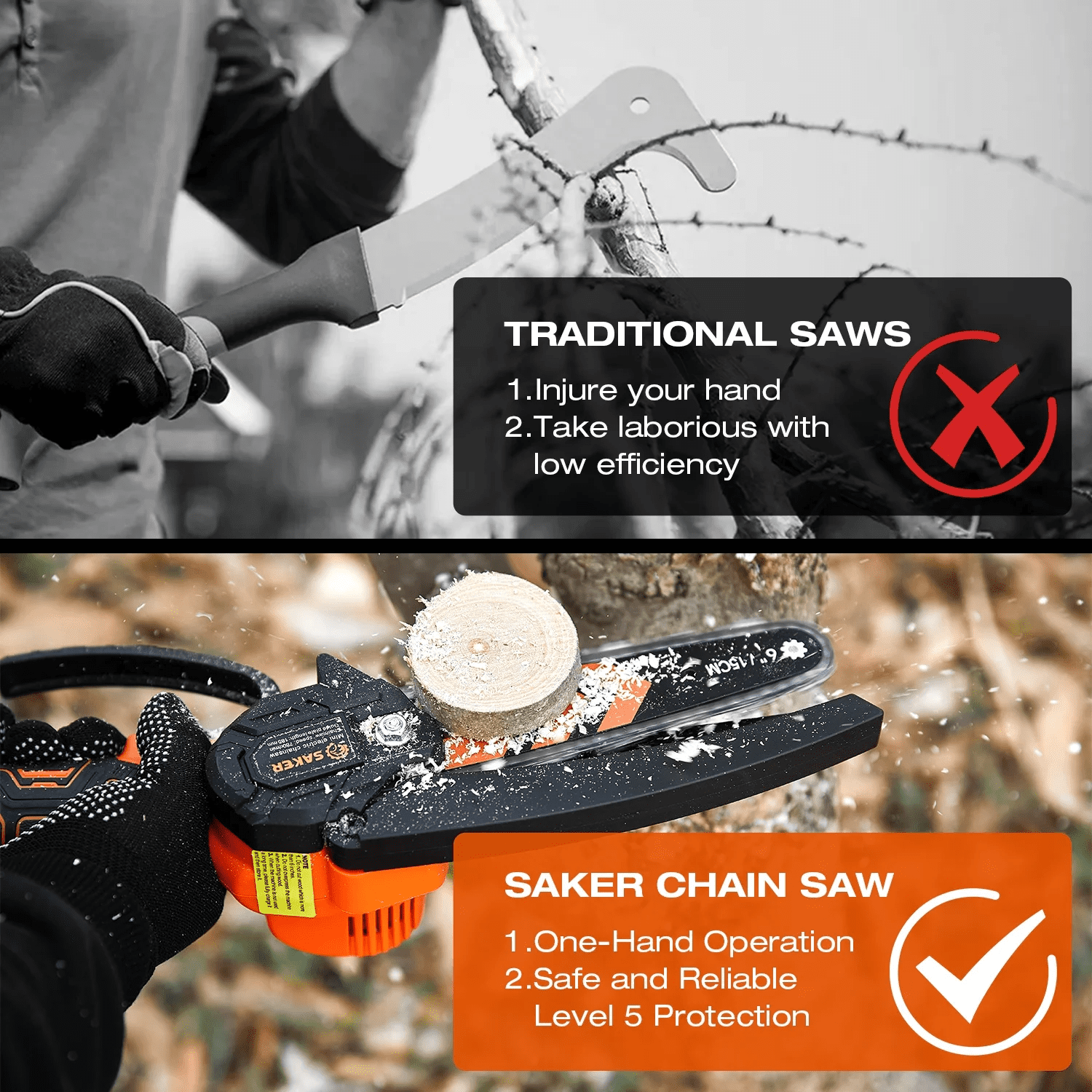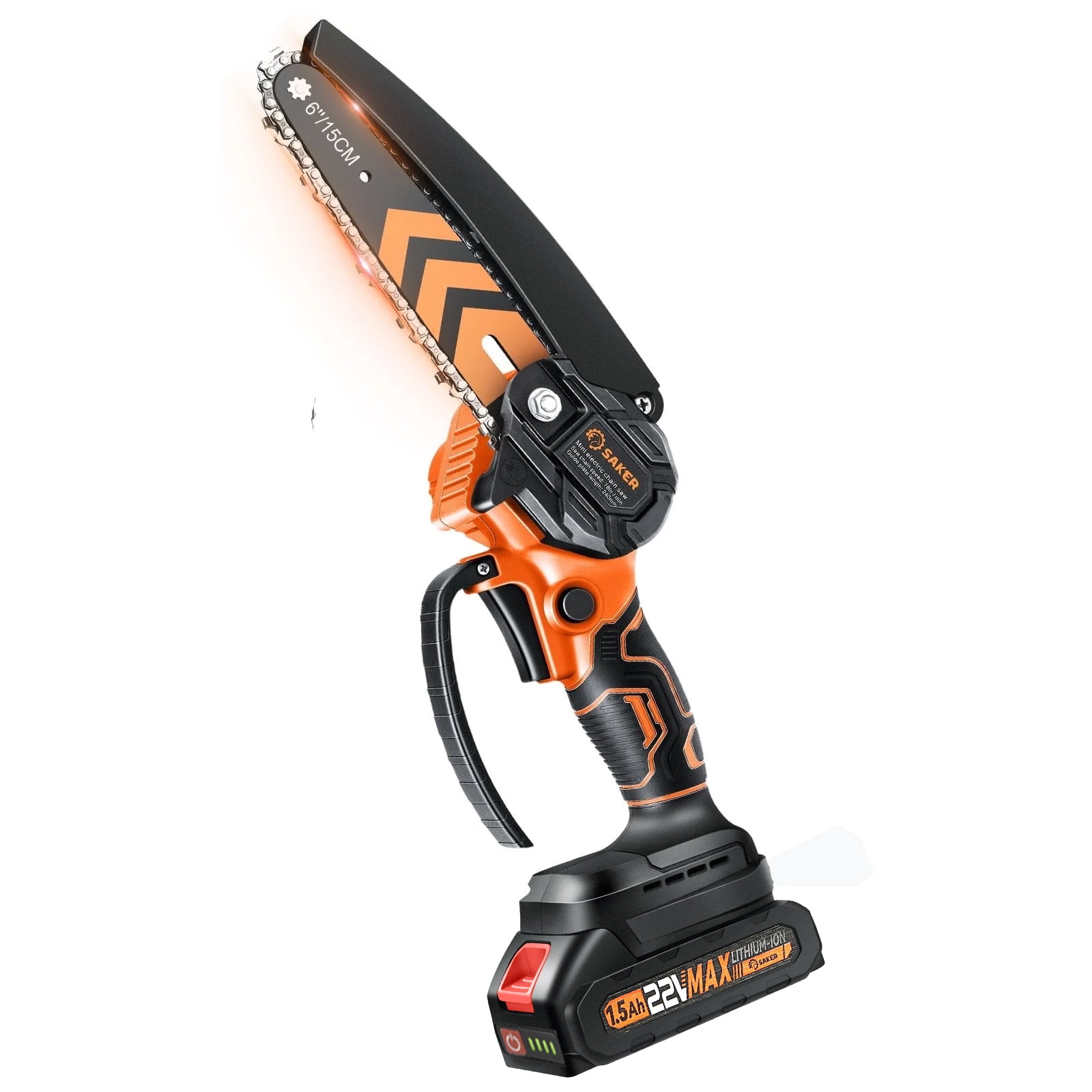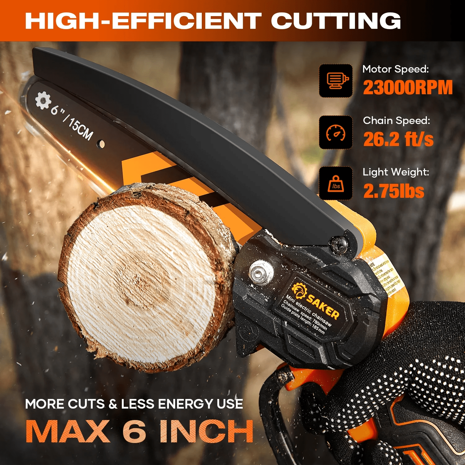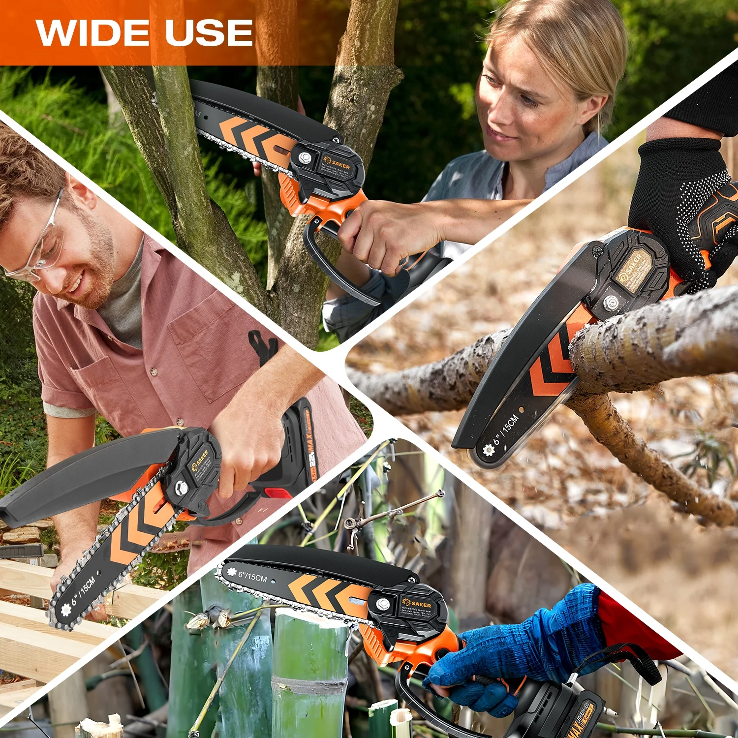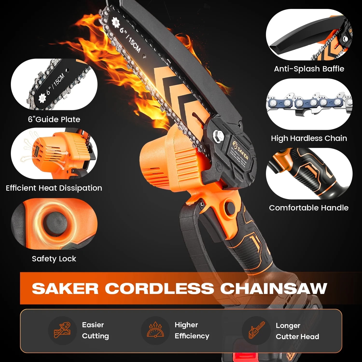 Saker Handheld Mini Chainsaw, 6-Inch Electric Chainsaw for Tree Trimming, Wood Cutting, Portable & Cordless, Includes 2 Chains & 2 Batteries, Orange