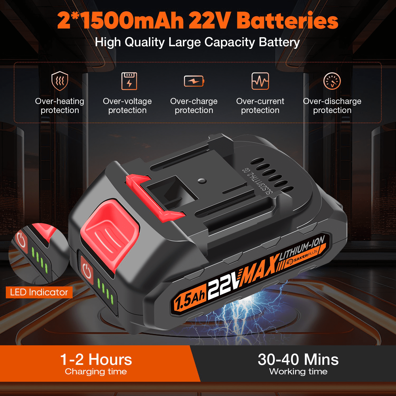 【Powerful Cutting Performance】- Saker mini chainsaw features a 550W pure copper motor to drive the chain at 780 RPM for fast and precise cuts. With a hardened chain guide and 2Pcs 22V batteries, it can cut 6-inch logs in 6 seconds and handle smaller branches effortlessly. It is pretty suitable for gardening, wood cutting, DIY projects and so on. 【One Hand Use】- Saker handheld chainsaw weighs just 2.7lbs (including battery), so it is easy to carry and operate. Its lightweight design ensures comfortable use for women and the elderly. Additionally, the ergonomic handle provides a secure grip to reduce fatigue during longtime use. 【Rechargeable & Long-Lasting Batteries】- Includes 2Pcs 22V 1500mAh batteries for extended use. Each Battery offers up to 40 minutes (Totally 80 mins) and only requires 1.5 to 2 hours to fully recharge. Each battery features a LED indicator which can clearly display remaining power, so you can easily monitor the charge level and plan your workings accordingly. If you do not use it for a long time, please remember to fully charge the battery first for a better experience when you use it next time. 【Multiple Protection】- Saker mini chainsaw offers four safety features: a safety lock to prevent accidental starts, a safety flap to block wood chips, included a goggle for eye protection, and a glove to protect your hands during operation. These thoughtful protections ensure a secure and worry-free cutting experience for users of all skill levels. 【Efficient Heat Dissipation】- The efficient ventilation and heat dissipation design protect the motor from overheating, ensuring the battery-powered mini chainsaw operates with enhanced safety and reliability. This feature extends the lifespan of the tool, providing long-lasting performance for all your cutting needs. 【Excellent After-Sales Support】- Saker offers 24/7 customer service to solve any issue you may have. If you are unsatisfied with the product or encounter any problem, our dedicated support team guarantees a response within 12 hours. We are committed to providing a worry-free purchase experience and reliable assistance, ensuring your complete satisfaction with our products and services.