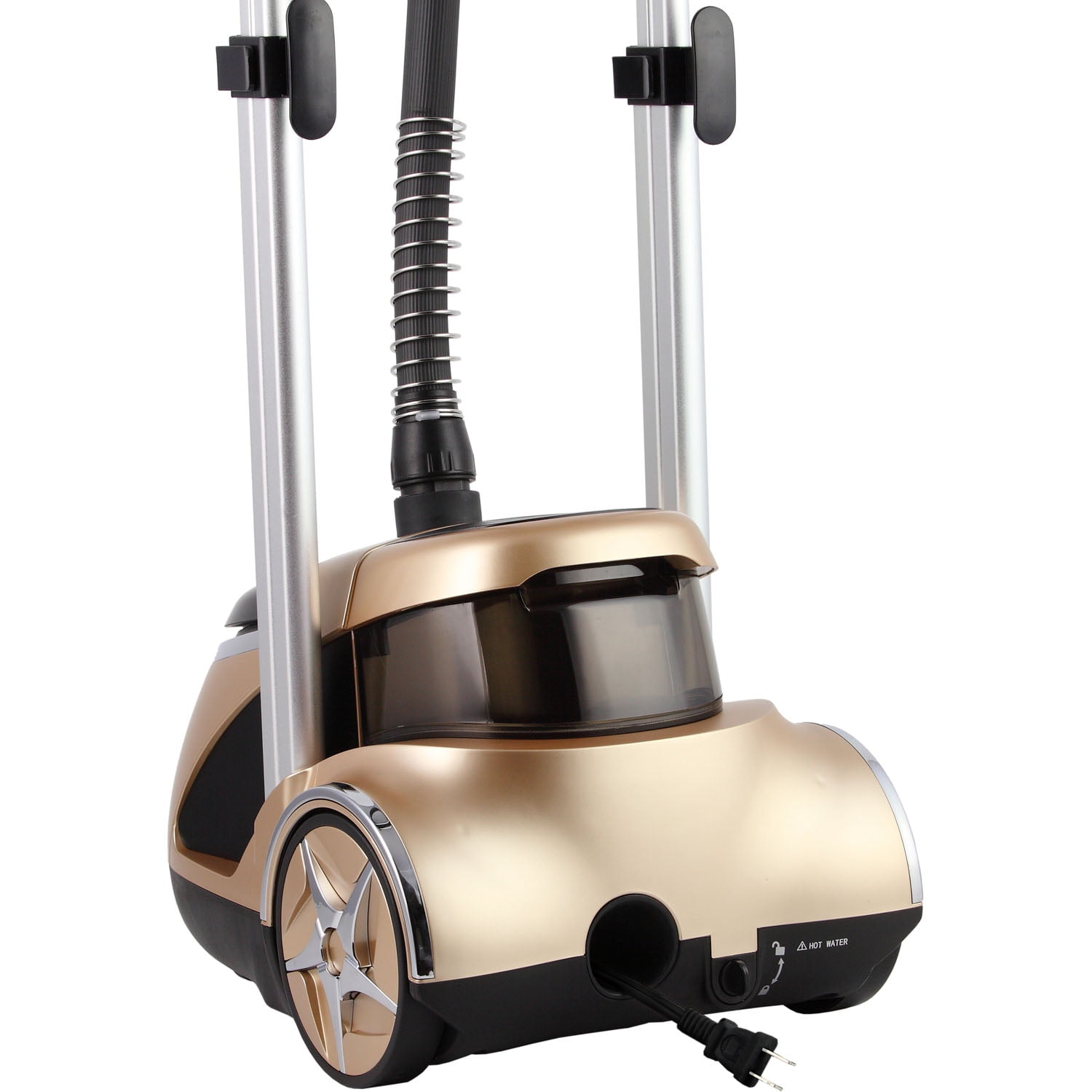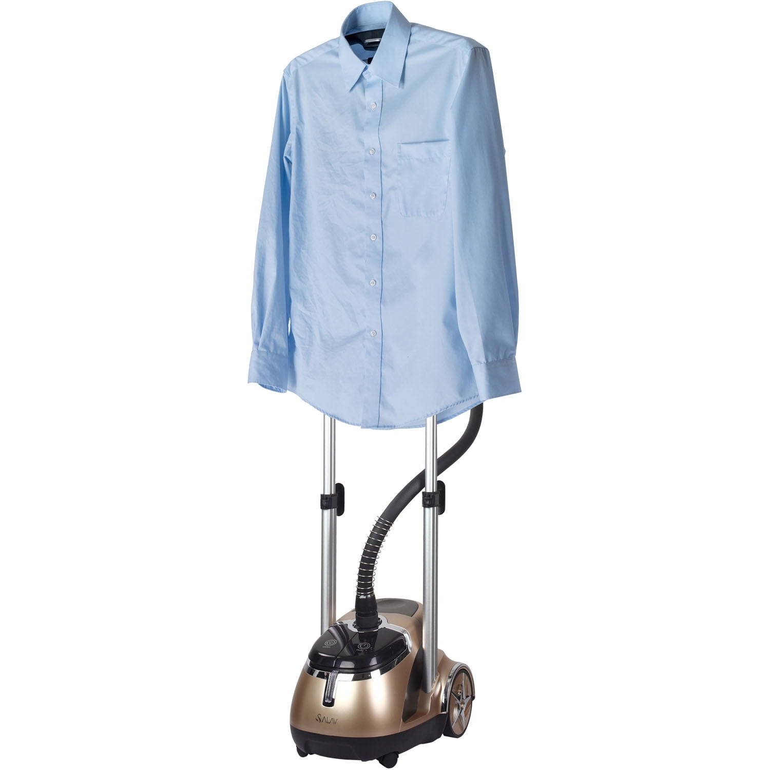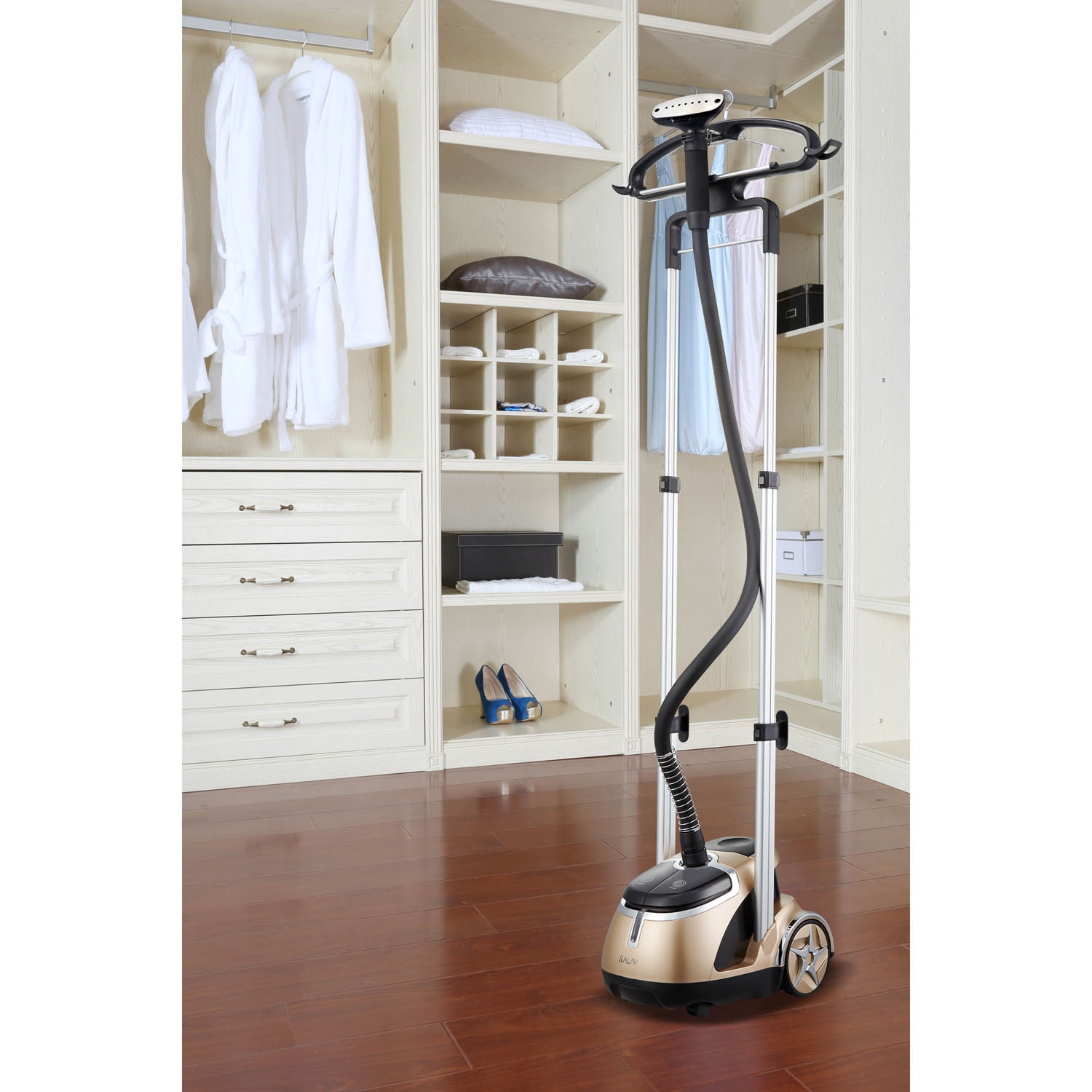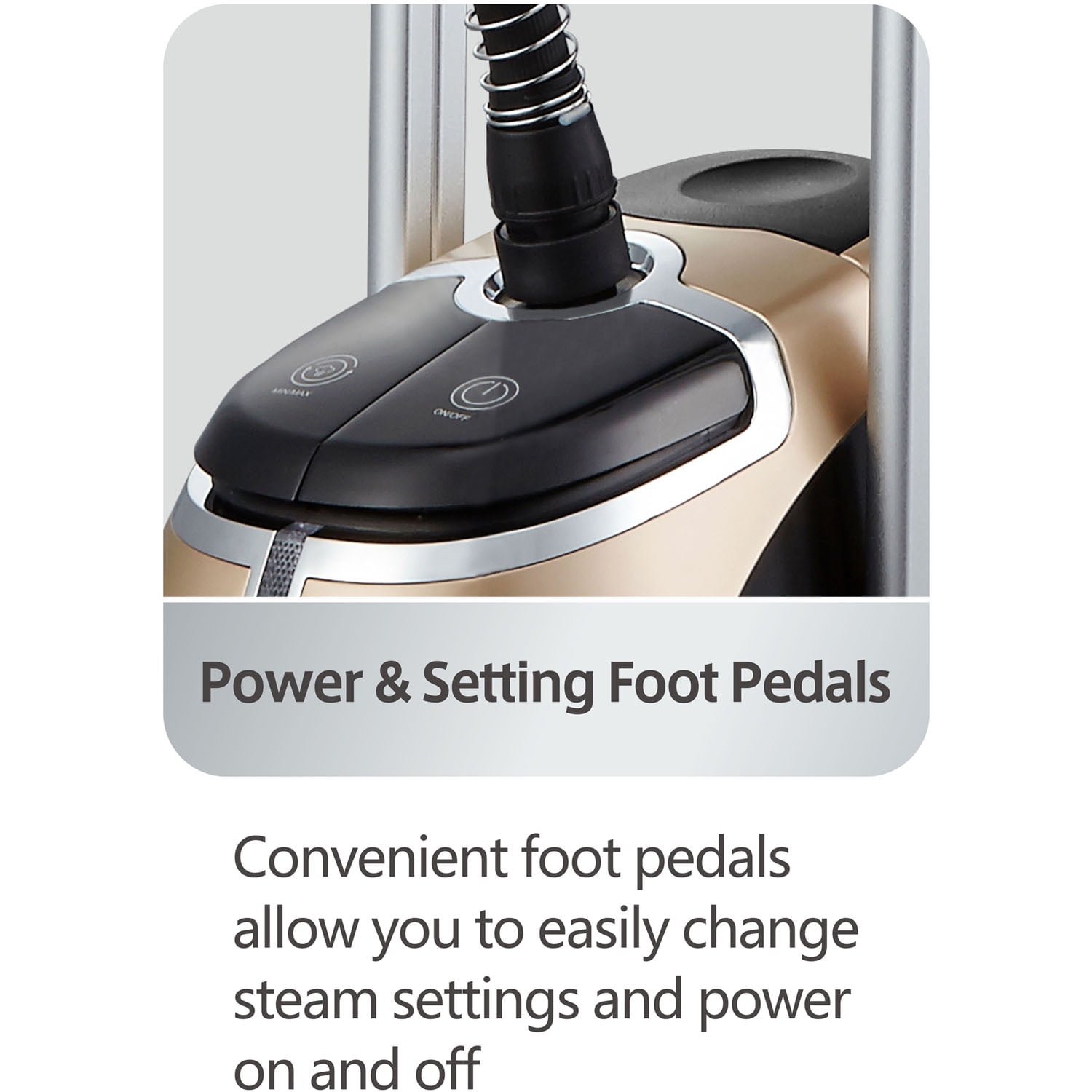 1500-watt steamer removes wrinkles from clothing, drapes, upholstery and more Steam nozzle with flat stainless steel plate maximizes steam heat and effectiveness 4.6 ft. double insulated hose helps maintain steam temperature and regulate hose surface heat Convenient power and dual steam setting pedals ergonomically located for easy access. Steam-ready in 45 seconds for quick and easy touch-ups 61 oz. (1.8 liters) removable translucent water tank provides over 60 minutes of continuous steam Patented drain plug for safe and convenient care & maintenance Dual telescopic bar-support for added stability and compact storage provides height up to 53 inches Curved multifunctional hanger with dual hanger levels, fold-down hanger bar, clips and side hooks Includes hanger clips, pants press, fabric brush and mini ironing paddle Auto shut-off when water runs out or overheats Rolling casters and chrome wheels for easy mobility and storage 6.5 ft. retractable power cord Color: Gold