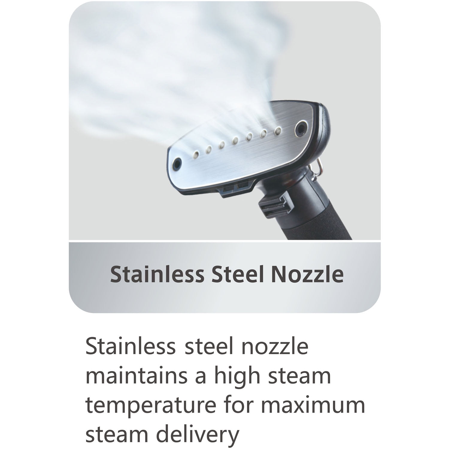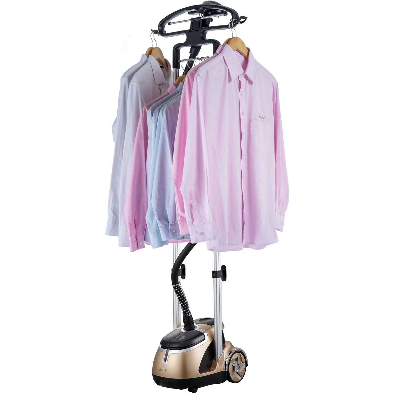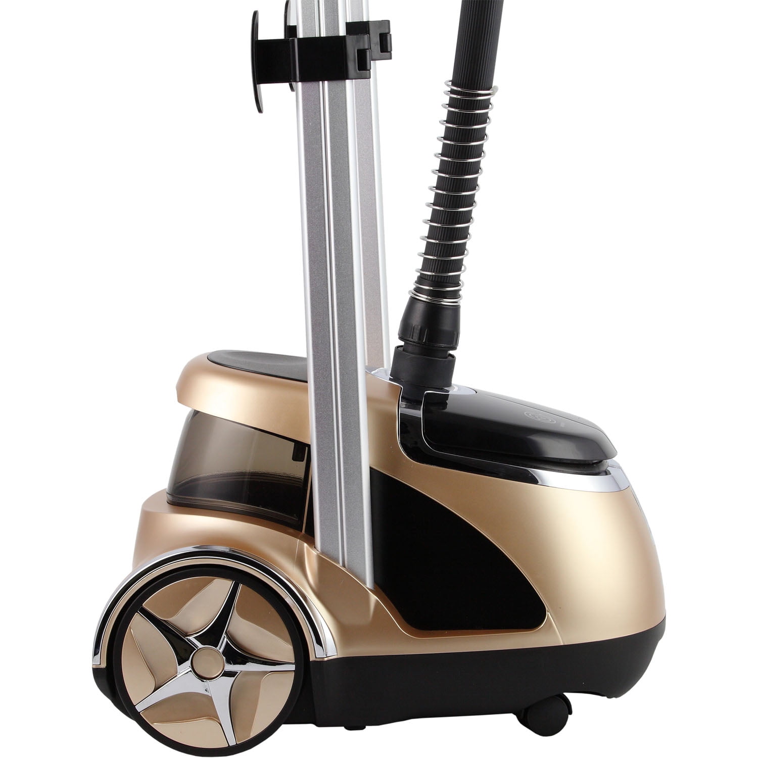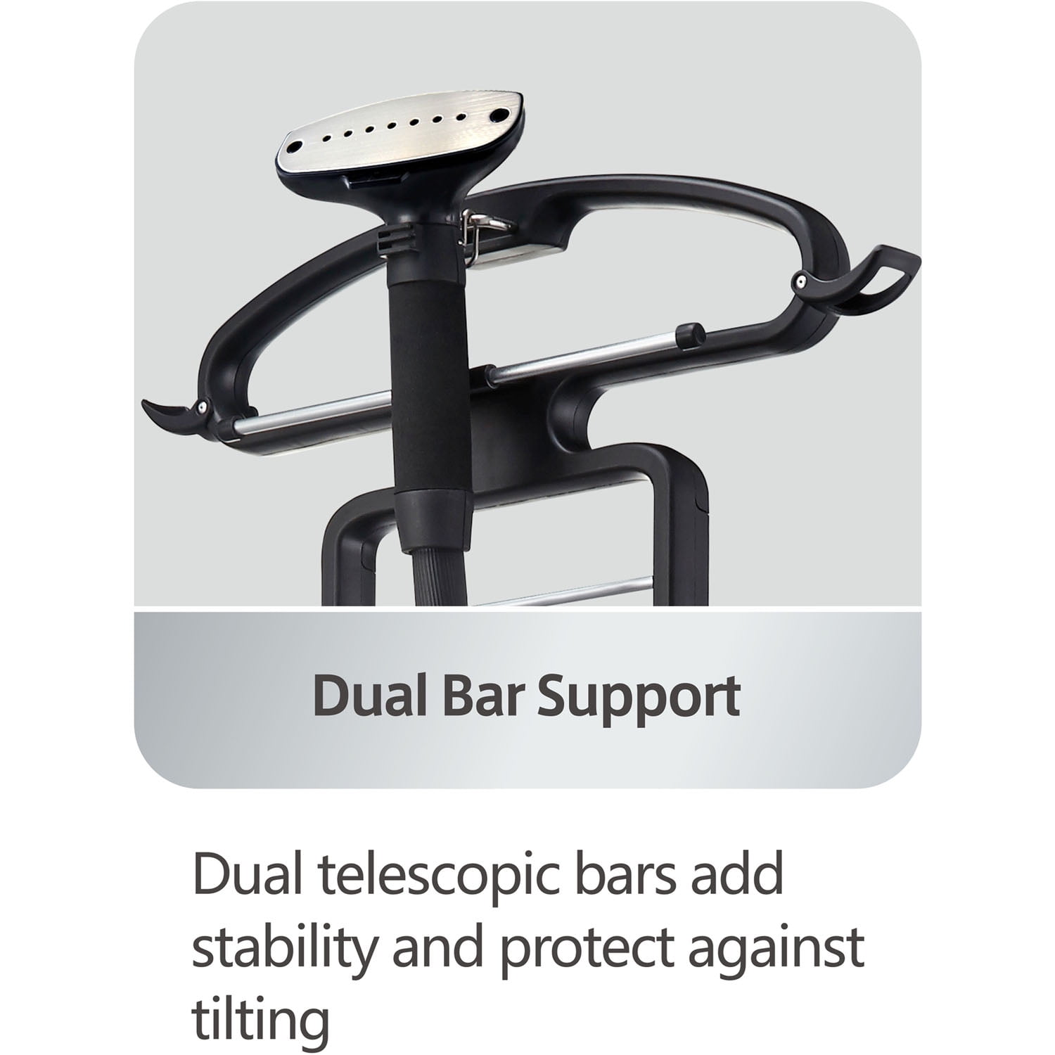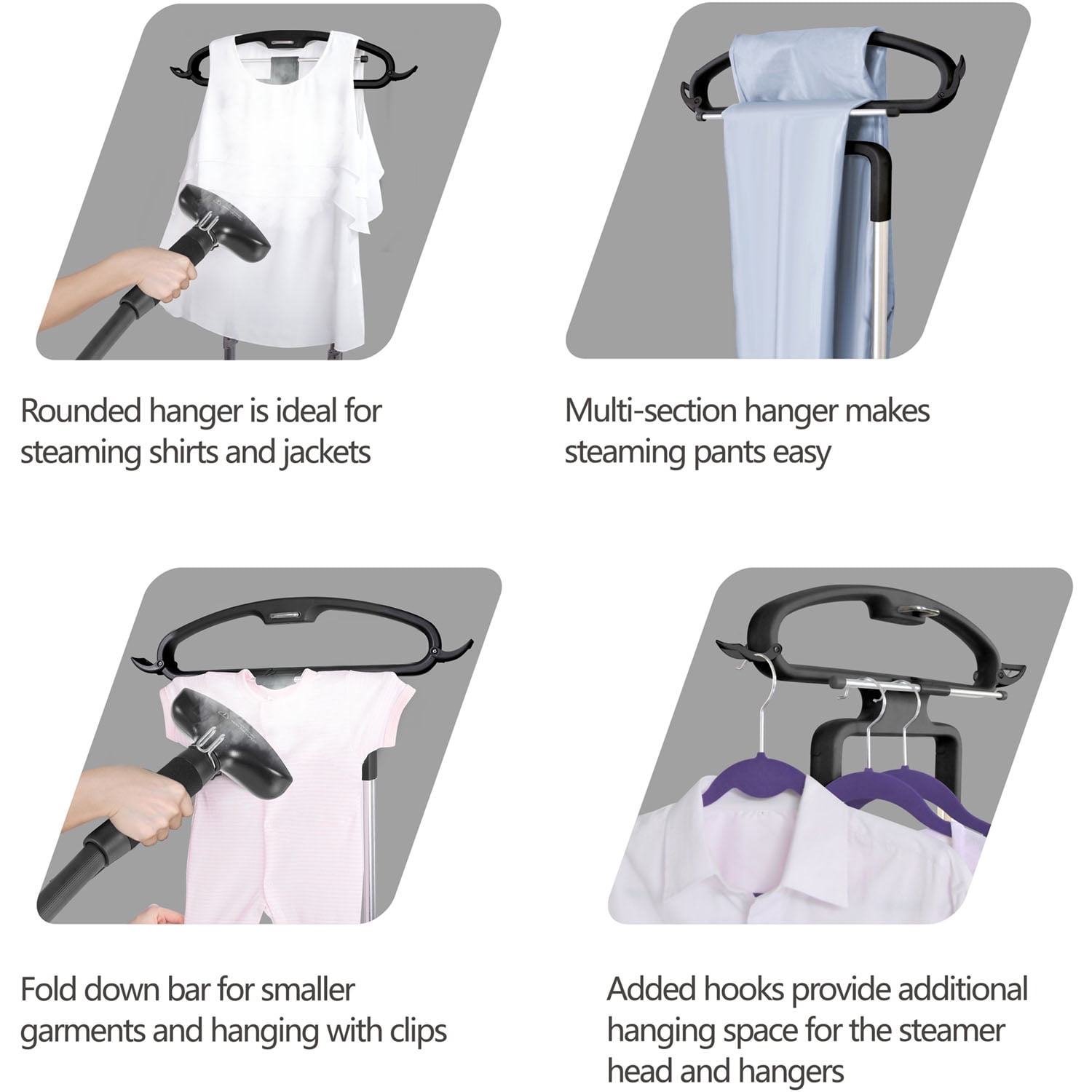 1500-watt steamer removes wrinkles from clothing, drapes, upholstery and more Steam nozzle with flat stainless steel plate maximizes steam heat and effectiveness 4.6 ft. double insulated hose helps maintain steam temperature and regulate hose surface heat Convenient power and dual steam setting pedals ergonomically located for easy access. Steam-ready in 45 seconds for quick and easy touch-ups 61 oz. (1.8 liters) removable translucent water tank provides over 60 minutes of continuous steam Patented drain plug for safe and convenient care & maintenance Dual telescopic bar-support for added stability and compact storage provides height up to 53 inches Curved multifunctional hanger with dual hanger levels, fold-down hanger bar, clips and side hooks Includes hanger clips, pants press, fabric brush and mini ironing paddle Auto shut-off when water runs out or overheats Rolling casters and chrome wheels for easy mobility and storage 6.5 ft. retractable power cord Color: Gold