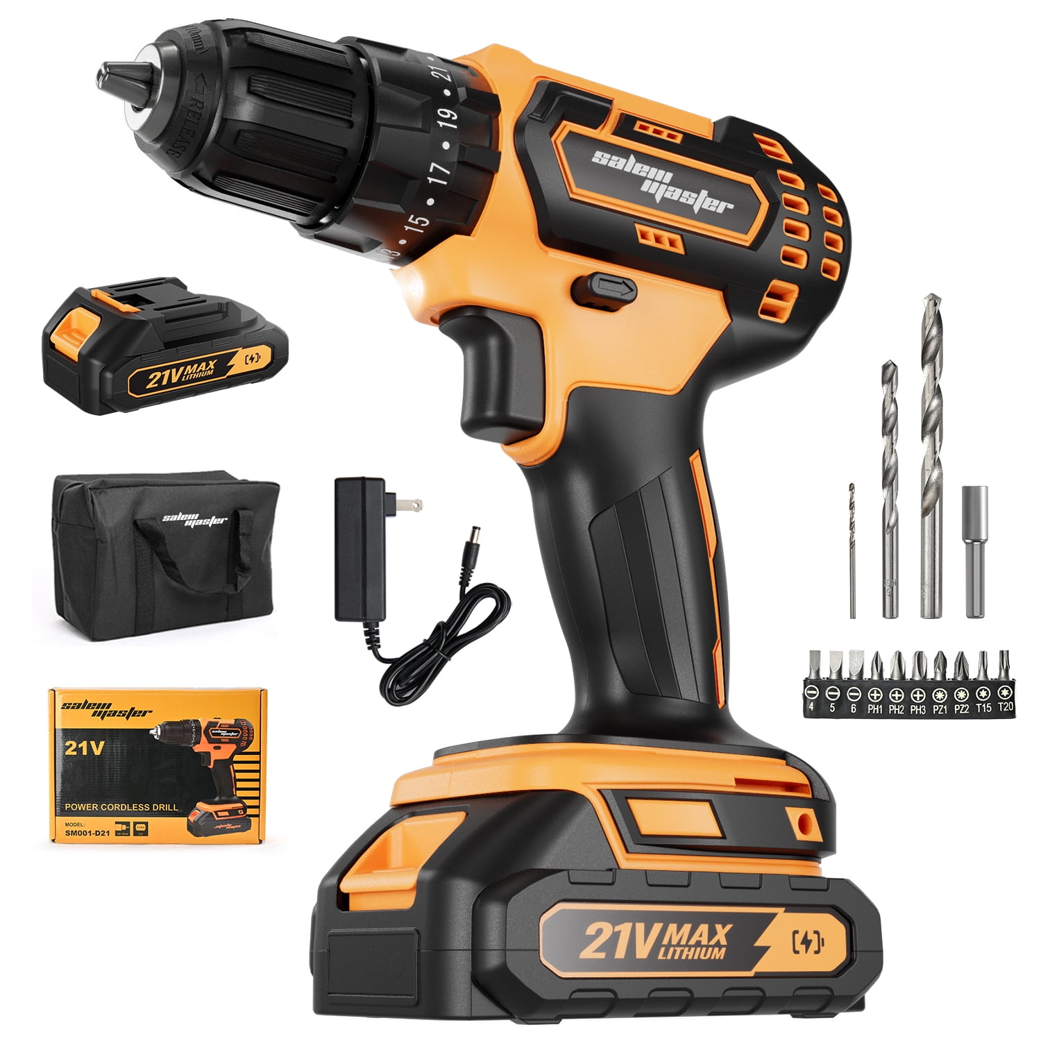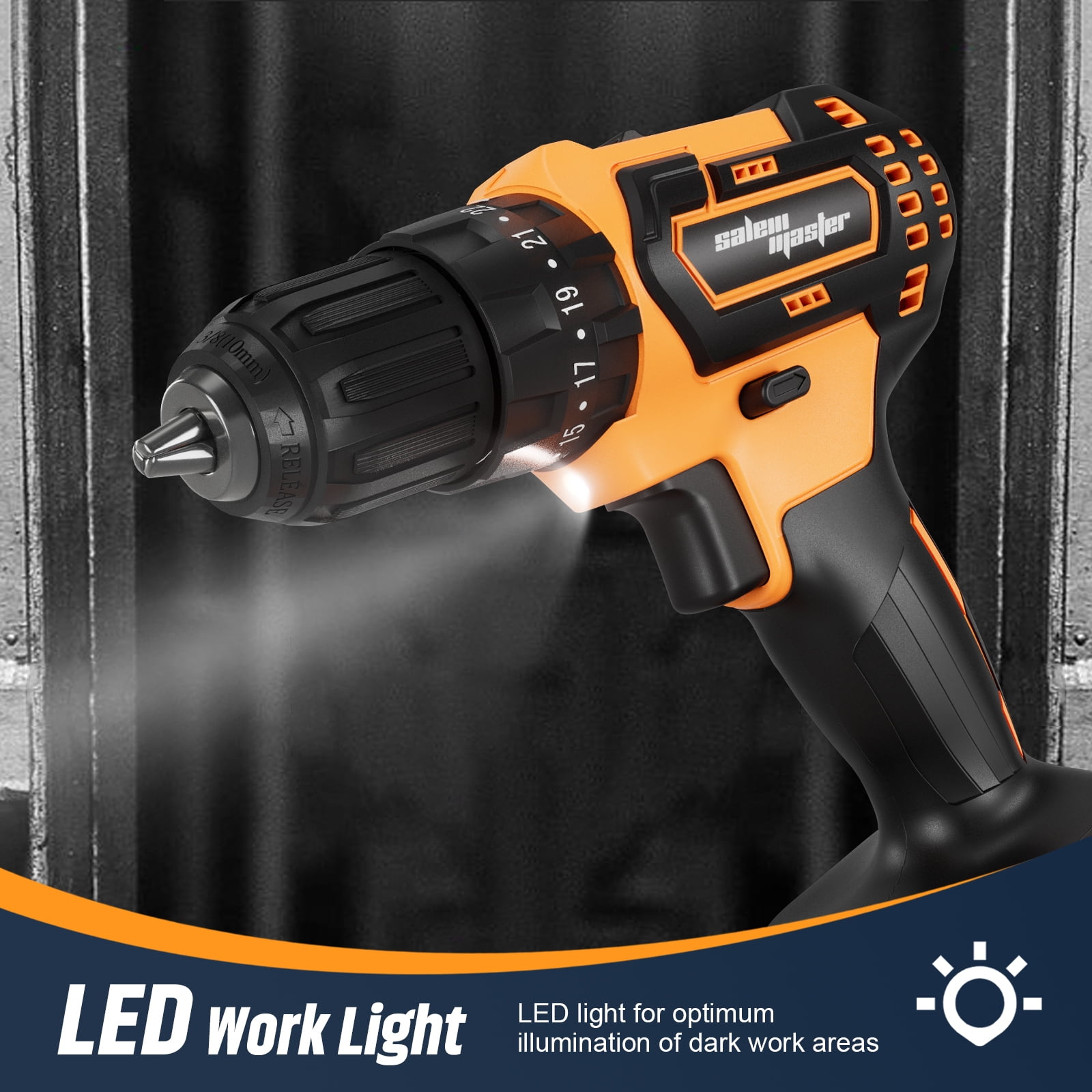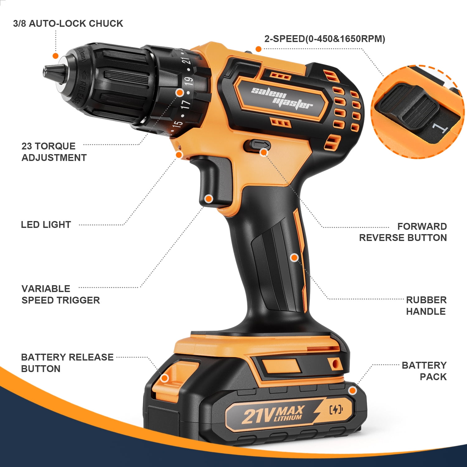 High Performance: SALEM MASTER Cordless Drill Driver equipped with 3 in 1 functions, has more efficient models of screwdriving, drilling and impact drilling. 2 variable speeds( 0-450 & 0-1650 RPM) for a range of drilling holes and driving screws on wood, aluminum, metal and plastic. Max torque 29N.M(350in-lb), and 23+1 positions torque make it be a powerful all-round helper for matching your desires, perfect for professional and DIYers. 3/8 Keyless Auto Chuck: The 3/8’’ all metal keyless chuck delivers an automatic spindle lock with the maximum durability and great accessory compatibility. The forward/reverse switch and variable speed trigger are available for drilling and fastening. Max drilling capacity: wood 28mm, aluminum 12mm and steel 12mm. Built-in LED & 2 Pack Batteries: The cordless drill driver is equipped with LED light for illumination and extra security when you work in dark areas, more convenient and safer. 2-pack lithium-ion batteries deliver you a continue work. Compact & Ergonomic: This cordless drill driver designed with no-slip rubber-covered handle with ergonomic design delivers the maximum comfortable grip for being breezily operated in one hand and less vibration. Only weighs 2.7lbs equipped with one battery, lightweight and compact design makes it easy to be used to some tight areas. Variable Speed Forward/Reverse Button Max Torque 29N.M/257In-lbs 23+1 Positions Clutch 3/8” Auto-lock Chuck Dual Front LED Light Supports Dark Corner Operation LCD Indicator Delivers to Show Battery Capacity Support Narrow Space Work and Multi Applications Comfort Non-slip Rubberized Handle 2-Pack Rechargeable 21V 1.3Ah Lithium-Ion Battery 15pcs Accessories (10 pcs Screwdriver Bits, 3 pcs Drill Bits, 1 pcs Universal Soft Shaft, 1 pcs Bit Converter) Easy Carrying Bag Faster Charging Drill Capacity: Steel 12mm / Wood 28mm / Aluminum 12mm