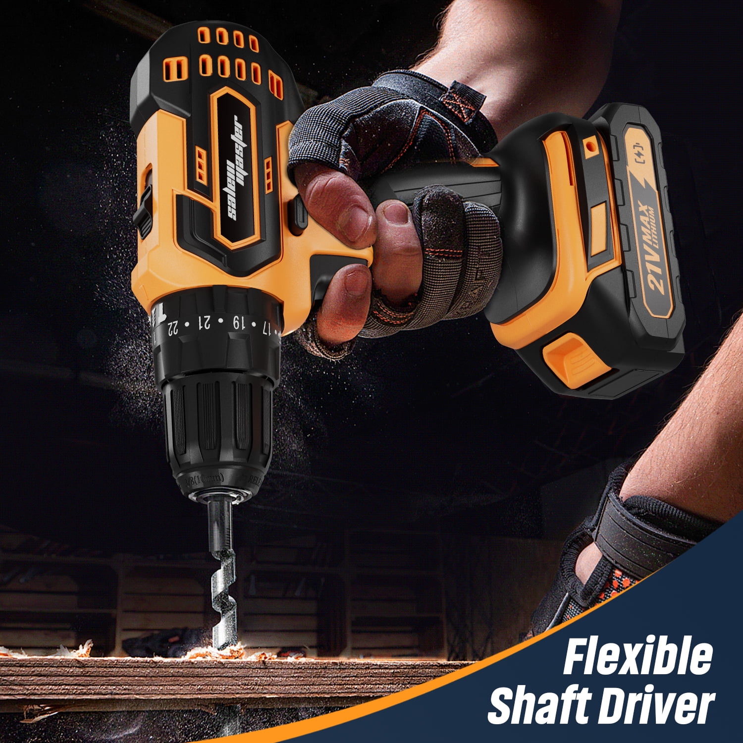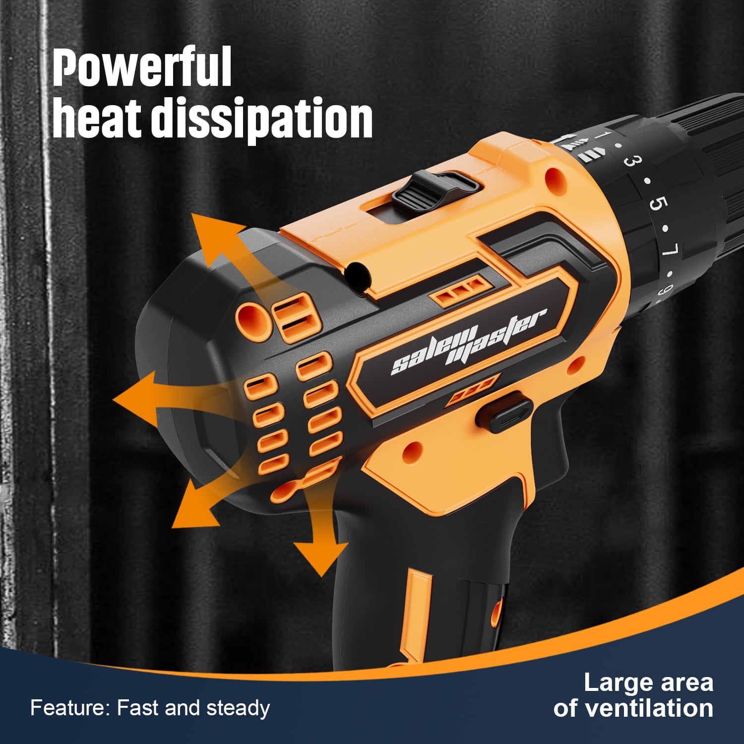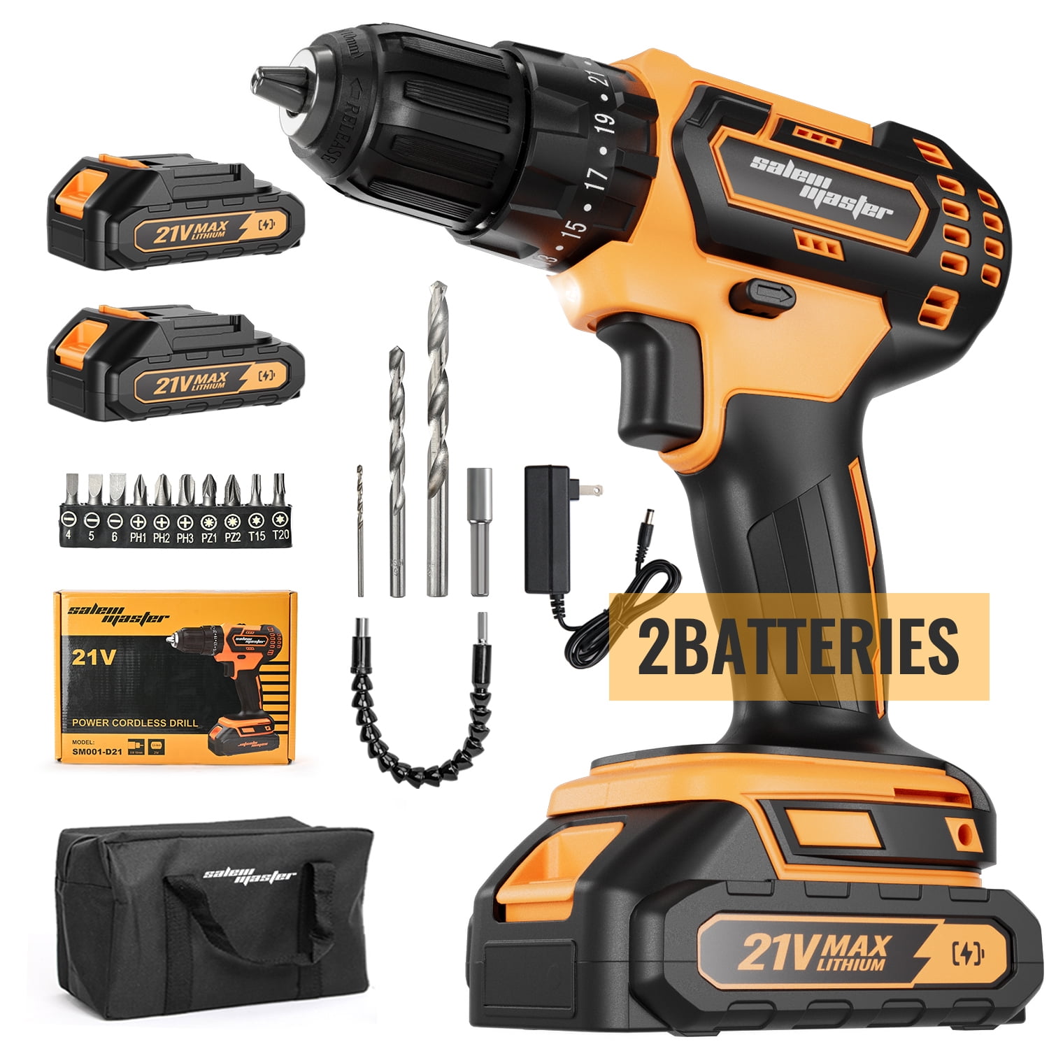 High Performance: SALEM MASTER Cordless Drill Driver equipped with 3 in 1 functions, has more efficient models of screwdriving, drilling and impact drilling. 2 variable speeds( 0-450 & 0-1650 RPM) for a range of drilling holes and driving screws on wood, aluminum, metal and plastic. Max torque 29N.M(350in-lb), and 23+1 positions torque make it be a powerful all-round helper for matching your desires, perfect for professional and DIYers. 3/8 Keyless Auto Chuck: The 3/8’’ all metal keyless chuck delivers an automatic spindle lock with the maximum durability and great accessory compatibility. The forward/reverse switch and variable speed trigger are available for drilling and fastening. Max drilling capacity: wood 28mm, aluminum 12mm and steel 12mm. Built-in LED & 2 Pack Batteries: The cordless drill driver is equipped with LED light for illumination and extra security when you work in dark areas, more convenient and safer. 2-pack lithium-ion batteries deliver you a continue work. Compact & Ergonomic: This cordless drill driver designed with no-slip rubber-covered handle with ergonomic design delivers the maximum comfortable grip for being breezily operated in one hand and less vibration. Only weighs 2.7lbs equipped with one battery, lightweight and compact design makes it easy to be used to some tight areas. Variable Speed Forward/Reverse Button Max Torque 29N.M/257In-lbs 23+1 Positions Clutch 3/8” Auto-lock Chuck Dual Front LED Light Supports Dark Corner Operation LCD Indicator Delivers to Show Battery Capacity Support Narrow Space Work and Multi Applications Comfort Non-slip Rubberized Handle 2-Pack Rechargeable 21V 1.3Ah Lithium-Ion Battery 15pcs Accessories (10 pcs Screwdriver Bits, 3 pcs Drill Bits, 1 pcs Universal Soft Shaft, 1 pcs Bit Converter) Easy Carrying Bag Faster Charging Drill Capacity: Steel 12mm / Wood 28mm / Aluminum 12mm