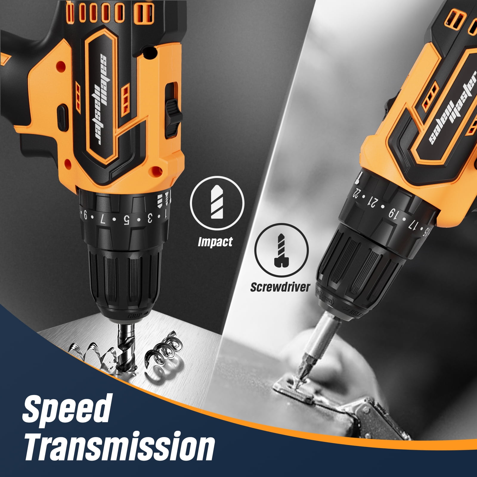 SALEM MASTER Drill tool set is designed with an all-copper double bearing gear motor. The upgraded copper motor produces provides a strong load capacity, No-load speed 19000-23000rpm. SALEM MASTER Cordless Screwdriver/Drill is a handy compact tool for Home Improvement and DIY projects. This tool is designed with an all-copper double bearing gear motor. The upgraded copper motor produces provides a strong load capacity, No-load speed 0-1650rpm.Whether you are a professional craftsman, a robot builder or a model building hobbyist who requires precision small tools and micro tools, SALEM MASTER tools can help you with your household working. BATTERY NOTE: Different from others, we have TWO powerful 2.0Ah Batteries. To ensure the quality and lifespan of batteries, we have conducted four tests: [Discharge, Charge, Aging, Function testing]. So there will be scratches on the surface of the battery that you received but it will not affect the function. What You Get From Us. 1-YEAR warranty + Lifetime sale-after service. If you have any questions about it, please let us know first. We promise to reply within 24 hours on working days and provide 100% satisfied service. 41pcs Accessories Package Components. Two 2000mAh Batteries and Work Light This impact cordless hammer drill comes with 2 big 2000mAh Li-ion Batteries and a fast charger that can use for strong and steady power and endurable run time. The additional battery makes the cordless screwdriver drill always ready to use without restriction. You can constantly work on your project. The lithium-ion drill driver in 21V-class with a front LED work light illuminates any dark workspace. 25+3 Clutch, 2-Variable Speed and 350In-lb Torque SALEM MASTER cordless drill/driver, with 25 adjustable clutch settings, step-less variable pressure trigger (2-speed: 0-450RPM,0-1550RPM) provide accurate control. 3 modes (Impact Hammer, Driver, Drill), 350In-lb torque(35N.M), no matter it is a household reconstruction, improvements, DIY handcrafts, renovation, garden work or auto repairs, this drilling tool is your good partner everyday drill/driver. Impact and Powerful SALEM MASTER 21V Max drill tool set is designed with all-copper double-bearing gear motor: 350In-lb torque max provides strong load capacity. No-load speed 19000-23000rpm powerful impact drill driver offers you all the daily needs even drill walls or metal and accomplish more than you ever expected. 3/8 Keyless Chuck and Forward/Reserve Control This drill bit set is easy and straightforward to use. The drill driver has a large 3/8’’(10mm) keyless chuck which provides an automatic spindle lock that enables one-hand changing with advanced accessory compatibility. The Forward/Reverse switch allows you to either screw or replaces/remove bits for your purposes as well as lock the power drill set. We offer a 2-year warranty and lifetime service. Hope you have a happy experience.