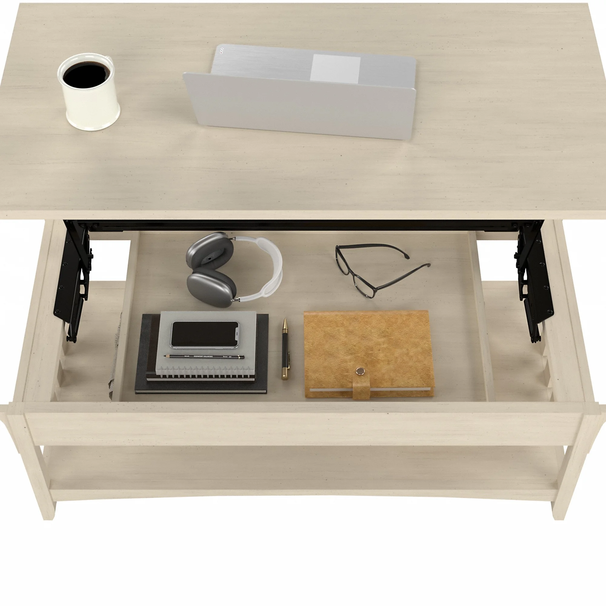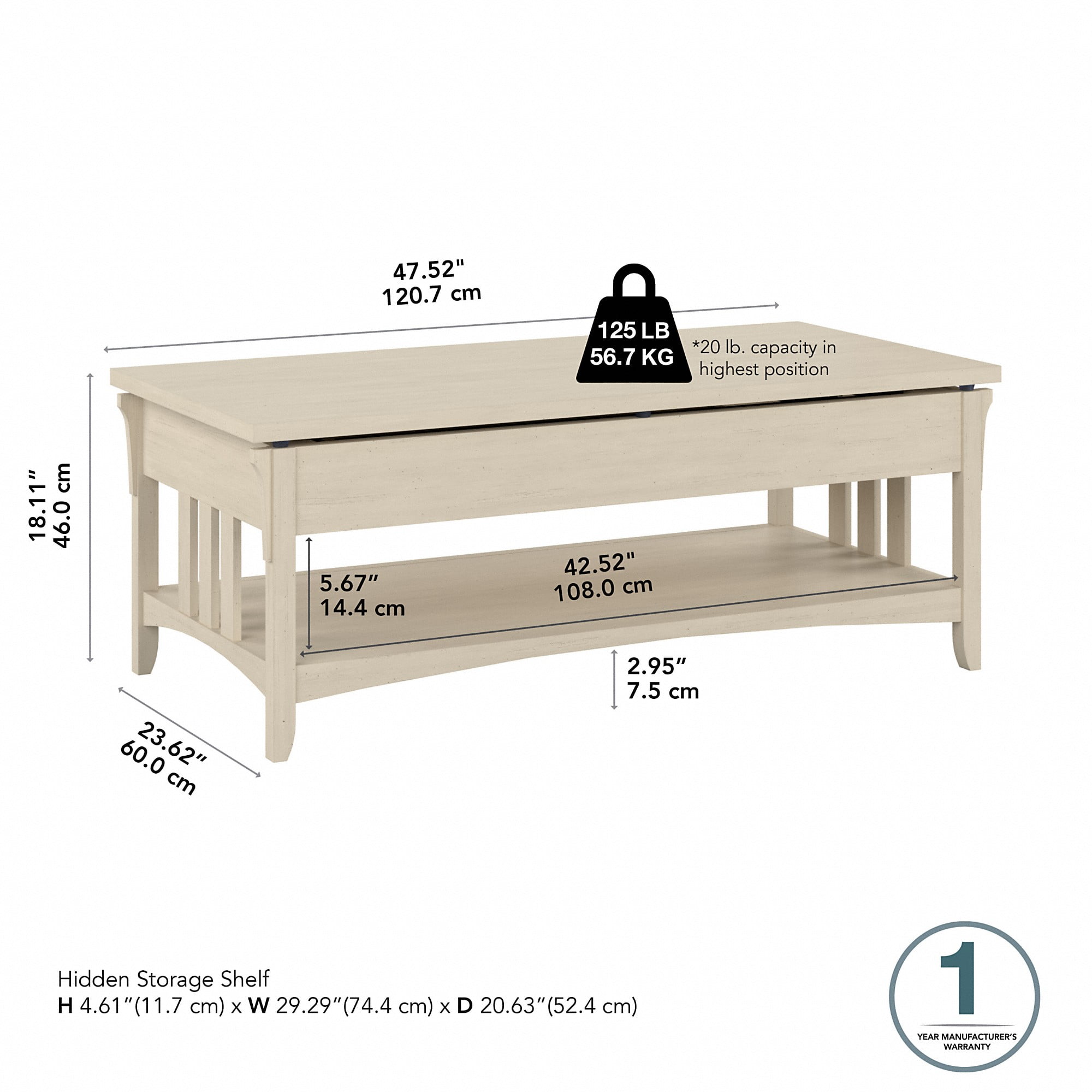 48W x 24D x 18H Lift Top Coffee Table with Storage lifts and locks at 3 different heights: 25, 28 and 30 inches from the floor Living room table reaches standard desk height, transforming your living room into a home office with optimal ergonomics Internal storage compartment inconspicuously organizes reading materials, home office supplies and living room essentials Self-closing mechanism and rubber bumper pads return the surface to its base position safely and smoothly Synchronized lift system raises the surface evenly on both sides to prevent spills and other accidents Lift Up Coffee Table Desk supports up to 125 lbs. at its standard height or 20 lbs. with the surface extended Mission-inspired styling includes tapered legs, curved base rails, decorative accents and a slightly weathered finish Bush Furniture’s commitment to safety includes rigorous testing that meets or exceeds industry standards Backed by a 1 Year Manufacturer’s Warranty Create your ideal living room set with a Salinas TV Stand, Console Table, End Tables and more (sold separately)