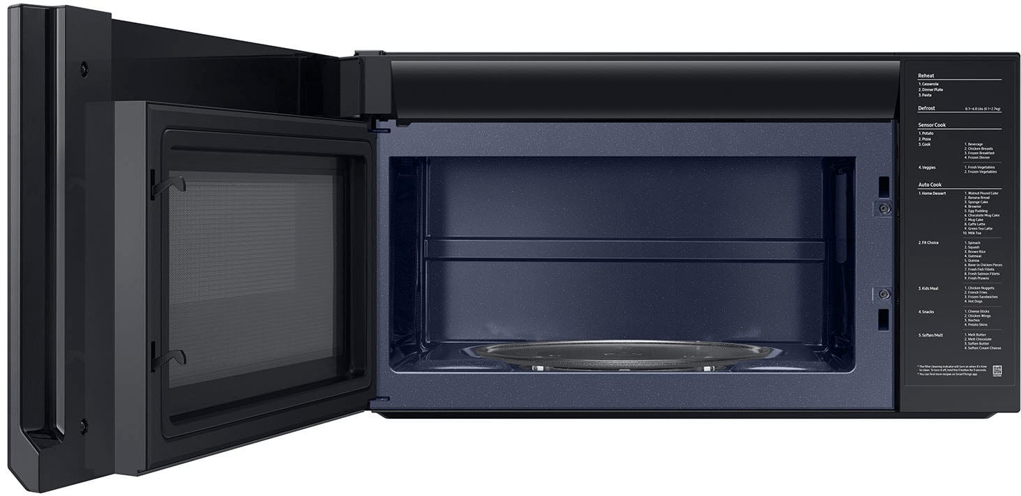 This Samsung Over-the-Range Microwave conveniently syncs with your Samsung range or cooktop so that ventilation and lighting will turn on automatically when you turn on the burners. Through the SmartThings app, you can remotely adjust ventilation speed and cooking time right from your smartphone and receive alerts when heating or cooking is finished. It also has an extra-large 2.1 cu. ft. capacity that will accommodate even your largest dishes, and glass touch controls illuminate with a simple touch and dim when not in use for a clean, seamless look.