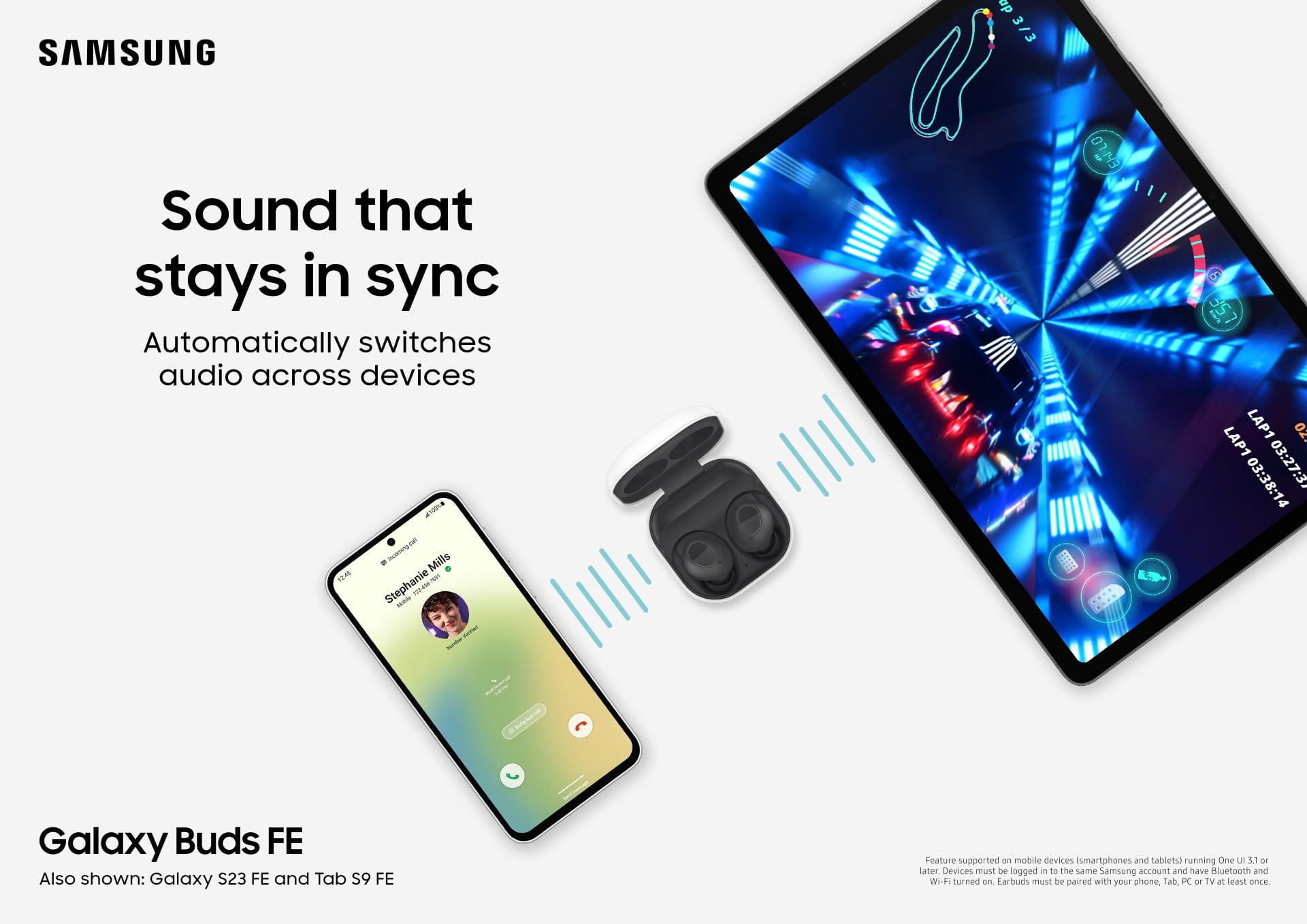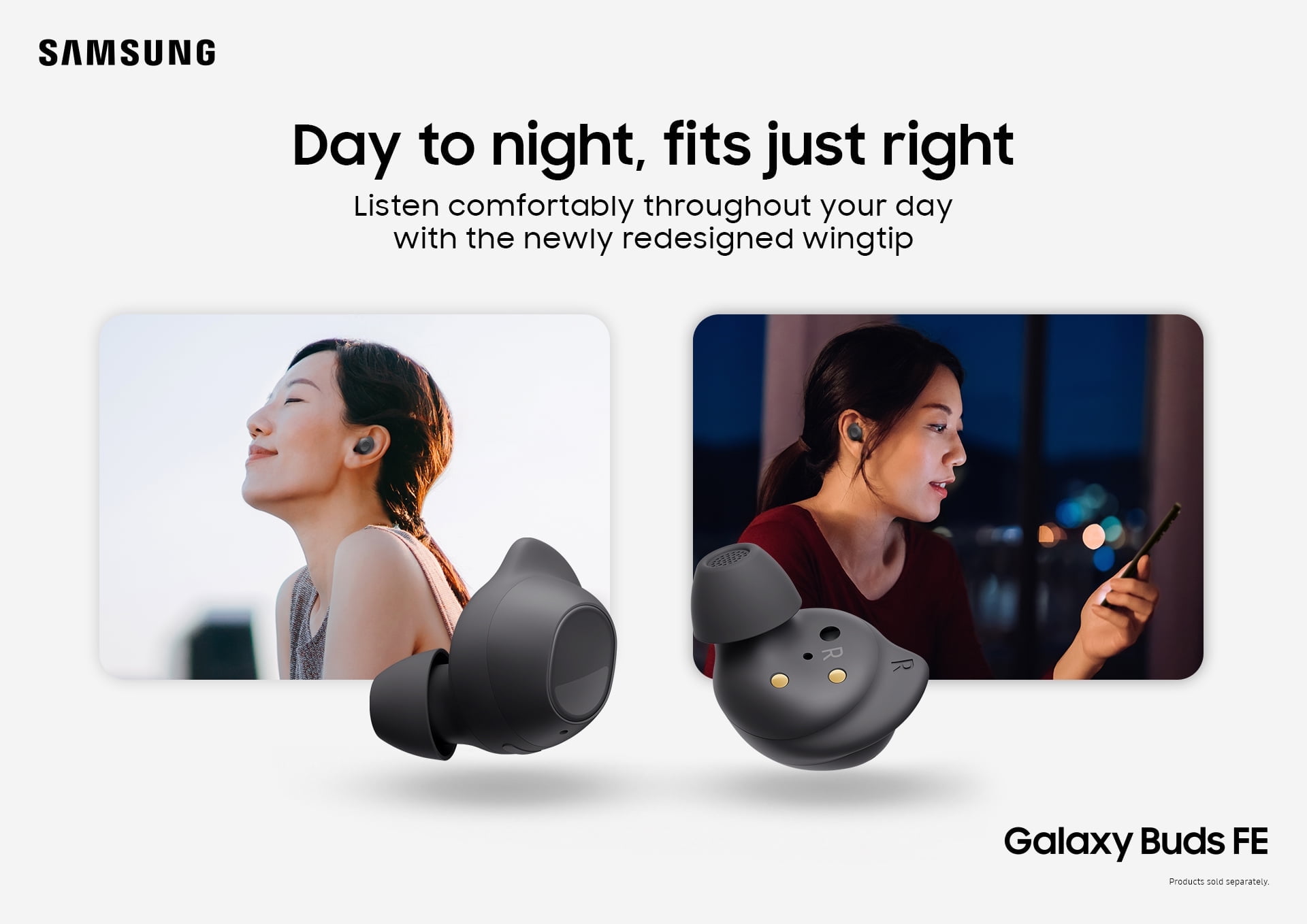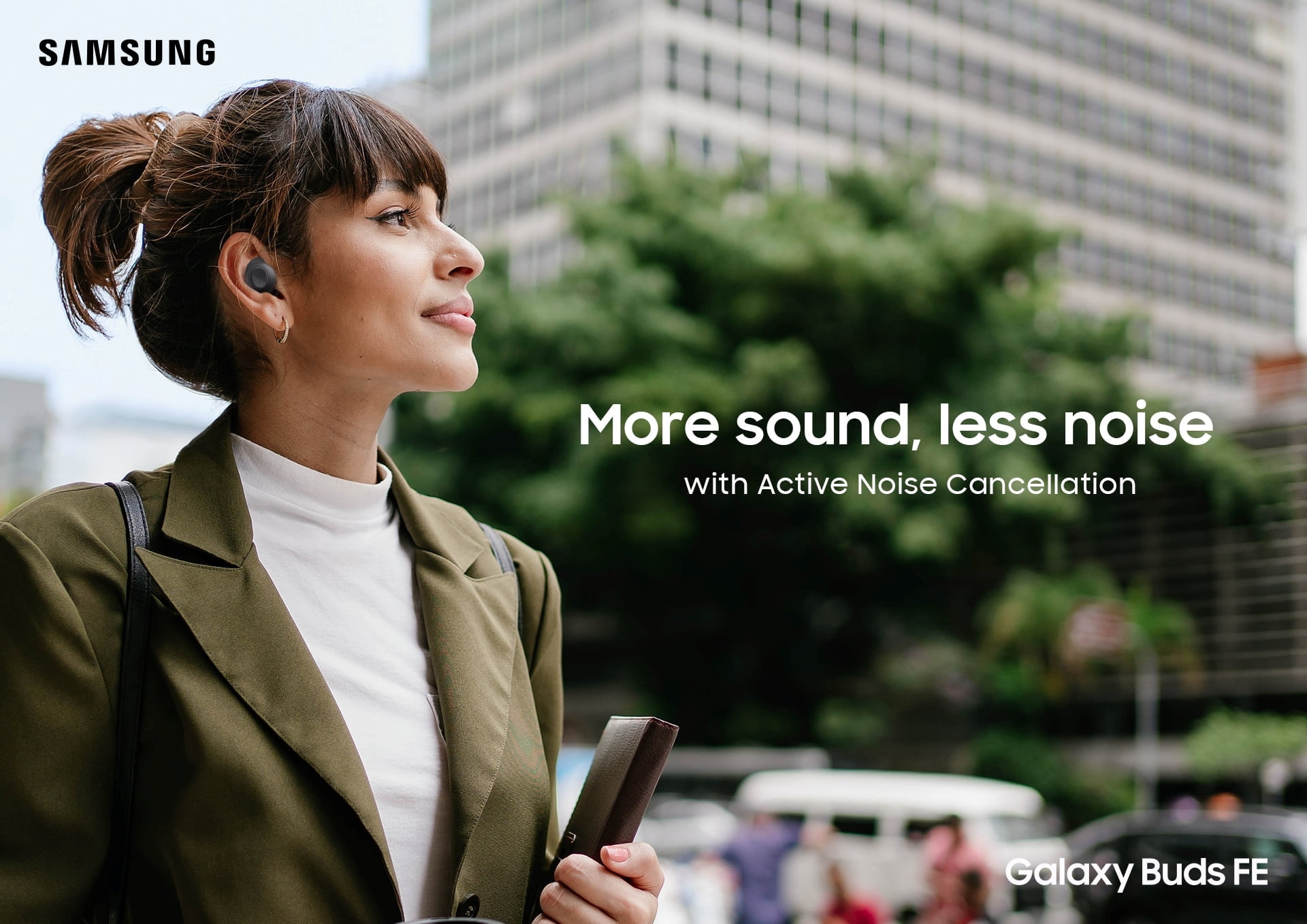 Meet Galaxy Buds FE, your new favorite everyday audio experience. Buds FE fit comfortably into your day, combining your favorite Galaxy innovations on the go. With their ear-friendly design and a variety of wingtip options, your Buds stay in place securely and comfortably — you might even forget you’re wearing them. Lose yourself in the sounds you love with Active Noise Cancellation and Ambient Sound. Plus, Buds FE connect seamlessly with your Galaxy devices — get ready for effortless pairing from your phone to your Tab to your laptop. It’s easy to keep up with Buds FE too. Get a notification if you leave a Bud behind, and locate it easily with SmartThings Find.* Enjoy your favorite audio experiences throughout your day with Galaxy Buds FE. Now you can hear translations through your Buds while on calls or during face-to-face conversations.*