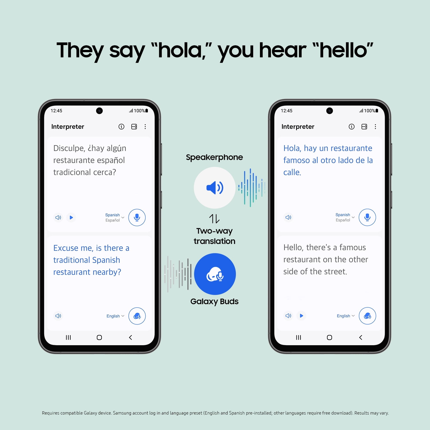 From phone to ear, translations you can hear. They say “hola,” you hear “hello”. Designed for comfort. Shaped to fit. Hear what you want, not what you don’t. Pairs easily with your Galaxy. Audio that switches automatically. Easily control with a tap. No Buds left behind. Need help? Talk to your Buds. *LEGAL: Requires compatible Galaxy device. Samsung account log in and language preset (English and Spanish pre-installed; other languages require free download). Results may vary. Requires initial pairing with Samsung Galaxy Smartphone running Android 8.0 and One UI 4.0 or later with 1.5GB RAM or above; must opt-in to SmartThings Find and be logged into your Samsung Account. Feature only supported on mobile devices running One UI 1.0 or later and Galaxy Book Series PCs launched 2020 or later. Feature supported on mobile devices (smartphones and tablets) running One UI 3.1 or later, Galaxy Book Series PCs launched 2020 or later and TV models launched 2022 or later. Devices must be logged in to the same Samsung account and have Bluetooth and Wi-Fi turned on. Earbuds must be paired with your phone, Tab, PC or TV at least once. Requires Buds FE Owner and Finder to have a Samsung Galaxy Smartphone running Android 8.0 and One UI 4.0 or later with 1.5GB RAM or above. Owner must opt-in to SmartThings Find and pre-register email and message in the SmartThings app; information will be sent to Finder via web link when pairing Buds FE to their device. Requires a Galaxy smartphone or tablet with Bluetooth connection that supports Bixby and a data or network connection.