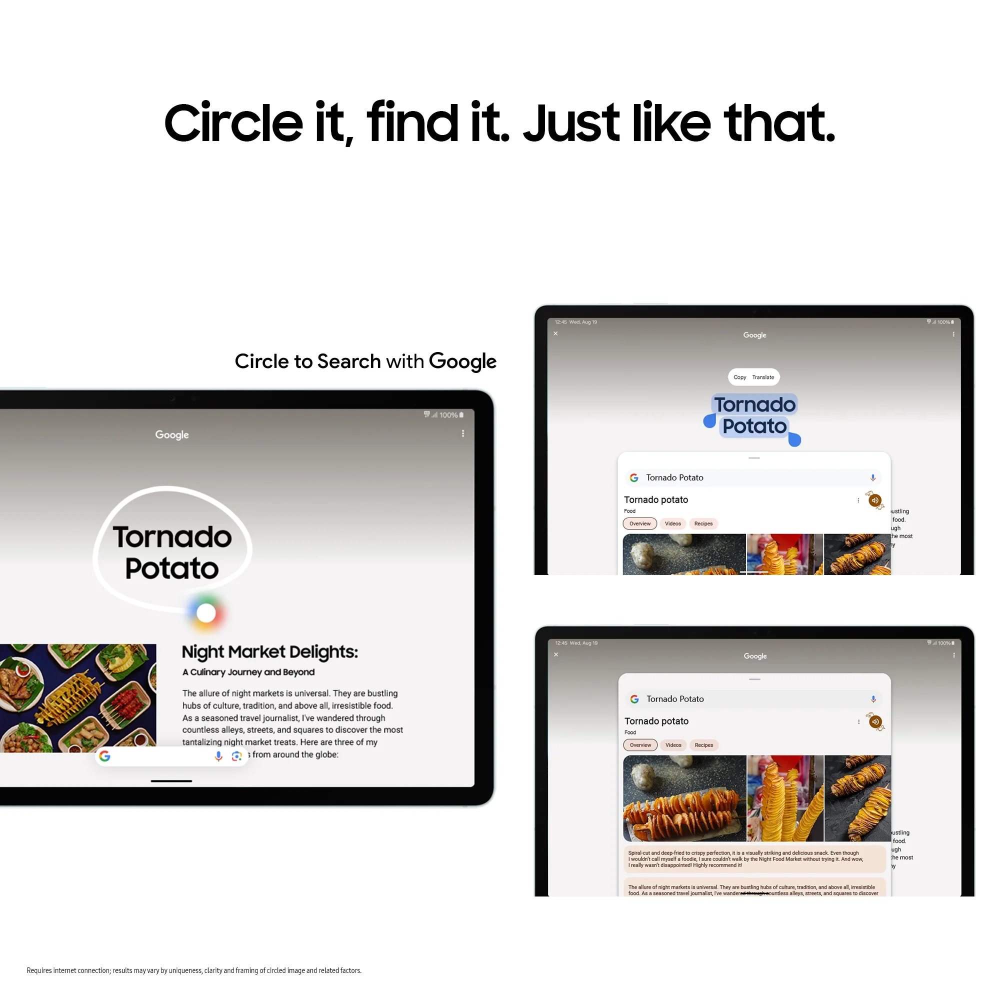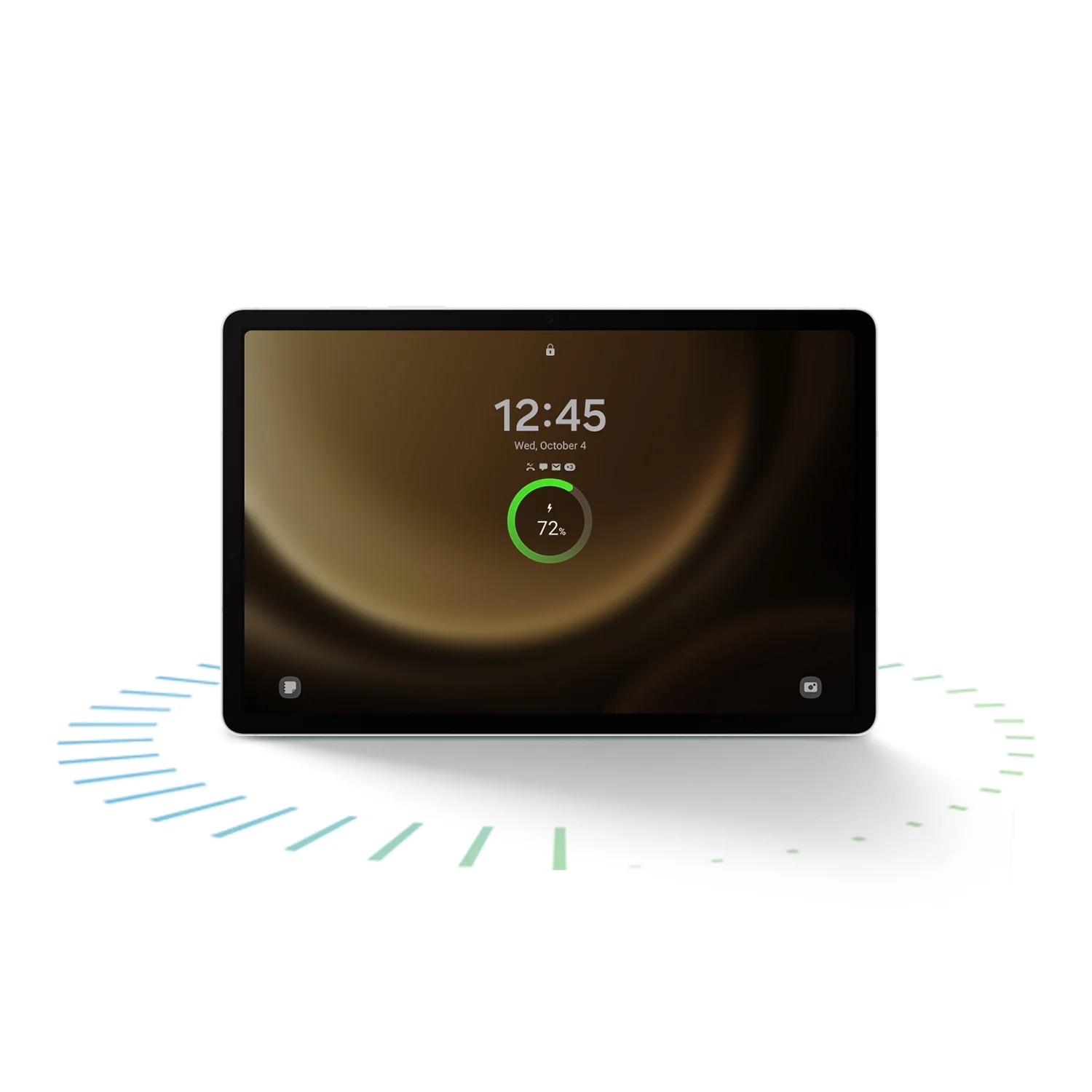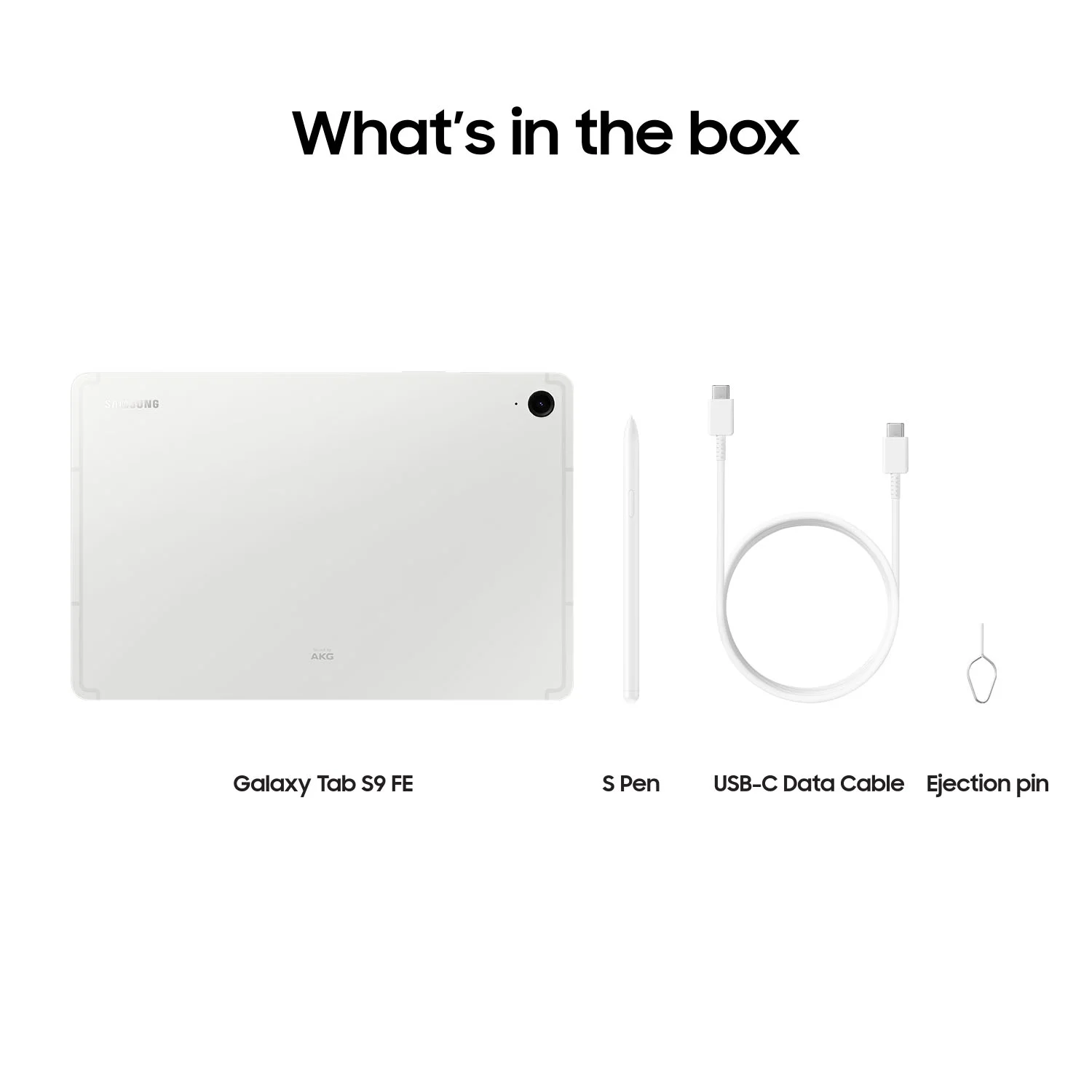 A SCREEN FOR ALL YOUR ADVENTURES. Start every adventure with a large, beautiful 10.9″ screen.* Whether you’re a multitasker, a gamer or a devoted movie watcher, you’ll feel closer to the action. Plus, dual speakers make everything sound amazing. BUILT FOR ADVENTURE. Take on the world from anywhere an IP68 rating makes Galaxy Tab S9 FE one of the only water-and dust-resistant* tablets on the market. It’s built to last wherever you use it, making it a great choice for first-time tablet buyers. A BATTERY THAT KEEPS YOU IN CHARGE. With a tablet this powerful, portable and fun, you’ll never want to put it down. Go up to 18 hours* with a long-lasting battery. Need energy quick? Get a full charge in less than an hour and a half with Super Fast Charging.* POWER FOR ADVENTURE. Have plenty of power to get things done. The latest Exynos chipset lets you own the day and stay in touch. Cross off your to-do list. Video chat with your college roomie from a thousand miles away. Or team-up with friends to go further than ever before in your favorite game. Whatever you’re doing, Galaxy Tab S9 FE makes for rich experiences. SMART TECH, BEAUTIFULLY MADE. Do it all in style. With four inspiring colors to choose from, Galaxy Tab S9 FE complements your personality perfectly. Plus, with a refined design that’s sleek and lightweight, you’ll be able to show off your great taste anywhere you use your Tab. PEN-POINT PRECISION. There’s virtually no limit to what you can do with S Pen. Write notes by hand. Draw a comic strip. Mark up a document. S Pen features a responsive design that feels like you’re writing on actual paper so nothing gets in your way when your imagination is flowing. STORAGE FOR ALL YOUR ADVENTURES. Life’s an adventure, so keep track of your favorite moments with up to 256GB* of storage. That’s plenty of space for your favorite social apps, music and videos with your friends. Need even more room? Add up to 1TB more with a microSD card.* CAMERAS BUILT FOR VIDEO CHAT. Collaborate effortlessly with a camera that automatically adjusts to keep the focus on you. Plus, with a large display that can open up to three apps at once, you can multitask while you video chat. Productivity never looked so good.* FILE SHARING MADE EASY. Sending and receiving files is so easy with Quick Share.1 From selfie videos to large work files, transfer to and from your Galaxy Tab S9 FE in a snap — it even works when sending to non-Galaxy devices. *LEGAL: Measured diagonally, the Galaxy Tab S9 FE screen size is 10.9″ in the full rectangle and 10.8″ accounting for the rounded corners. Actual viewable area is less due to the rounded corners. Compared to Galaxy Tab S7 FE. Consistent with IP68 rating, water resistant in up to 5 feet of water for up to 30 minutes. Rinse residue / dry after wet. Quick Share between Galaxy devices available with the following OS: smartphones and tablets with Android OS version 10.0 (Q) and One UI 2.1 or above, PCs running Windows 10 or later. Requires Samsung account and Wi-Fi and Bluetooth connection. Quick Share to iOS and Android devices available by sending shared link: individual files shared cannot exceed 3GB (for a total of 5GB per day) and link will expire after two days; requires a Samsung account and internet connection. Requires a Galaxy phone to have One UI 2.5 or later. Devices must be logged in to the same Samsung account and be on the same Wi-Fi network. Based on local, 720p resolution video playback, default video player (full screen), 162 nit brightness, earbud volume 7, Wi-Fi and mobile network off. Results vary with settings, usage and other factors. Quick Share between Galaxy devices available with the following OS: smartphones and tablets with Android OS version 10.0 (Q) and One UI 2.1 or above, PCs running Windows 10 or later. Requires Samsung account and Wi-Fi and Bluetooth connection. Quick Share to iOS and Android devices available by sending shared link: individual files shared cannot exceed 3GB (for a total of 5GB per day) and link will expire after two days; requires a Samsung account and internet connection. **Requires 45W wall charger (sold separately). Use only Samsung-approved charger and USB-C cable. To avoid injury or damage to your device, do not use incompatible, worn or damaged batteries, chargers or cables.