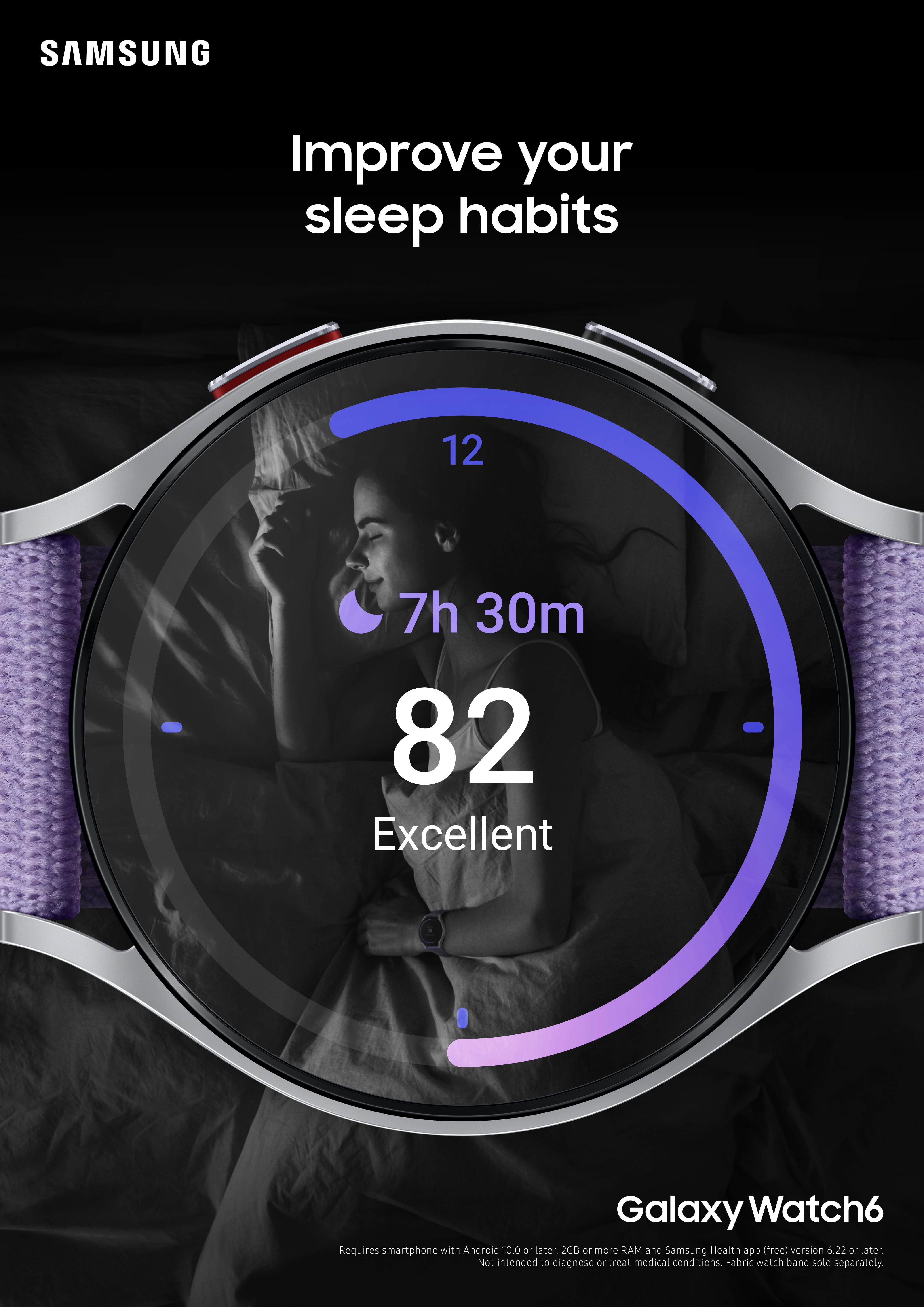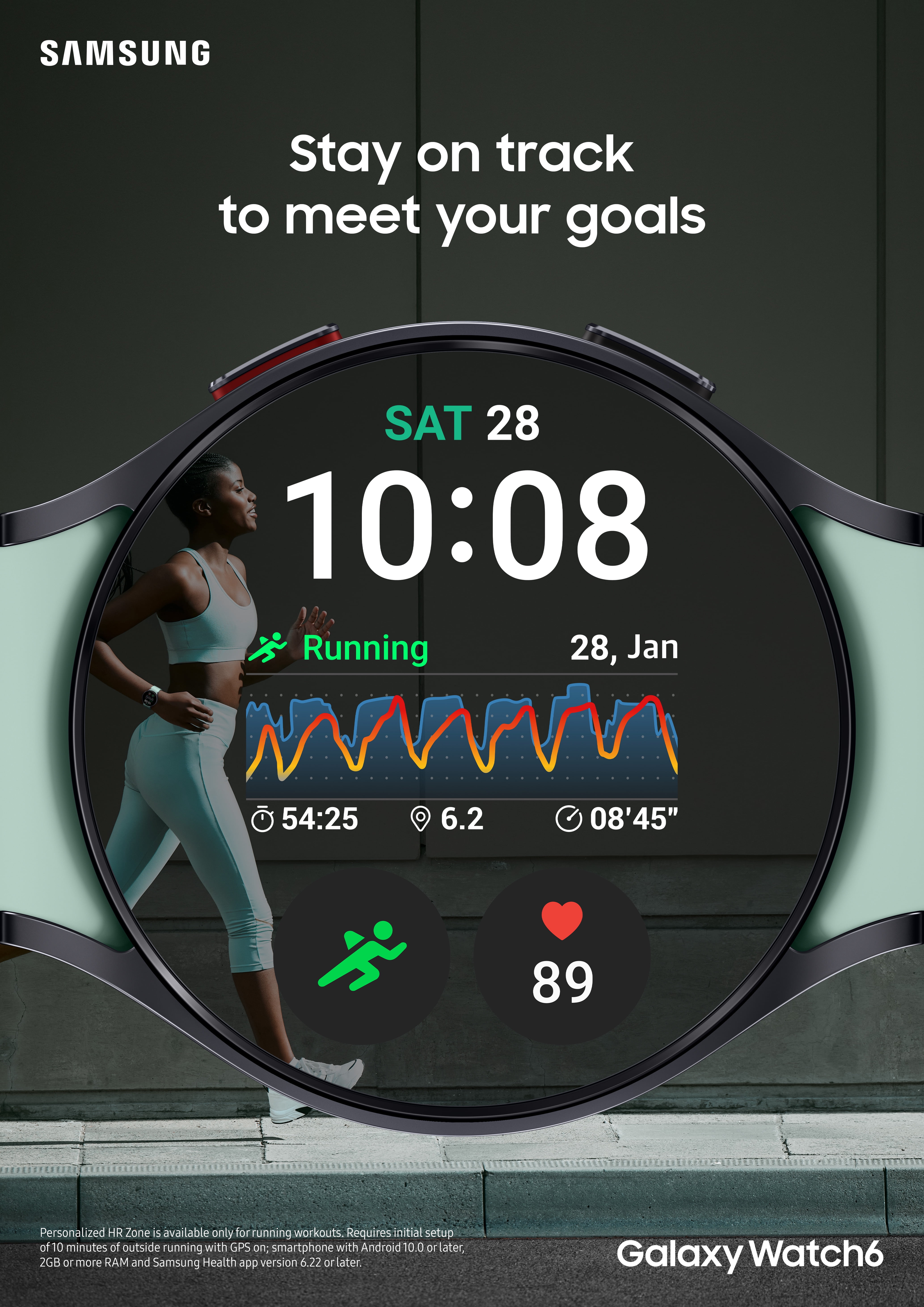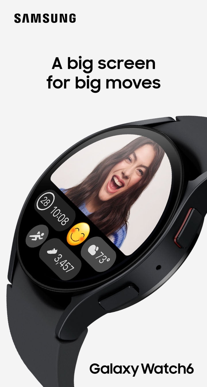Unlock your day’s full potential with Samsung Galaxy Watch6, featuring our biggest screen** and advanced wellness insights. It’s your day, own it with Samsung Galaxy Watch6. From the gym to the office, our largest screen yet** keeps you in the know with simple navigation and a super easy-to-read screen. Work out smarter with personalized heart rate zones,* and get insights for better rest with Advanced Sleep Coaching.* Stay connected by using your Watch to call, text, play music and get notifications on the go.* Plus, wherever the day takes you, own your look with a variety of customizable Watch bands* and faces.