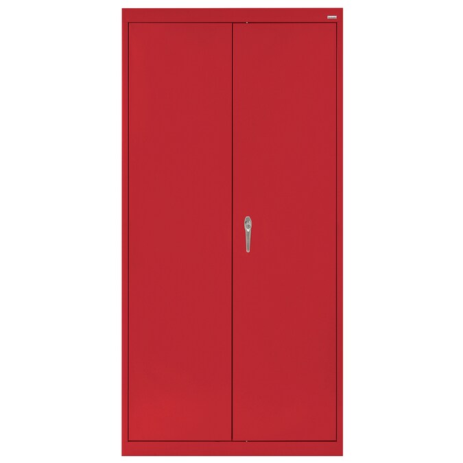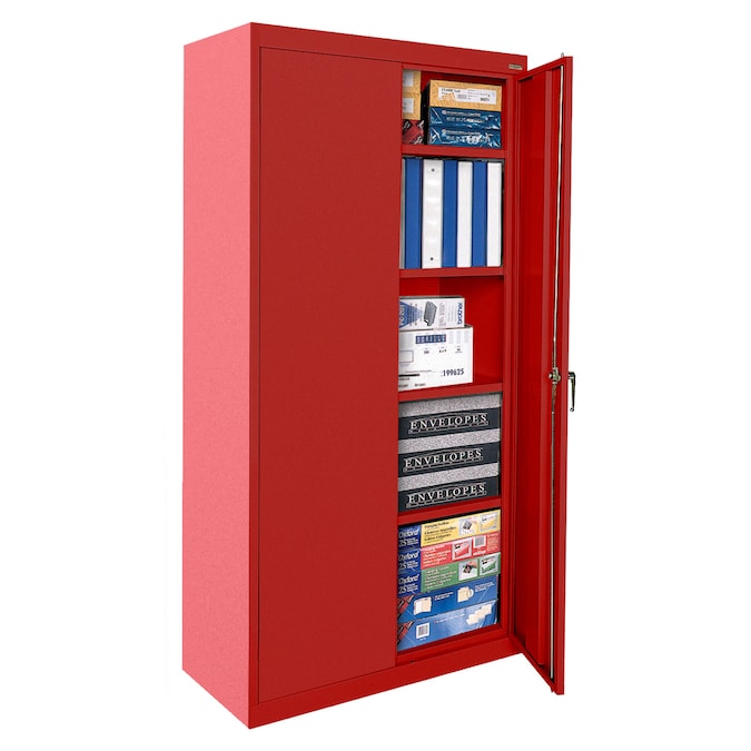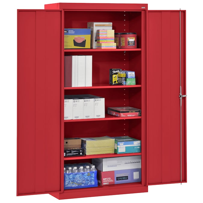 The Sandusky storage cabinet includes four fully adjustable shelves on 2 In. centers with a raised bottom shelf. Three sets of hinges per door provide strength and durability. 3-point door locking system. Welded steel construction. High-quality, durable powder coating finish. Greenguard gold certification. Meets ANSI/BIFMA furniture sustainability standards. Shipped assembled.