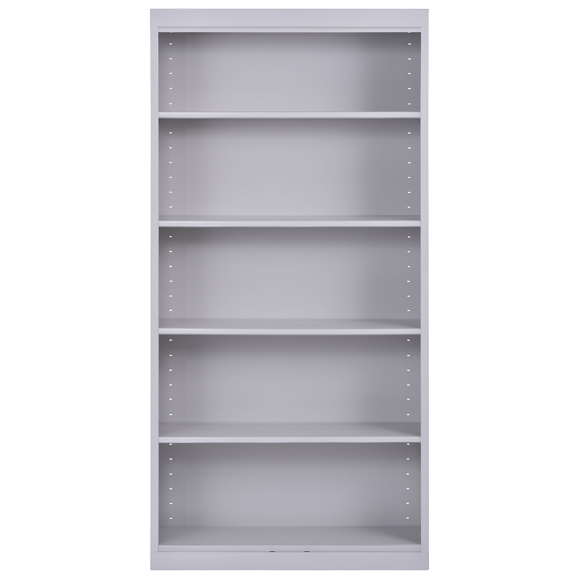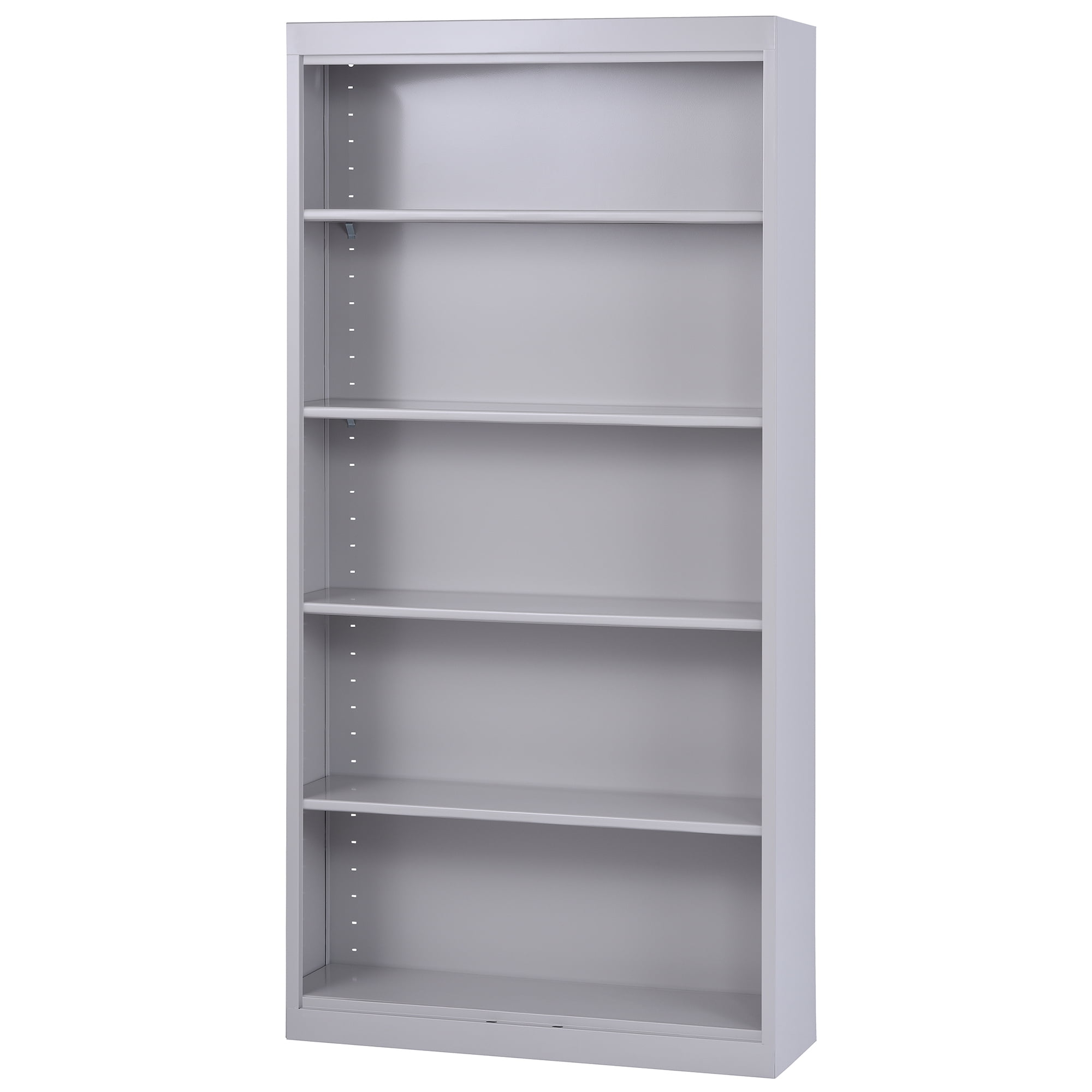 5-shelf storage bookcase with 1,000-lb. total load capacity 4 fully adjustable shelves on 1″ centers plus raised bottom shelf All welded steel construction for strength and durability Powder-coated finish resists chipping and corrosion Open face design provides full visibility of contents This metal bookshelf cabinet meets ANSI/BIFMA shelf standards Overall size: 36″W x 72″H x 12″D