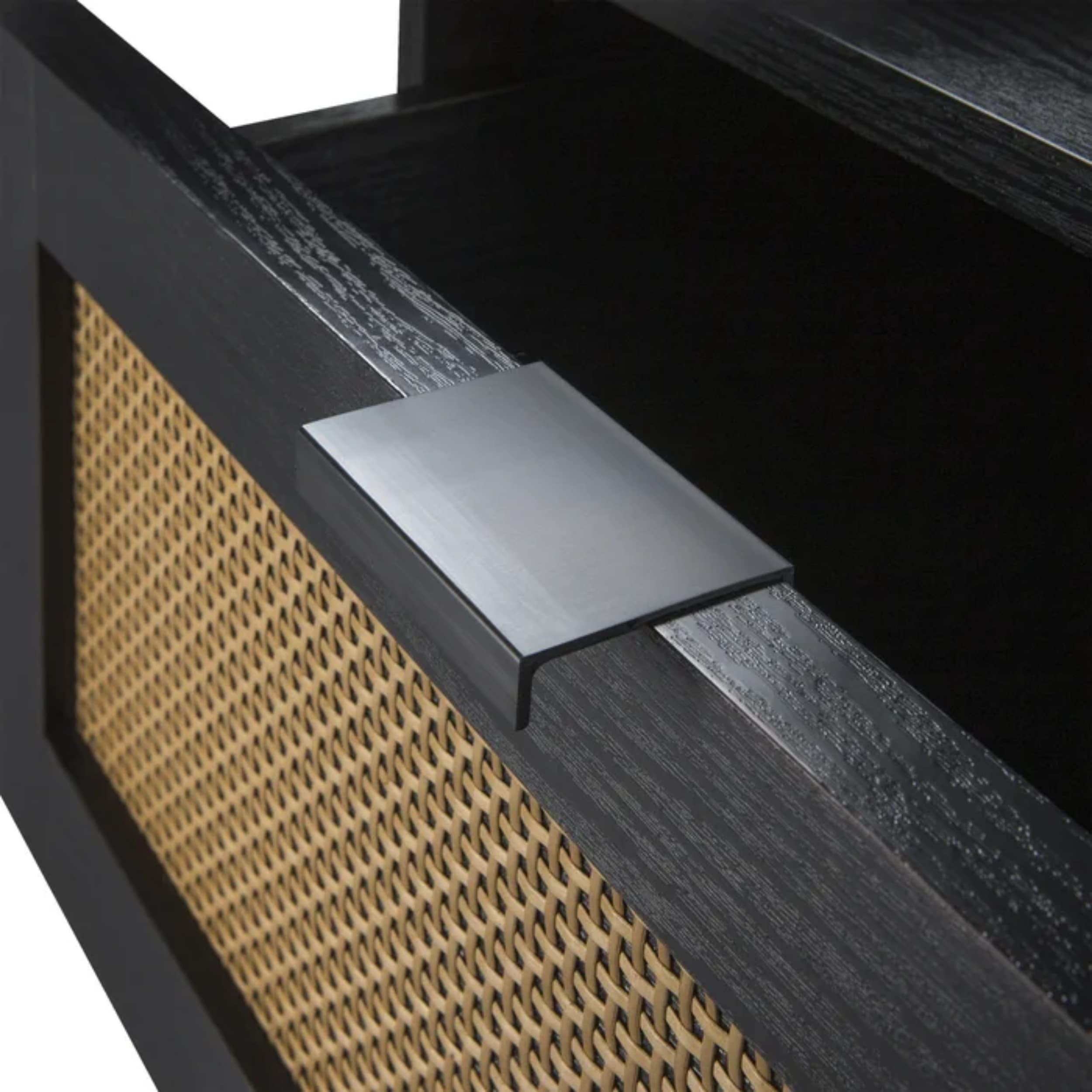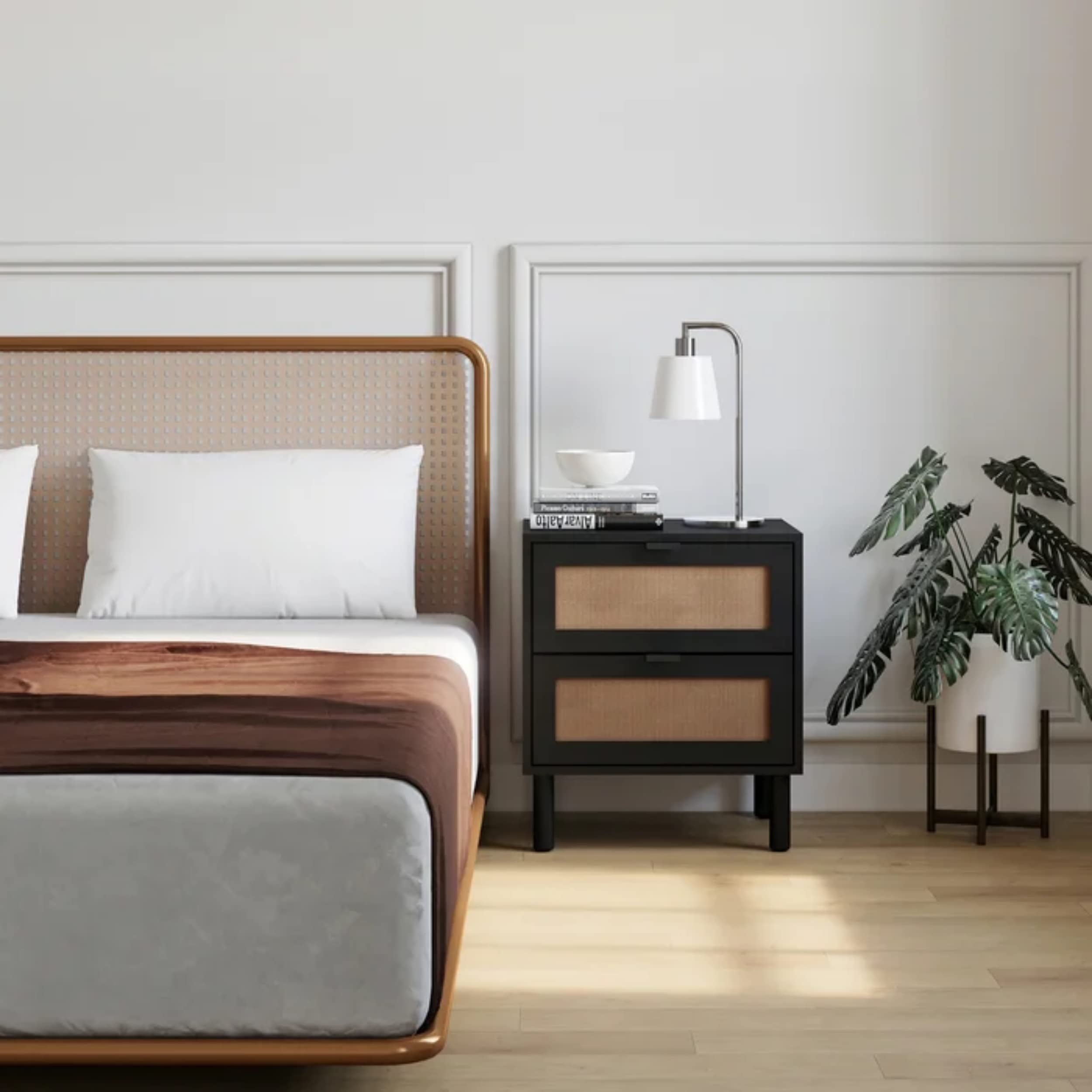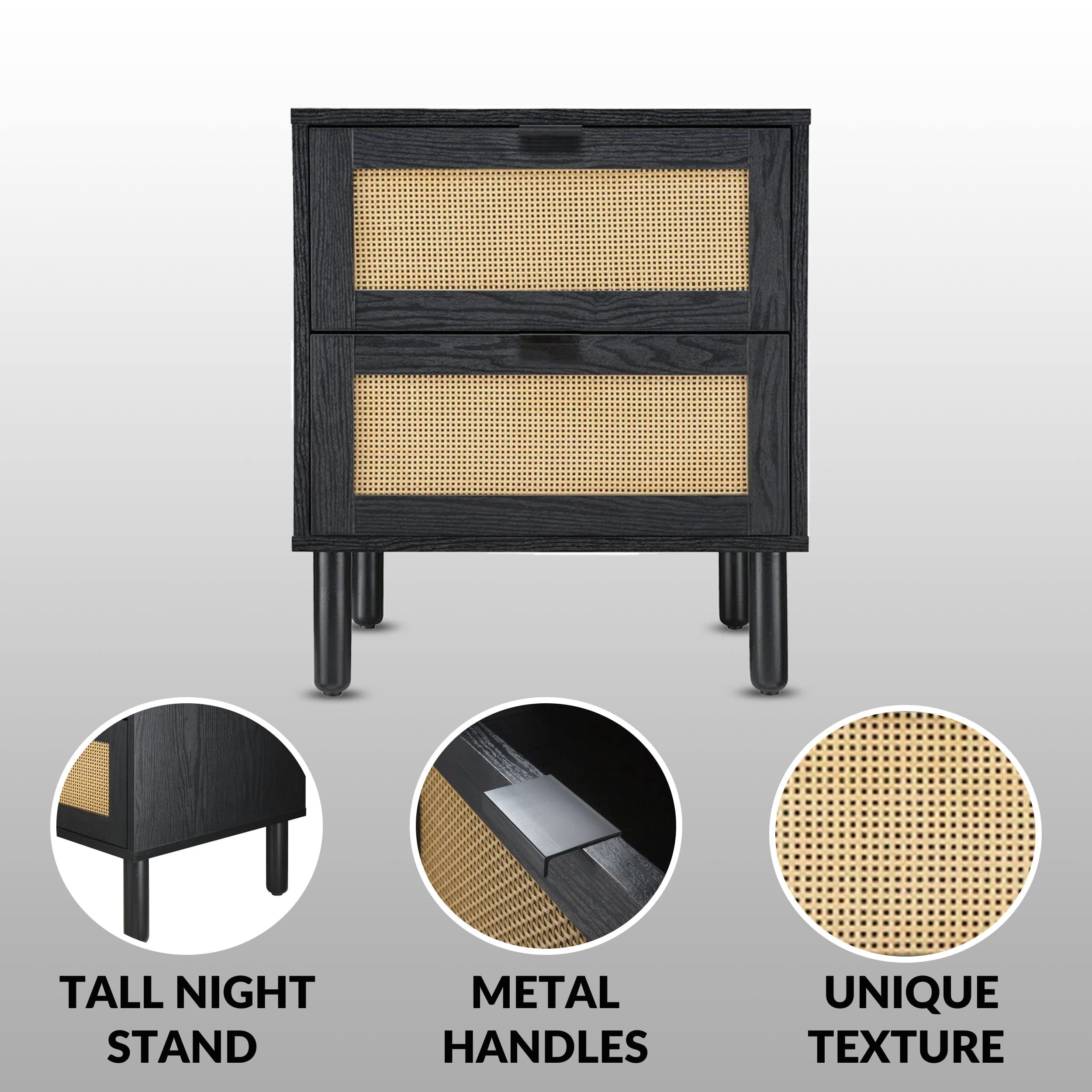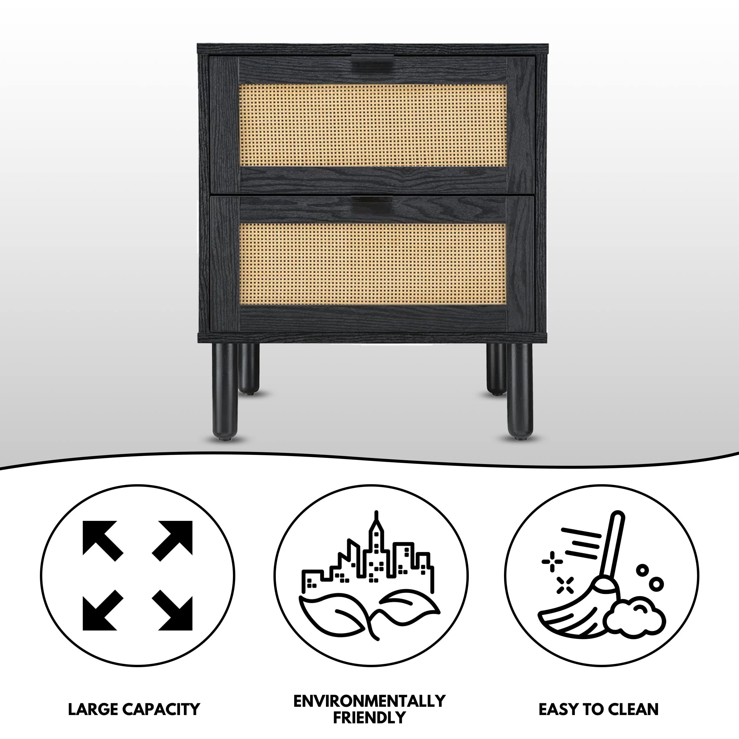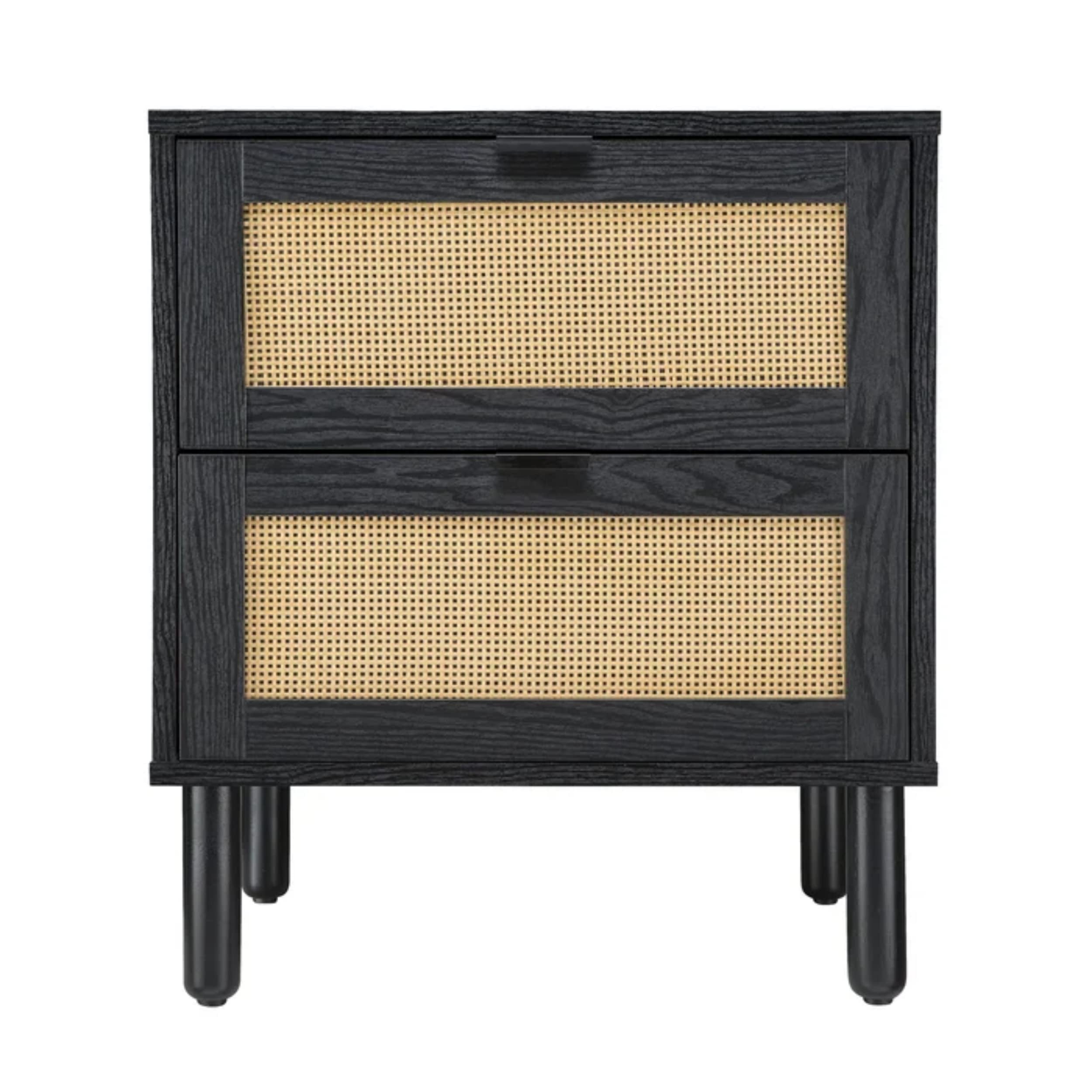 Sango Orre 2-Drawer Mid-Century Nightstand with Rattan Detail, Black/Brown