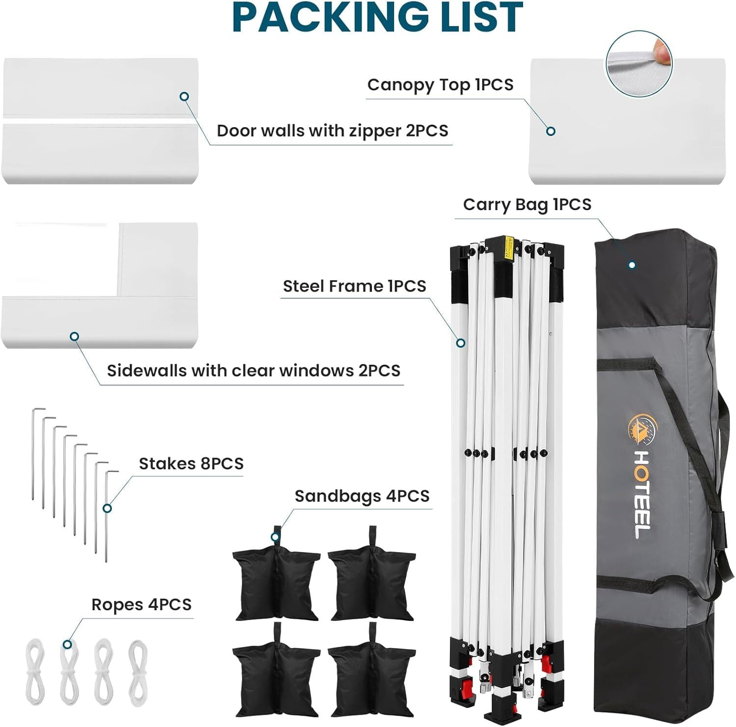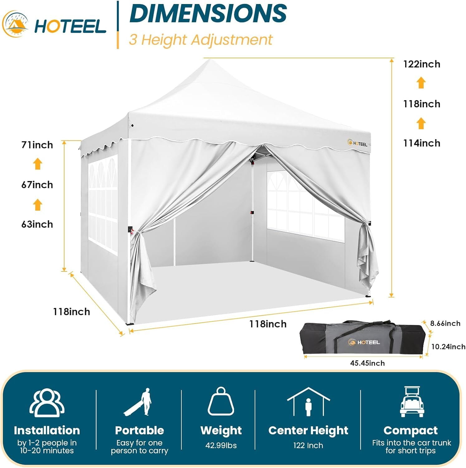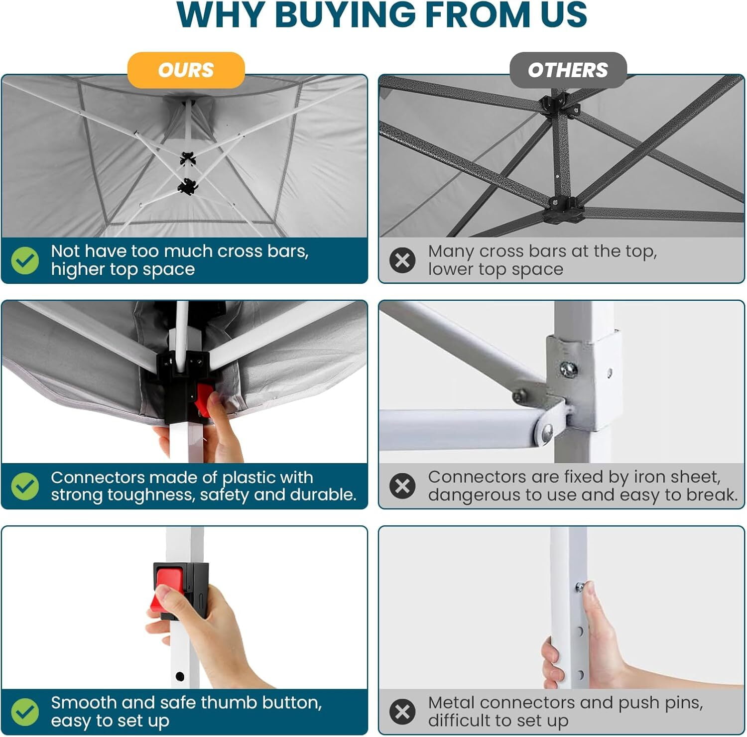 Superior Quality: 10×10 Pop up canopy features an oxford cloth top with a silver coating and a durable alloy steel frame. The silver-coated fabric reflects UV rays for sun protection and keeps the interior cooler. It’s tear-resistant and abrasion-resistant for long-term use. Water-Resistant Design:The extended ceiling and high peak design facilitate rainwater runoff, preventing pooling. Ideal for outdoor events like farmers markets and tailgating. Easy Setup and Storage:Adjustable to three heights—114 inches, 118 inches, and 122 inches—10 x 10 pop up canopy tent can be set up by 1-2 people without tools. Detailed installation videos and instructions are provided. Contact us if you encounter any issues during setup. Portable and Compact:Offering 100 square feet of shade, this 10×15 canopy can accommodate up to 10 people. When packed, it measures 45.45″ x 8.66″ x 10.24″, fitting easily in most car trunks. Package Includes:1 straight leg canopy, 4 weight bags, 4 stakes, 4 ropes, and 1 instruction manual. Compact enough for easy transport to tailgates, the beach, the park, or wherever your adventure takes you. Specification: Color: White/Blue/Black/Grey/Khaki/Deep Blue Tent frame material: powder coated steel frame, plastic Canopy material: 210D Oxford cloth Tote bag material: 300Dx600D Oxford cloth Leg tube: 30X30X0.6MM/25X25X0.6MM Top Tube: 5x 0.55mm Adjustable height: 114”-118”-122” Extended Dimensions: 10 x 10 x 10.2 feet Packing List: 1 x commercial pop up canopy frame 1 x 10×10 canopy 4 x Sidewalls 4 x oxford cloth sandbags 10 x ground spikes 4 x ropes 1 x bag with wheels 1 x manual