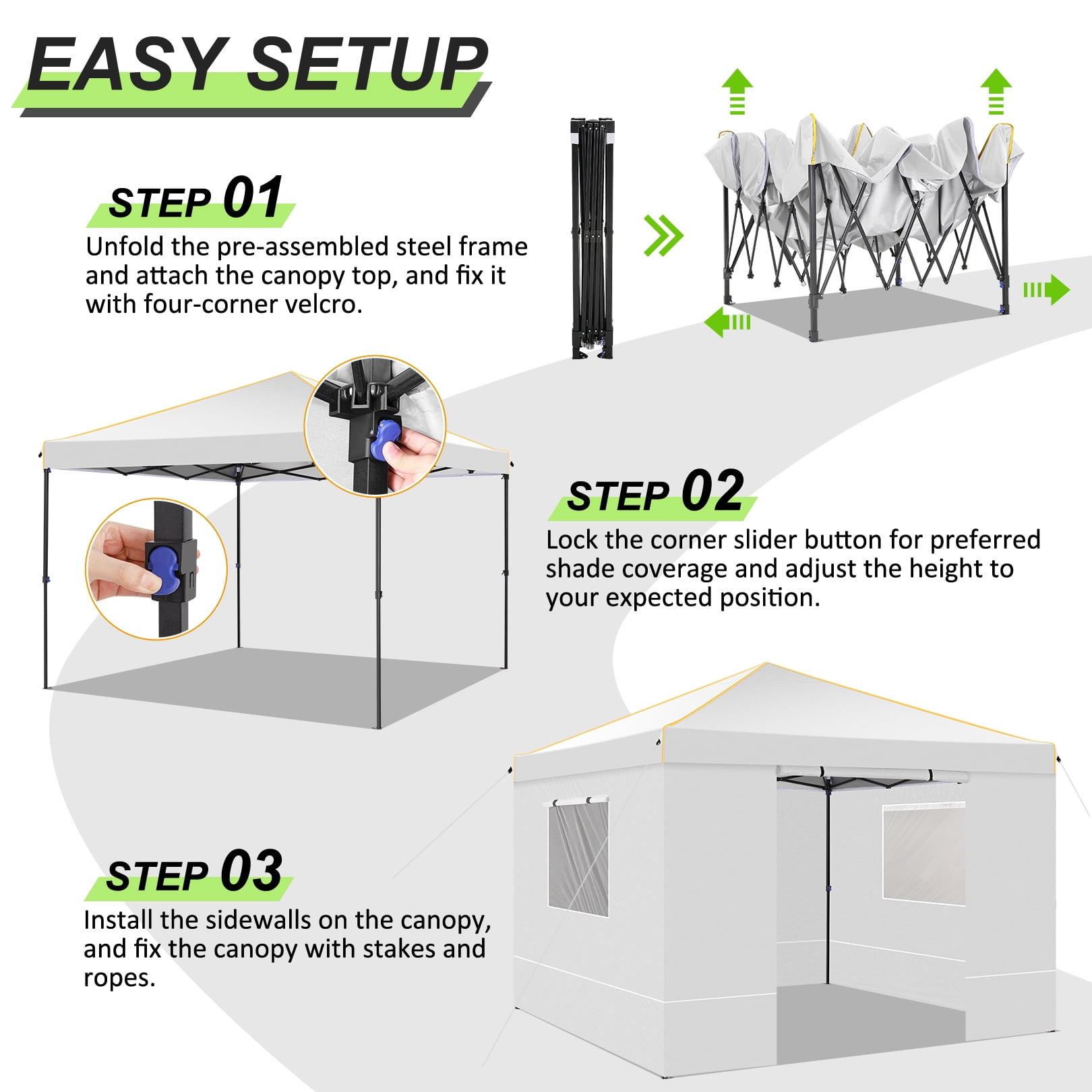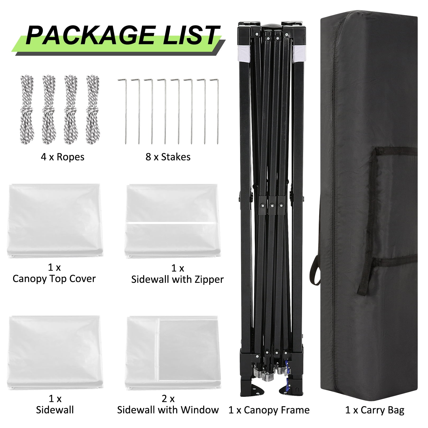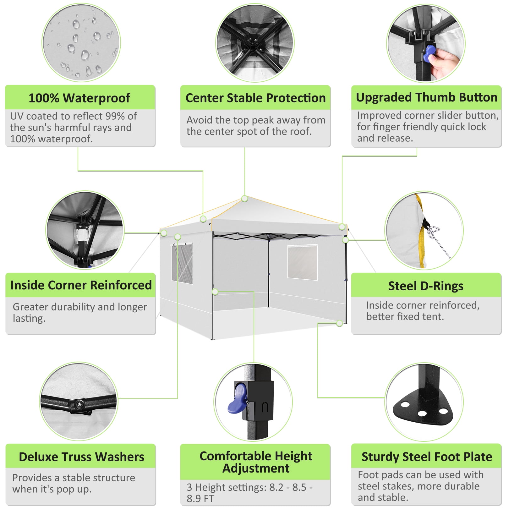 Key Features: 【Spacious Space】The straight-leg instant pop-up awning provides 10×10 feet of shade and covers a wide area. Our instant pop-up canopy holds up to 10 people, chairs, small table and more. 【4 Removable Sidewalls Design】The canopy with 2 side walls with windows and 2 side walls with zippers. The doors on the side walls can also be rolled up. They are easy to assemble or disassemble for greater versatility and ventilation. Suitable for all seasons. 【Top Canopy Material】This pop up canopy is made of 25x25mm thick steel frame with anti-rust powder coating, full truss construction. UPF 50+ UV protection and blocks 99% of harmful sunlight.Heat-sealed seam,the latest technology in the industry, prevent water penetrate from seams, 100% waterproof.The edges of the canopy are inlaid with gold decorative lines, sophisticated and elegant. 【Easy to Install and Remove】 Pop-up portable canopy tent, all parts are assembled, easy to assemble without any tools. One or two people can set it up in minutes. The gazebo tent comes with a portable carry bag that fits most cars for easy travel. 【Upgraded 3 Height Settings】3 different height settings allow you to choose the height that meets your needs. High, Medium, or Low Height Settings: 8.2′ / 7.87′ / 7.55′. Straight leg design provides 100 sq. ft. of shaded area. Specifications: Size:10 ft x 10 ft Color: Black/White/Blue/Khaki/Gray/Deep Blue Adjustable heights: Height to Top: 8.2′ / 7.87′ / 7.55′ Height to Side 6.56′ / 6.23′ /5.9′ Top Fabric: 210D Silver Coating Oxford, Waterproof, Sunshade Sidewall Fabric: 210D Oxford, waterproof Frame Material: Reinforced powder coated steel frame Specifications: Size:10 ft x 10 ft Color: Black/White/Blue/Khaki/Gray/Deep Blue Adjustable heights: Height to Top: 8.2′ / 7.87′ / 7.55′ Height to Side 6.56′ / 6.23′ /5.9′ Top Fabric: 210D Silver Coating Oxford, Waterproof, Sunshade Sidewall Fabric: 210D Oxford, waterproof Frame Material: Reinforced powder coated steel frame Packing List: 1*10 x 10 Pop Up Canopy 4*Sidewalls 1*Handbag 4*Stakes 4*Ropes