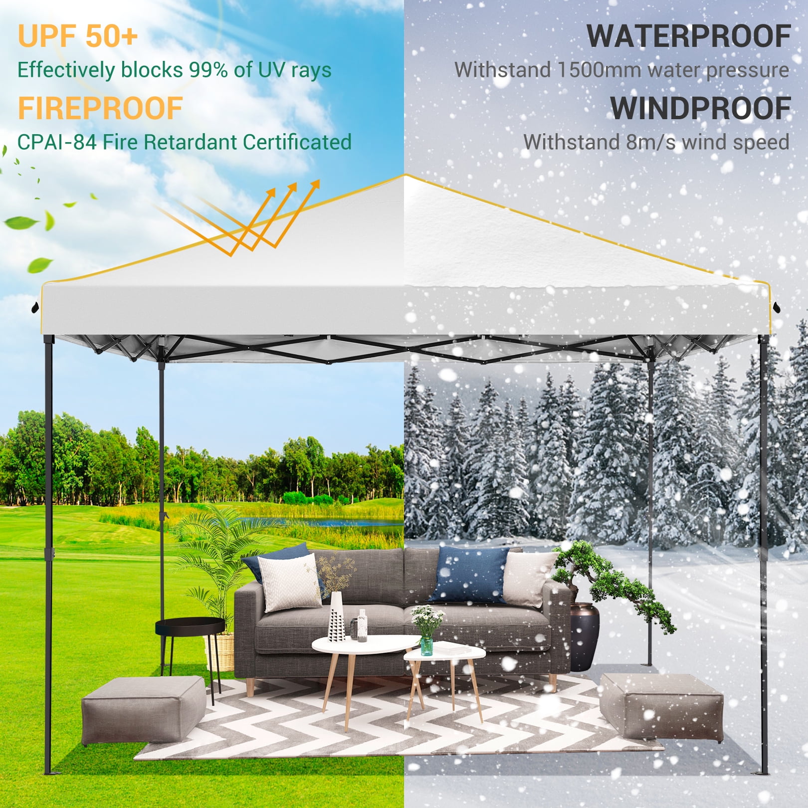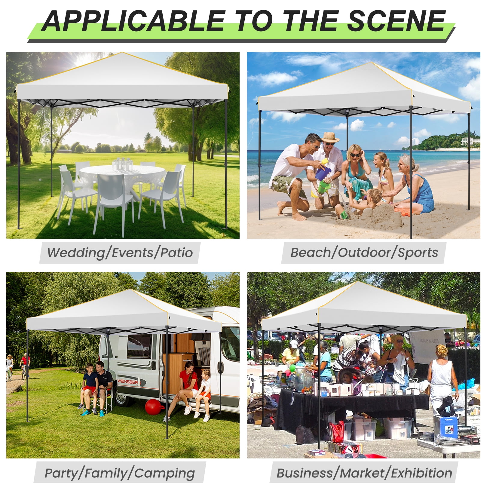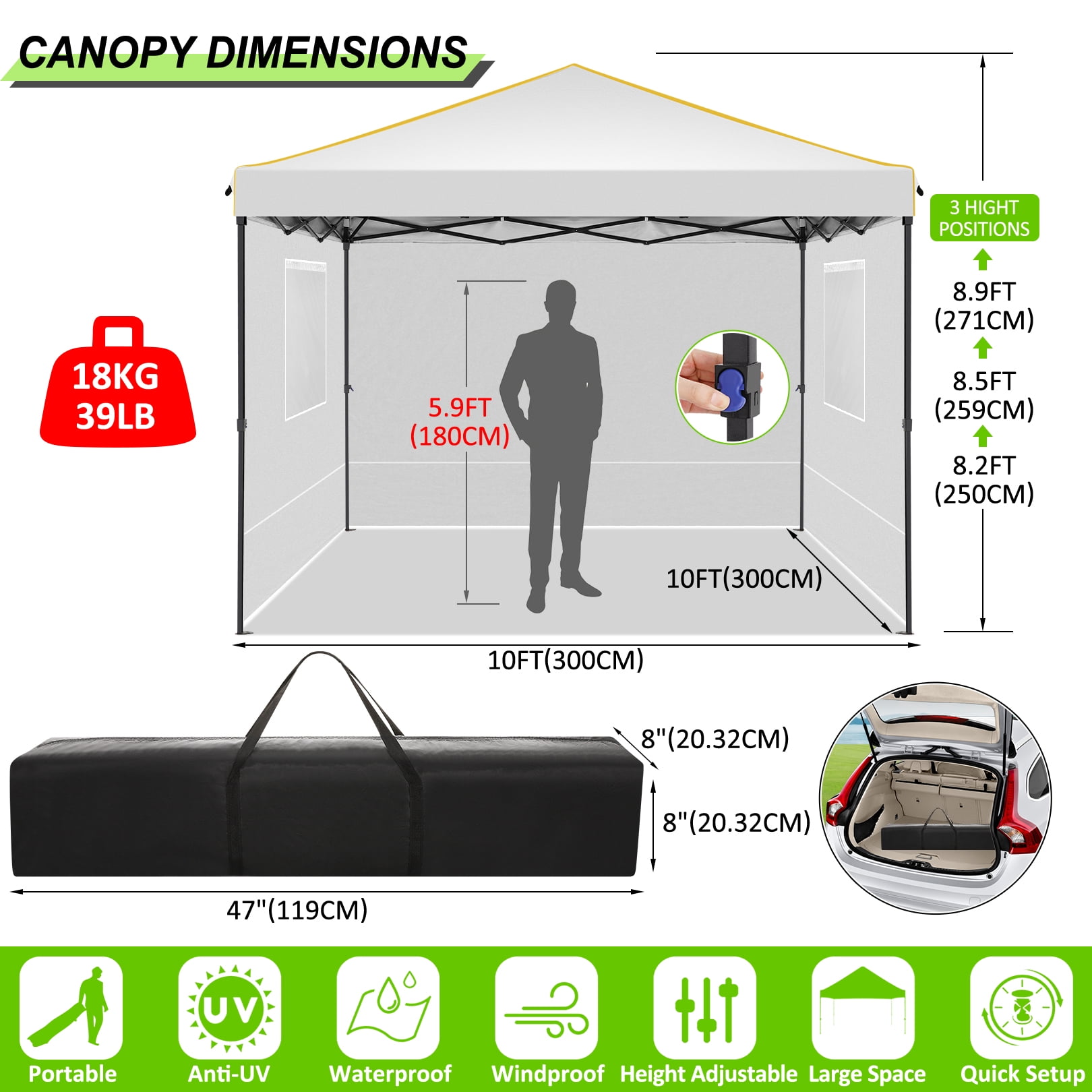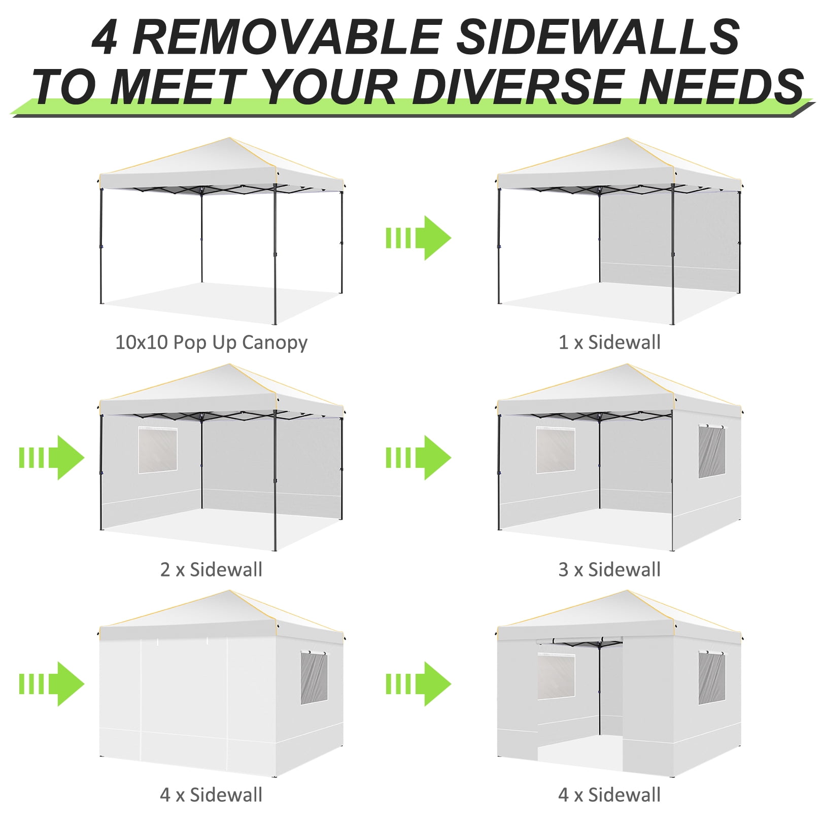 Key Features: 【Spacious Space】The straight-leg instant pop-up awning provides 10×10 feet of shade and covers a wide area. Our instant pop-up canopy holds up to 10 people, chairs, small table and more. 【4 Removable Sidewalls Design】The canopy with 2 side walls with windows and 2 side walls with zippers. The doors on the side walls can also be rolled up. They are easy to assemble or disassemble for greater versatility and ventilation. Suitable for all seasons. 【Top Canopy Material】This pop up canopy is made of 25x25mm thick steel frame with anti-rust powder coating, full truss construction. UPF 50+ UV protection and blocks 99% of harmful sunlight.Heat-sealed seam,the latest technology in the industry, prevent water penetrate from seams, 100% waterproof.The edges of the canopy are inlaid with gold decorative lines, sophisticated and elegant. 【Easy to Install and Remove】 Pop-up portable canopy tent, all parts are assembled, easy to assemble without any tools. One or two people can set it up in minutes. The gazebo tent comes with a portable carry bag that fits most cars for easy travel. 【Upgraded 3 Height Settings】3 different height settings allow you to choose the height that meets your needs. High, Medium, or Low Height Settings: 8.2′ / 7.87′ / 7.55′. Straight leg design provides 100 sq. ft. of shaded area. Specifications: Size:10 ft x 10 ft Color: Black/White/Blue/Khaki/Gray/Deep Blue Adjustable heights: Height to Top: 8.2′ / 7.87′ / 7.55′ Height to Side 6.56′ / 6.23′ /5.9′ Top Fabric: 210D Silver Coating Oxford, Waterproof, Sunshade Sidewall Fabric: 210D Oxford, waterproof Frame Material: Reinforced powder coated steel frame Specifications: Size:10 ft x 10 ft Color: Black/White/Blue/Khaki/Gray/Deep Blue Adjustable heights: Height to Top: 8.2′ / 7.87′ / 7.55′ Height to Side 6.56′ / 6.23′ /5.9′ Top Fabric: 210D Silver Coating Oxford, Waterproof, Sunshade Sidewall Fabric: 210D Oxford, waterproof Frame Material: Reinforced powder coated steel frame Packing List: 1*10 x 10 Pop Up Canopy 4*Sidewalls 1*Handbag 4*Stakes 4*Ropes