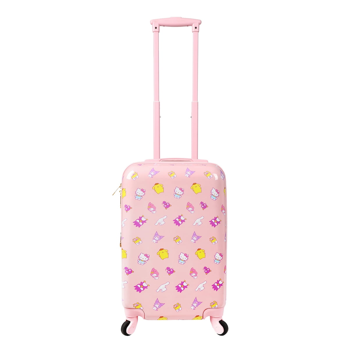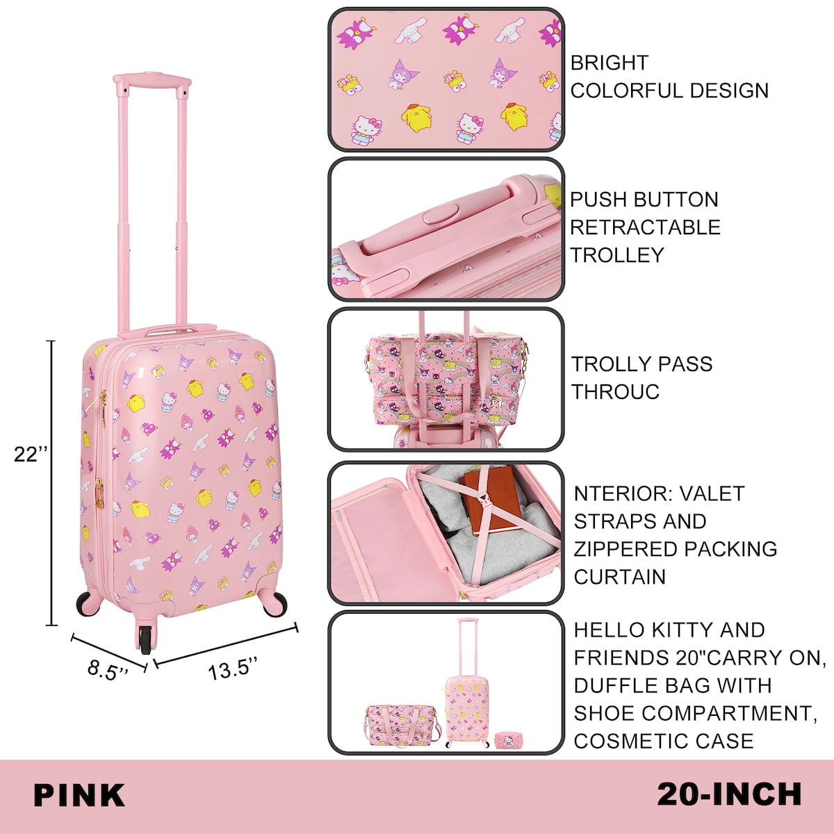 CUSTOM DESIGN: Each piece features unique prints of Hello Kitty, Badtz-Maru, Cinnamoroll, Pom Pom Purin, Kuromi, and My Melody, capturing the charm and whimsy of these beloved Sanrio characters in vibrant and eye-catching designs. 3-PIECE SET: This comprehensive set includes a spacious rolling luggage, a functional duffle bag with a convenient shoe compartment, and a versatile utility kit, providing ample storage options for all your travel needs. OFFICIALLY LICENSED: This set is officially licensed by Sanrio, guaranteeing authenticity and quality that meets the standards of Hello Kitty enthusiasts worldwide, ensuring your purchase is genuine and of the highest quality. HIGH-QUALITY MATERIALS: Crafted from durable ABS and PC film materials, these pieces are built to last while remaining lightweight, offering superior protection for your belongings without compromising on style. CARE INSTRUCTIONS: Maintain the pristine appearance of your Hello Kitty luggage set effortlessly with simple care instructions. Wipe it clean with a damp cloth to keep it looking as good as new for every adventure.