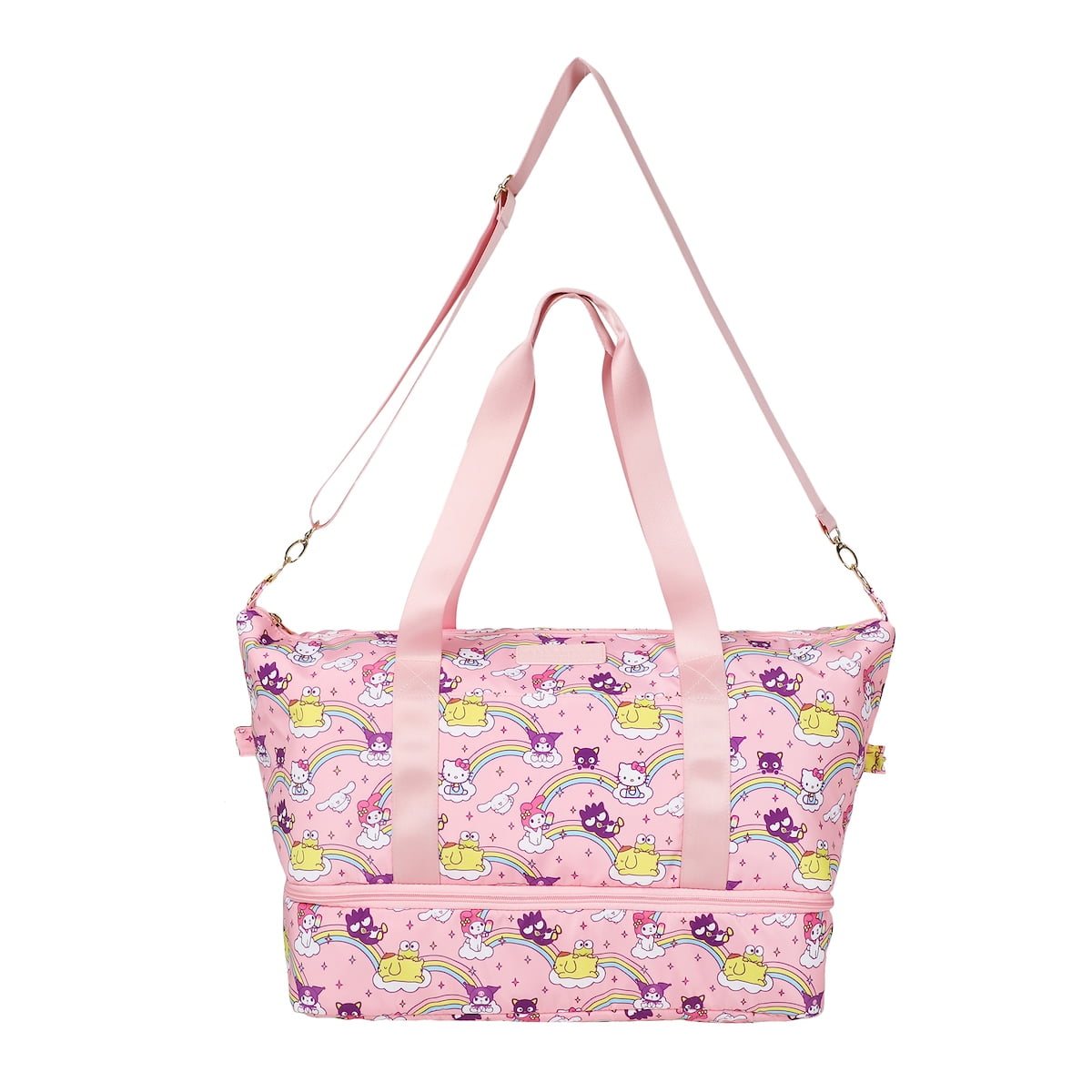 Embark on a delightful journey with this Hello Kitty 3-piece luggage set, featuring vibrant prints of beloved Sanrio characters like Hello Kitty, Badtz-Maru, Cinnamoroll, Pom Pom Purin, Kuromi, and My Melody. The set includes a 20″h x 13.5’w x 8’d rolling luggage showcasing these iconic characters, accompanied by a spacious 14″h x 17.5″w x 8″d duffle bag adorned with colorful rainbows and a handy shoe compartment. Completing the trio is a charming 4.5″h x 4.5″w x 8″d utility kit featuring Hello Kitty seated on a fluffy cloud, offering versatile storage solutions for your travel essentials. Wipe this set clean for easy care.