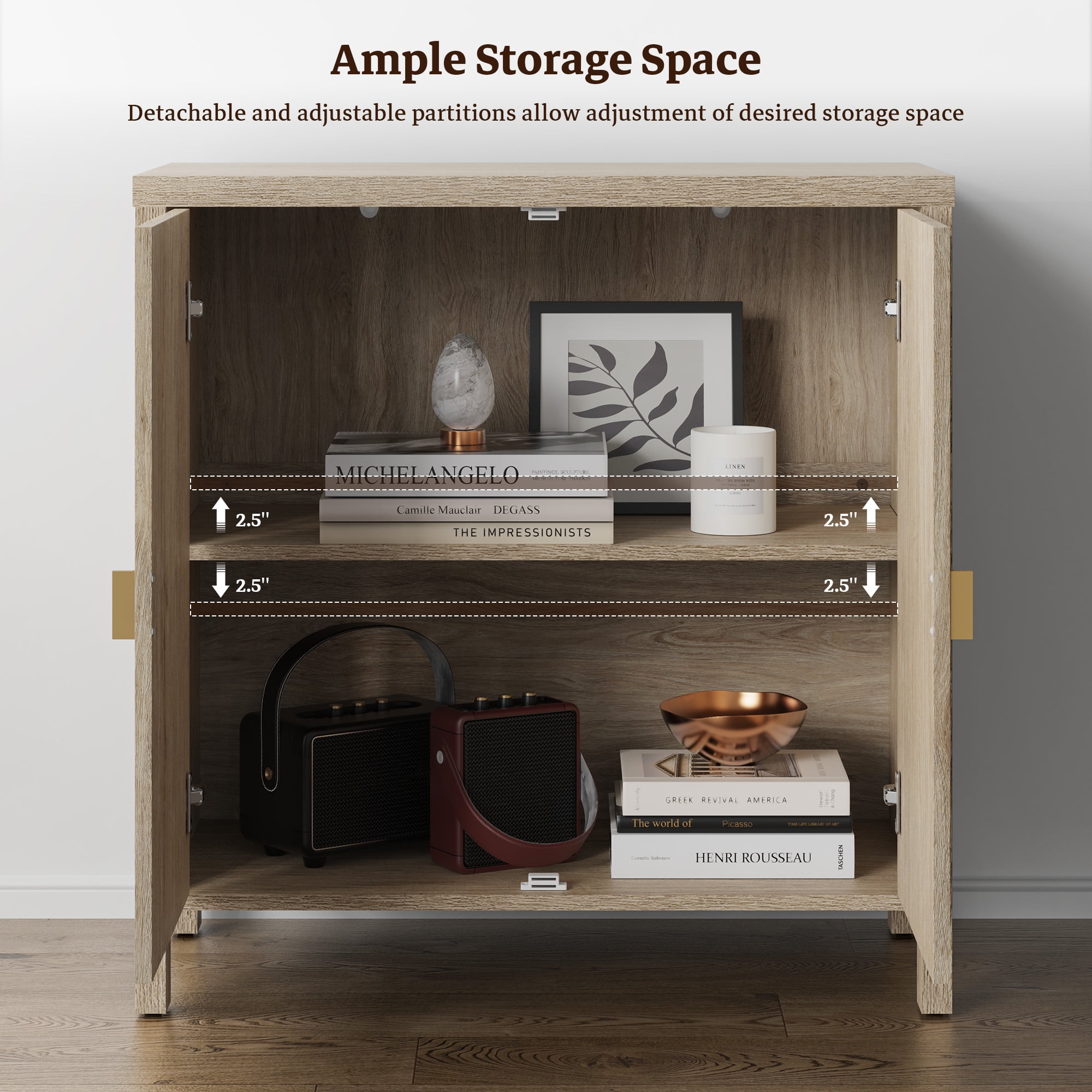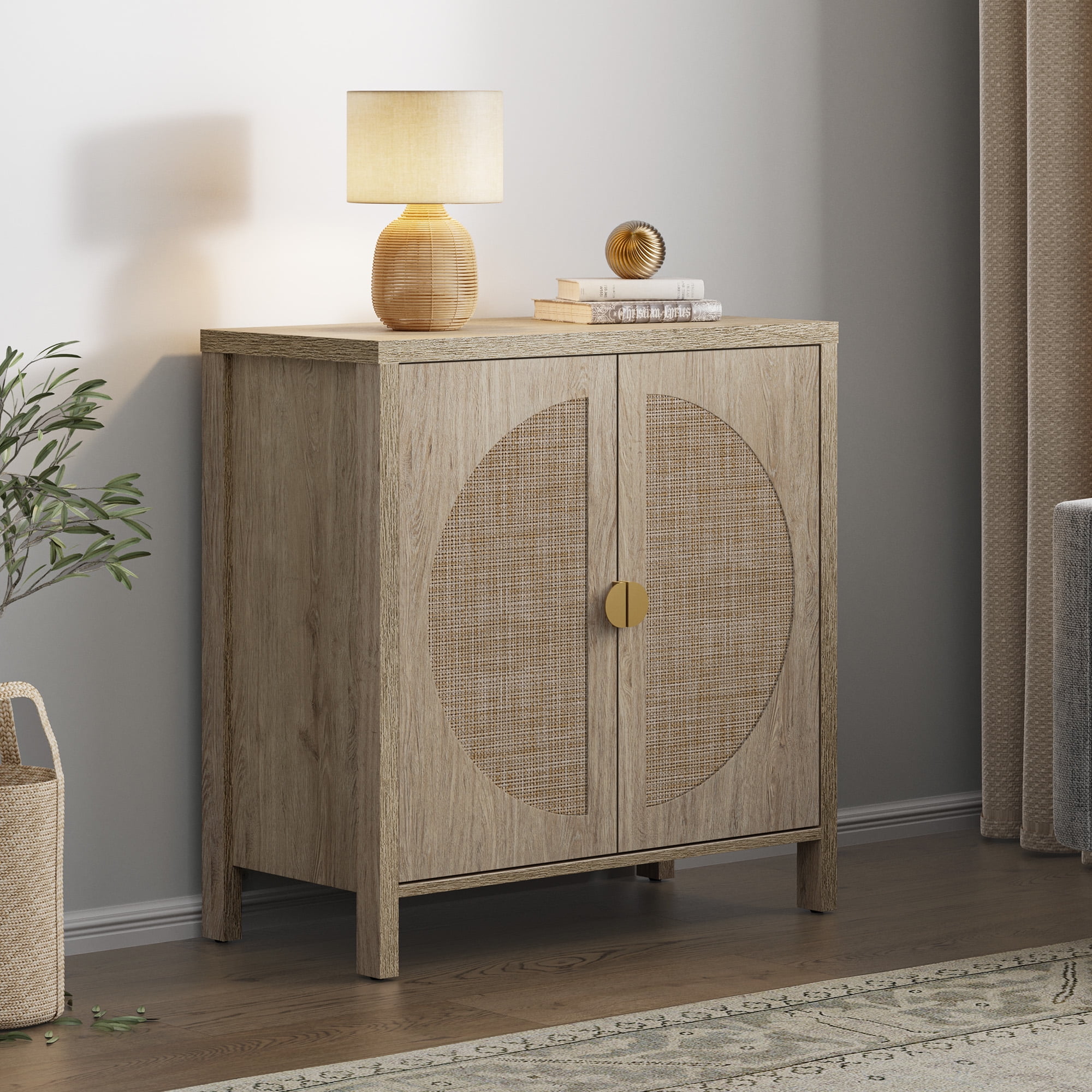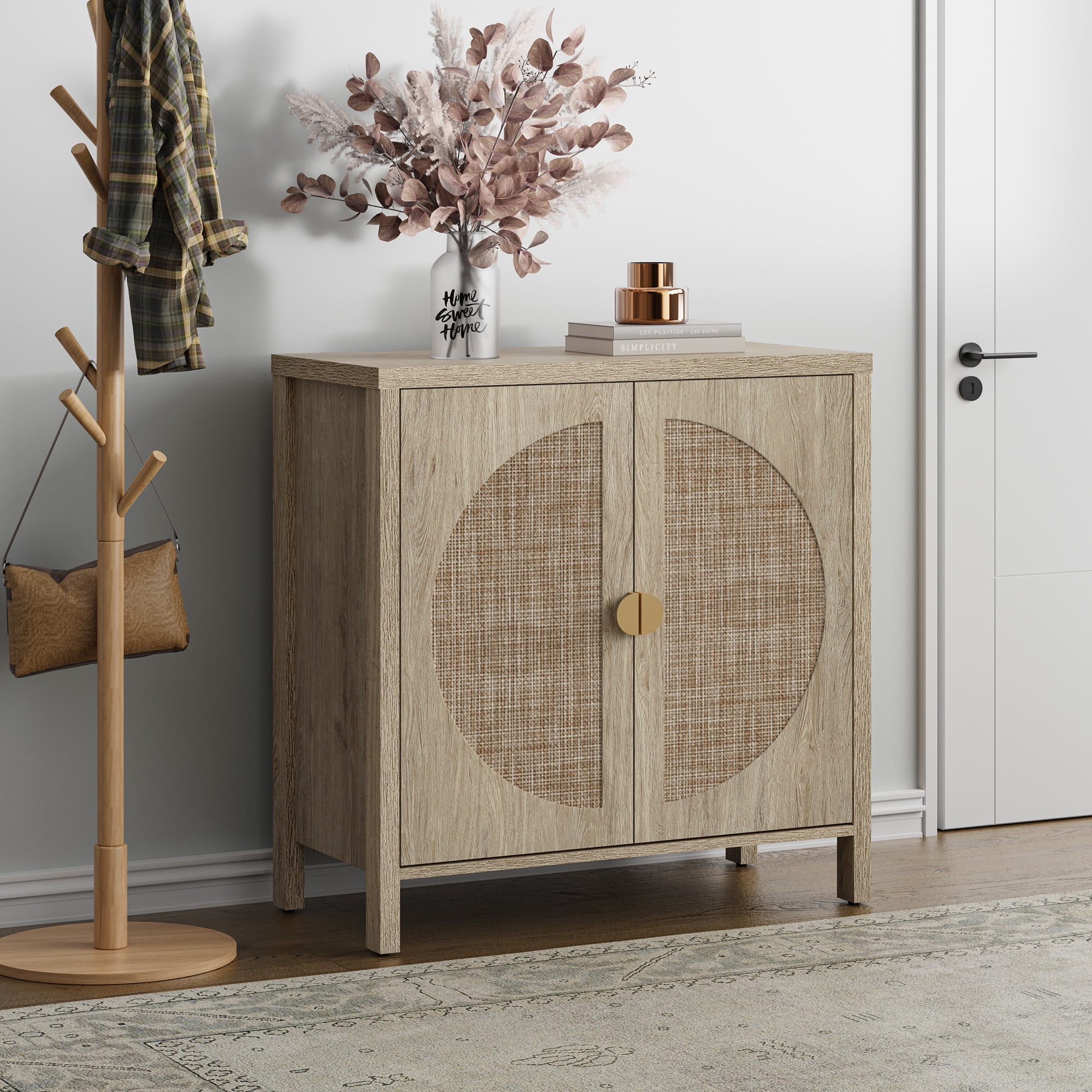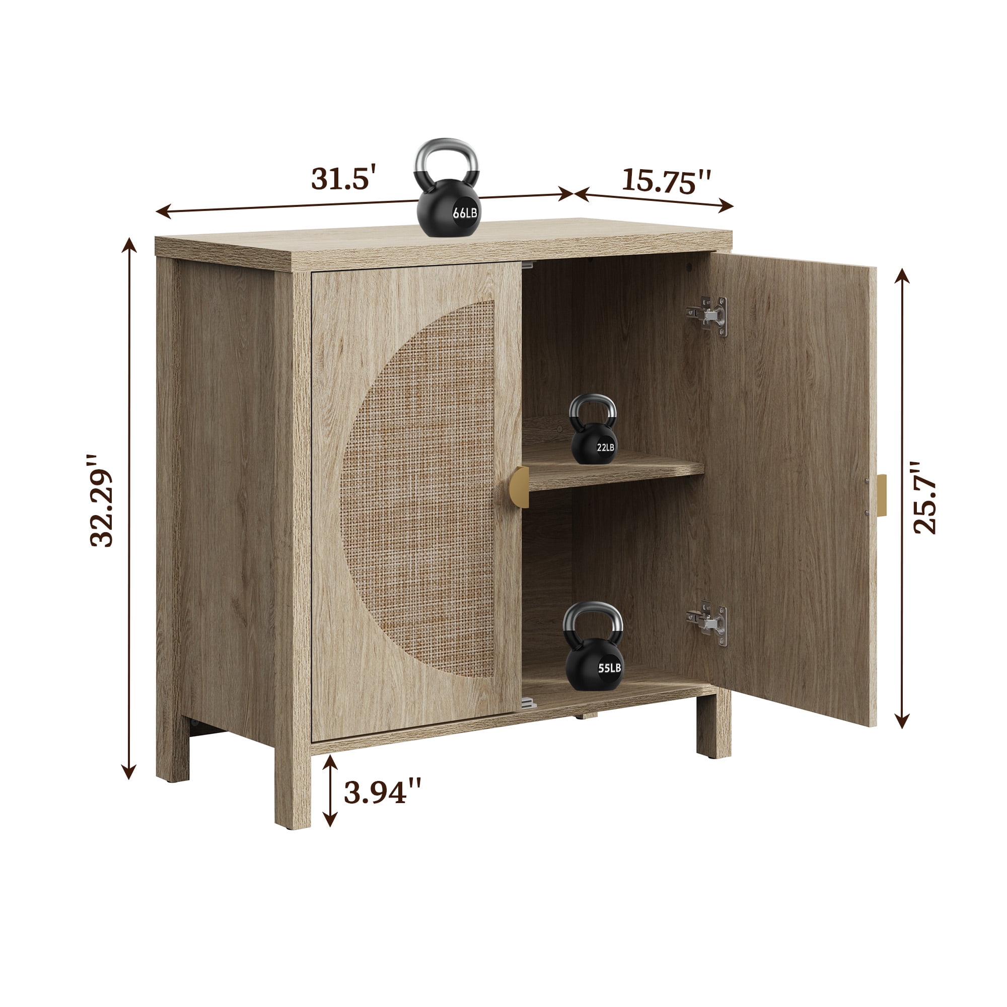 Description: This sideboard is designed in a minimalist style with an elegant looks and can be matched with any decoration. The Semi -circular door mesh woven rattan door adds a intriguing design. It is made of board with rubber veneer and has a classic look. features 2-tier shelf for versatile storage. Use this locker to add more brilliance to your house and keep things organized to save space. Superior Features: Unique and elegant mesh woven rattan door design. Exquisite rubber veneer matches various decor. The frame makes the structure more sturdy and durable. With removable shelf, storage space can be adjusted according to needs. Specifications: Color: Oak Material: MDF, Rattan Product Size: 31.5” W x 15.75”D x 32.29” H Package Contents: 1 x Modern Storage Cabinet 1 x Accessory Kit 1 x Instruction Manual “
