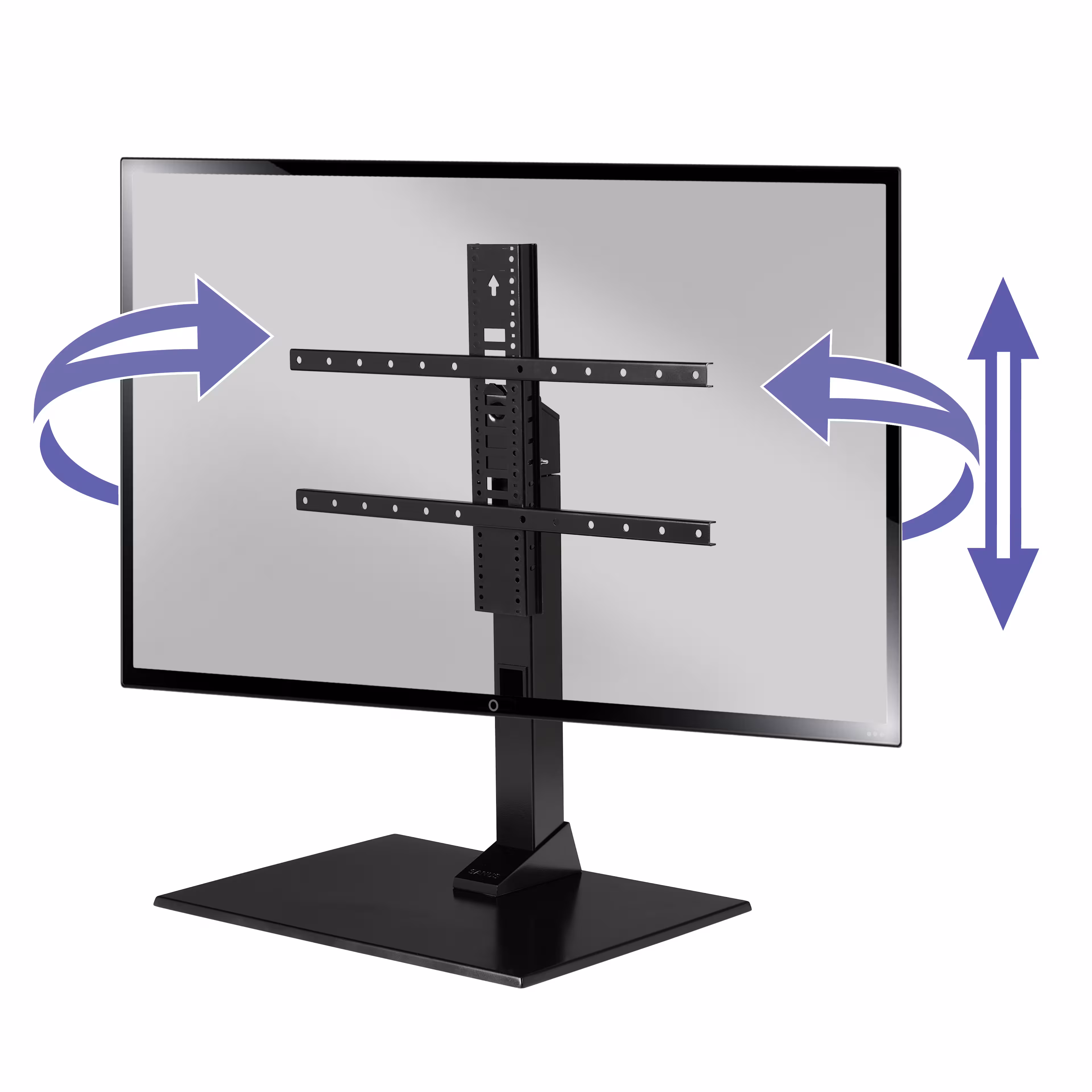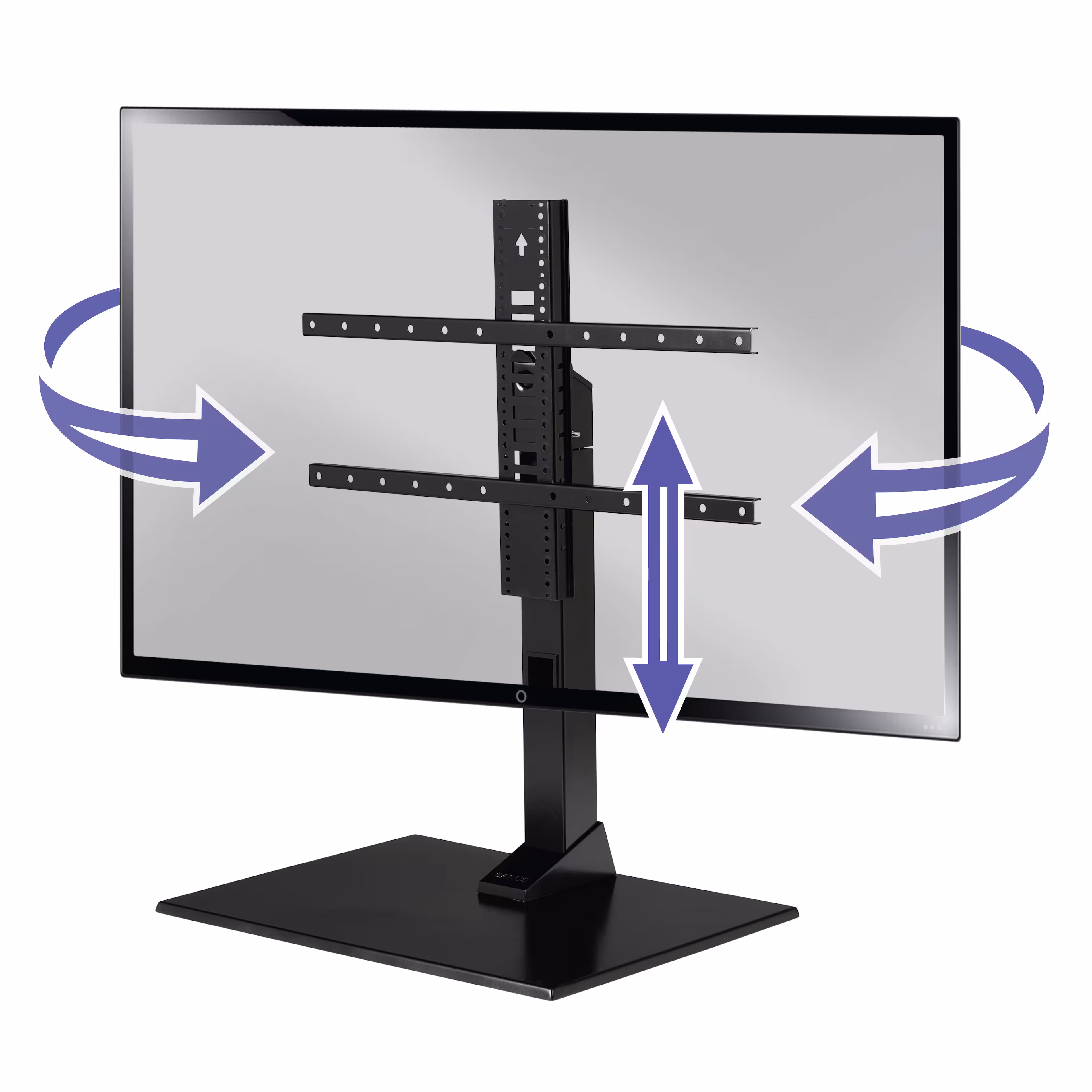 The SANUS Elite Swivel TV Base is a table-top stand for TVs 40″-86″ and the perfect replacement for TV feet that are traditionally included with TVs. By providing 70 degrees of swivel left to right, the Elite Swivel TV Base dramatically improves viewing range by allowing you to point the TV to where you are seated. Includes a solid metal base for greater stability as well as integrated cable management to conceal and route cables. Featuring 8″ of height adjust, making it great for soundbars and other devices beneath your TV.