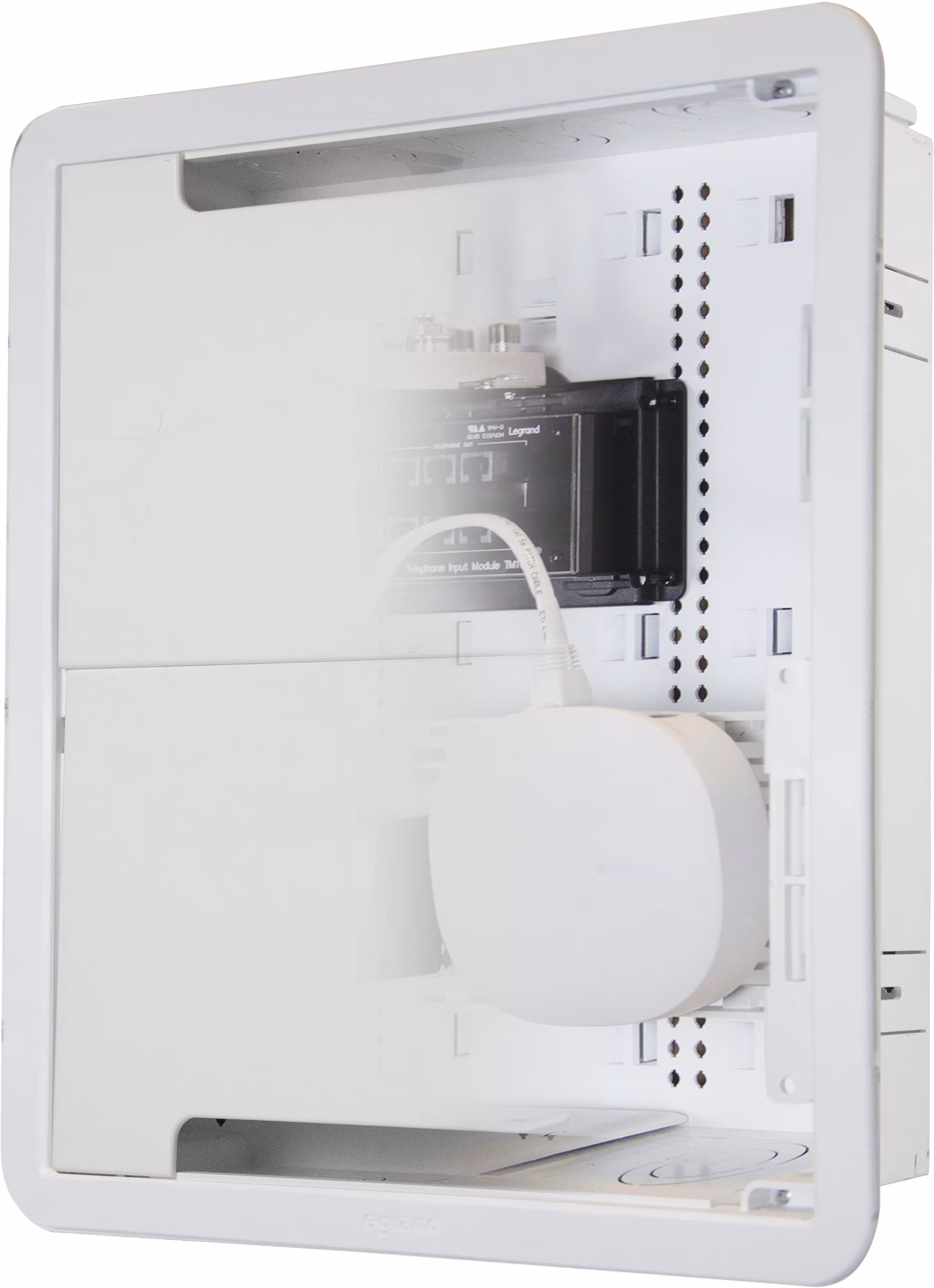 The Sanus 17-in TV media in-wall box is ideal for concealing and organizing media devices and power in wall to create a sleek, finished look. The in-wall box sits flush behind any wall mounted TV & allows you to store streaming devices like Samsung One Connect Hubs, Apple TV, Roku, Amazon Fire TV, network switches and more. Cable and power knockouts help with cable organization and allows you to bring power your TV and other devices in one location. Constructed of Wi-Fi transparent material for un-interrupted connections. Includes extra mounting plate, cover, trim ring, hook and loop strap, and cutting template for easy installation.