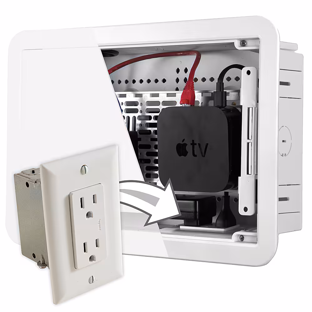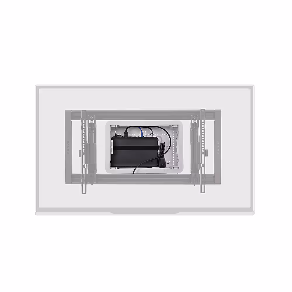 The Sanus 9-in TV media in-wall box with power supply kit is ideal for concealing and organizing media devices and power in wall to create a sleek, finished look. The in-wall box sits flush behind any wall mounted TV & allows you to store streaming devices like Apple TV, Roku, Amazon Fire TV, network switches and more. Cable knockouts help with organization and power knockouts allow you to install the included power supply kit to bring power your TV and other mounted devices in one location. Constructed of Wi-Fi transparent material for un-interrupted connections. Complete solution – Includes box, trim ring, cover, hook and loop strap, extra mounting plate, junction box and outlet, instructions and cut-out template.