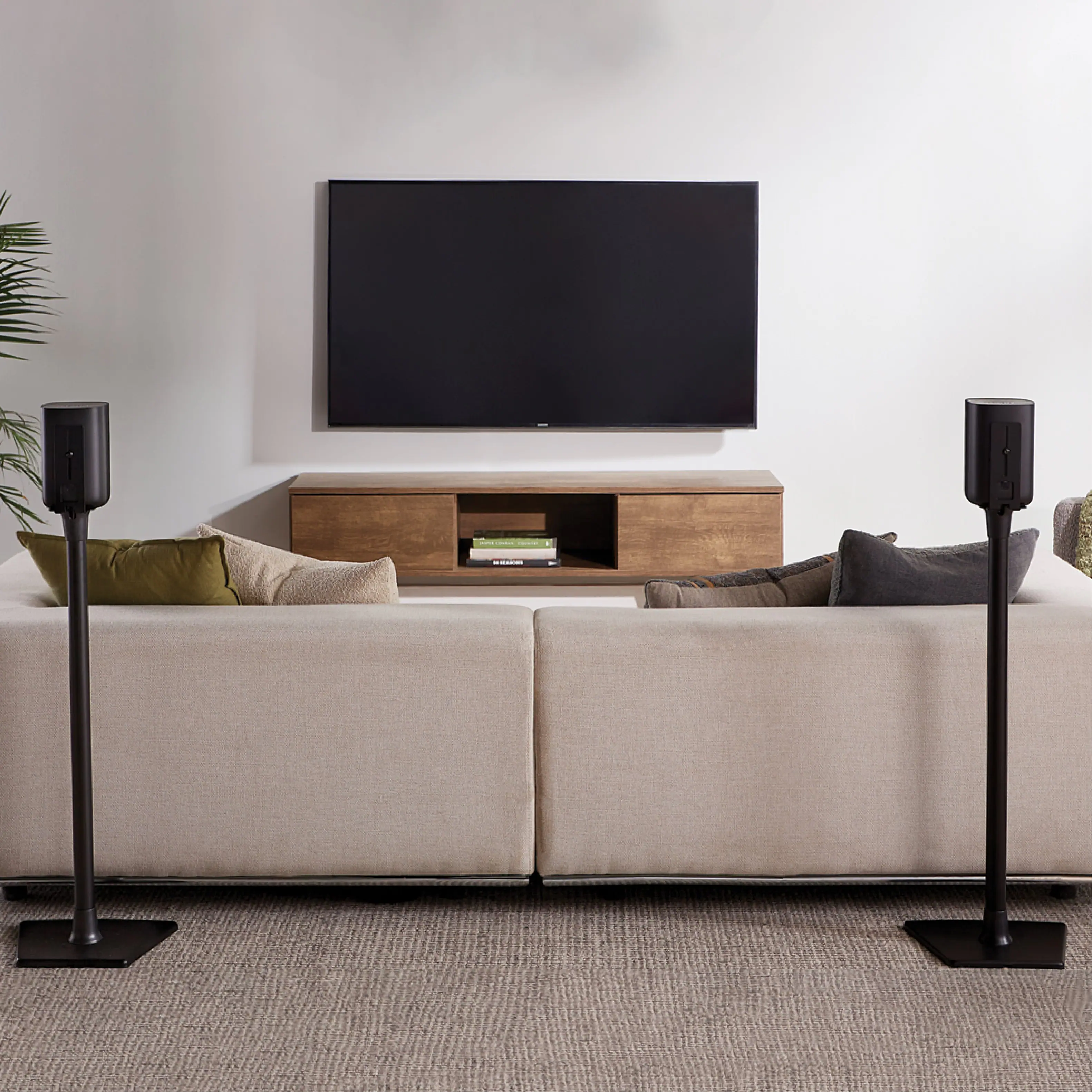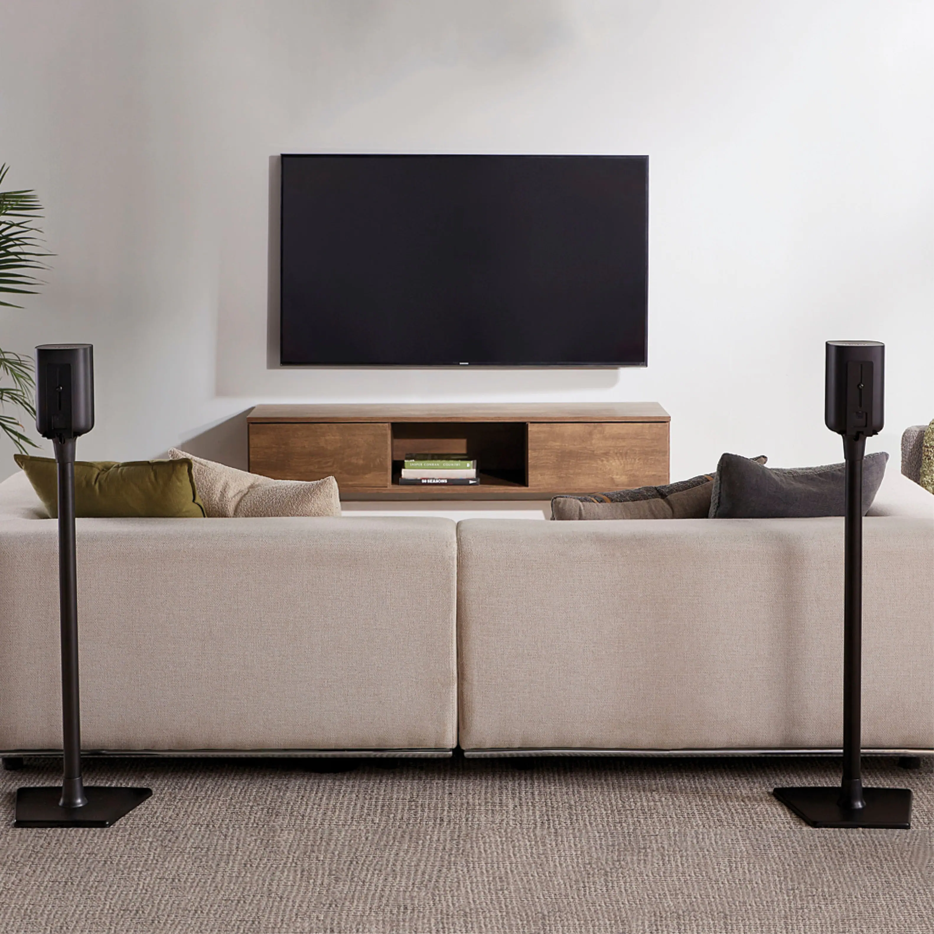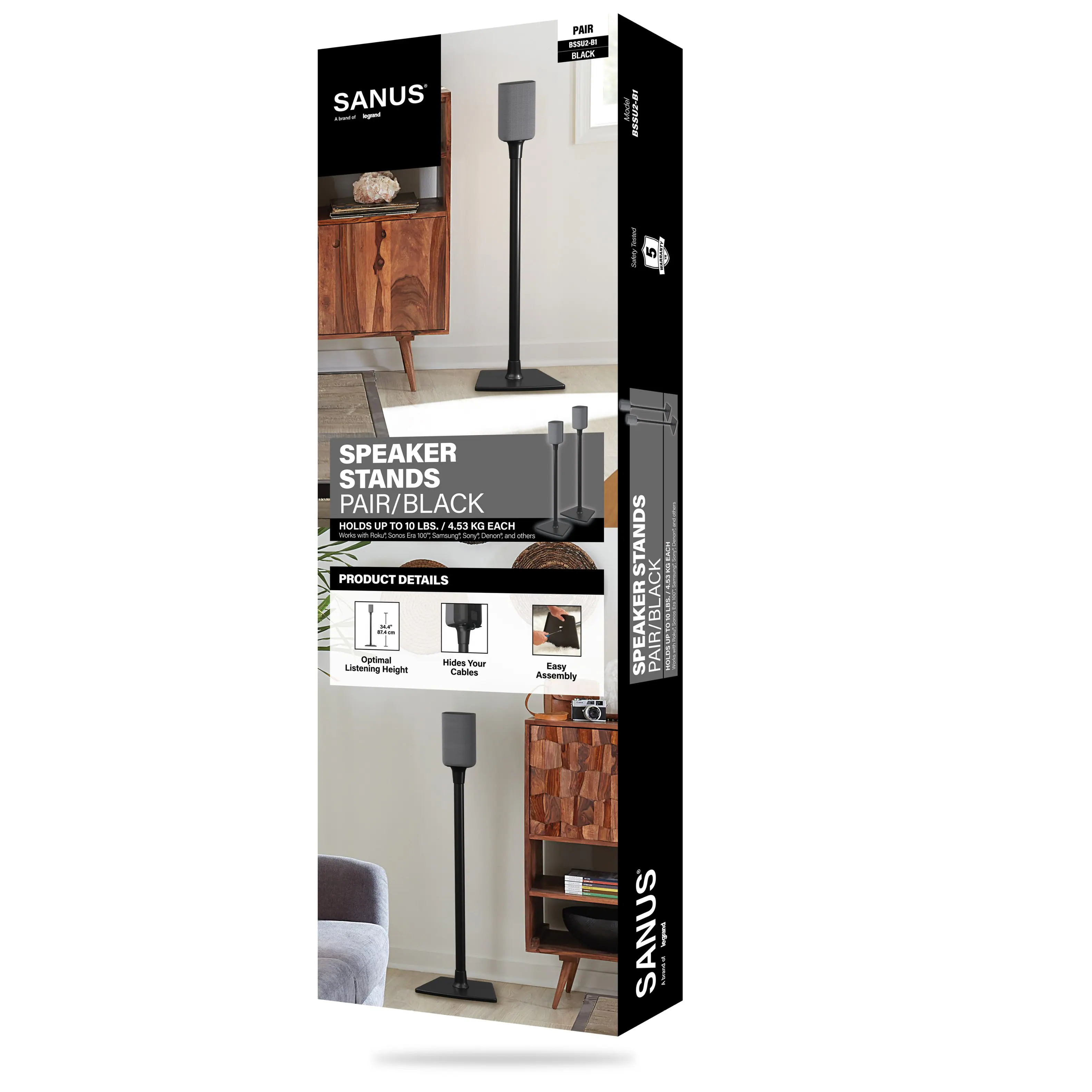 Sanus Universal Speaker Stands are sold in pairs and provide a space-saving setup for top wireless speakers, such as Roku, Samsung, Sony, and Denon up to 10 lbs. Free up space on your furniture and position your speakers at the optimum height for an enhanced listening experience. Keep your space neat and sleek with built-in wire channels which allow you to easily conceal your cables. These speaker stands are easy to install and are safety tested to meet UL standards. At Sanus, we stand behind our products and aim to provide the best experience for you from purchase through installation. Our knowledgable, friendly customer care team based right here in the U.S. is available 7 days a week by phone, email, or chat if you need support.
