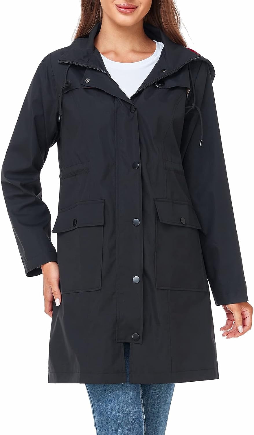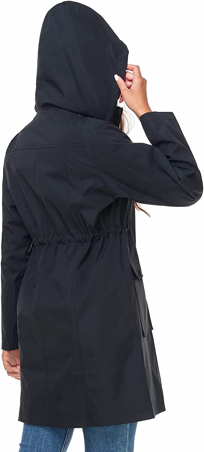 Raincoat for Women Waterproof Rain Jacket Hooded Outdoor Windbreaker Lightweight Trench Coat Product Features: Waterproof pocket:Waterproof pockets are designed to avoid rain from getting into your pockets and getting your phone and wallet wet when you reach for them. Waterproof zipper:Waterproof zipper can better ensure that all the rain will be blocked outside the raincoat, rain will not flow into inside of raincoat when you take off it. Adjustable hood:Adjustable headgear can better meet the daily needs of different customers, when the rain is heavy customers can tighten to ensure rain won’t flow in. When the rain is light, customers can loosen the headgear to get better comfort.