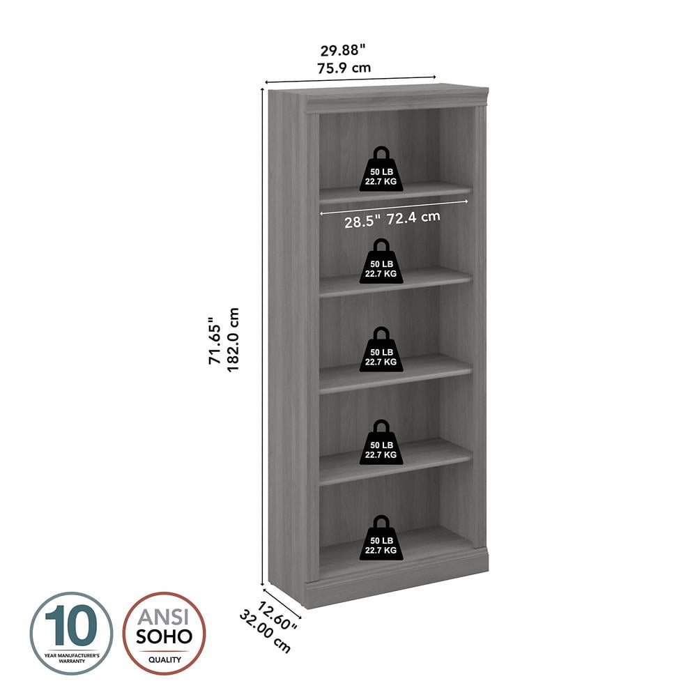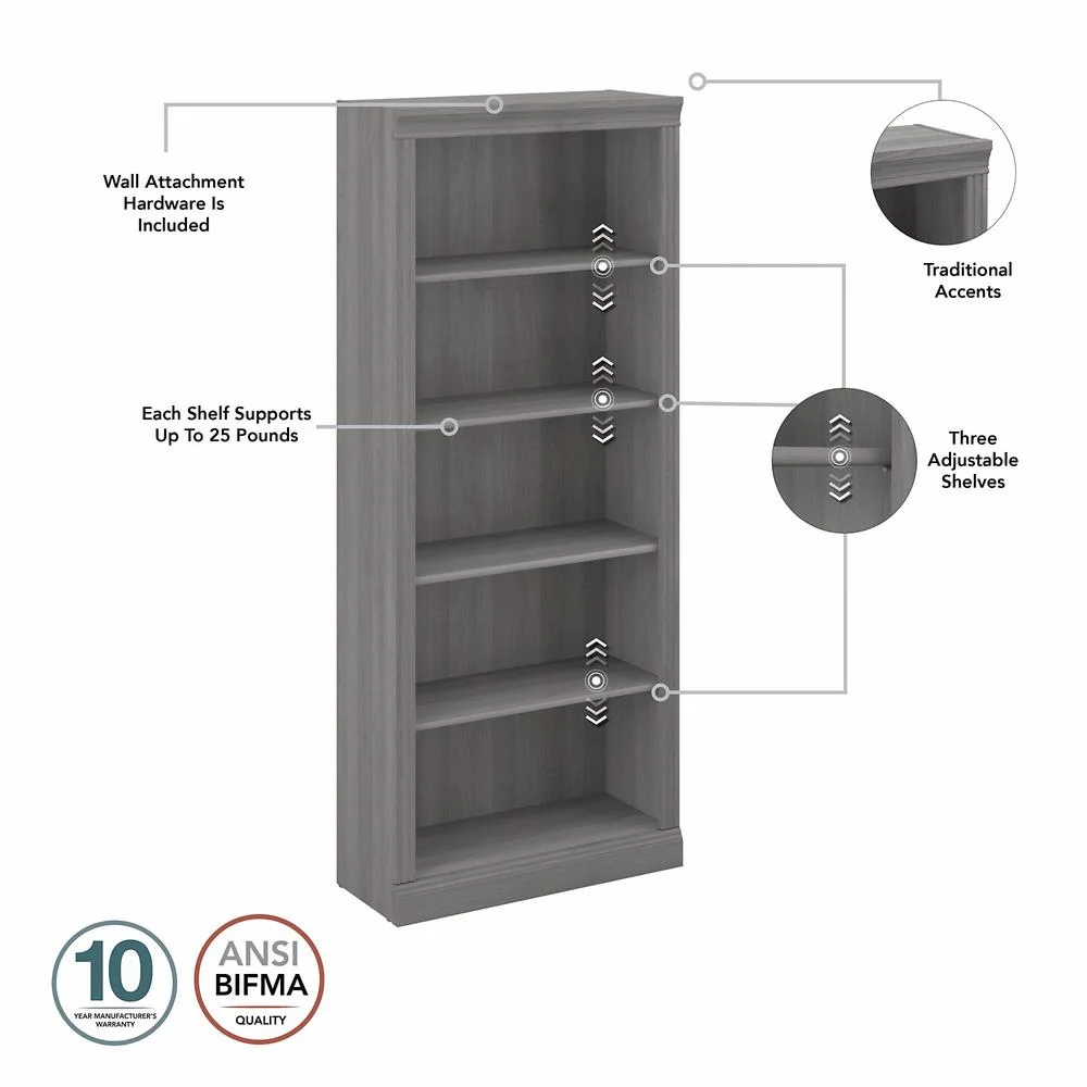 30W x 13D x 72H Tall 5 Shelf Bookcase presents a practical storage solution with timeless traditional style Three adjustable shelves accommodate books and decorations of various sizes; two shelves are fixed for stability Each shelf supports up to 25 pounds Tall bookshelf’s decorative top, base and side rail detailing brings a classic charm to any home office or living space Available in your choice of Harvest Cherry, Linen White Oak and Modern Gray finishes Tested to meet ANSI/BIFMA quality standards for safety and performance Backed by the Bush Furniture 10 Year Manufacturer’s Warranty Complete your personal workspace with a coordinating Computer Desk, Office Chair and Lateral File Cabinet (sold separately)