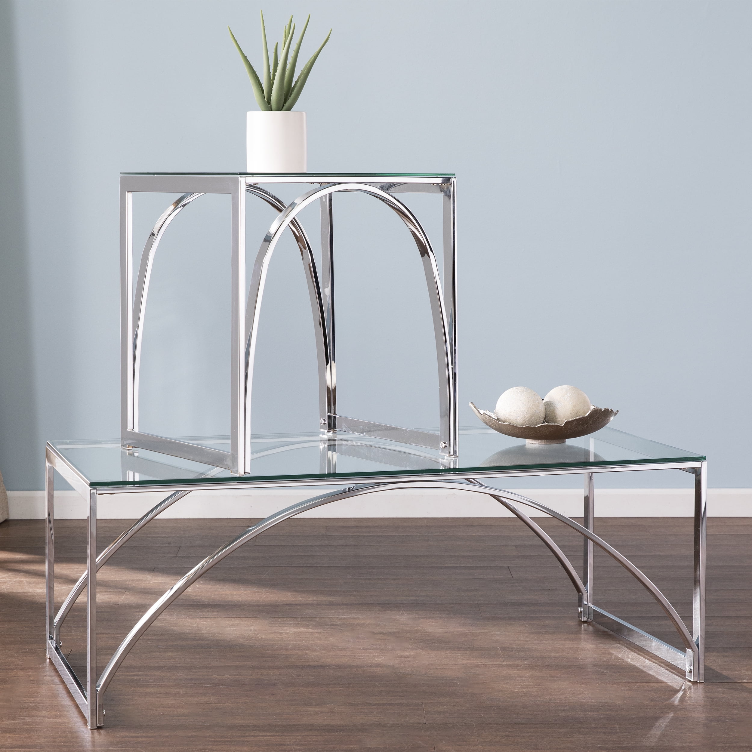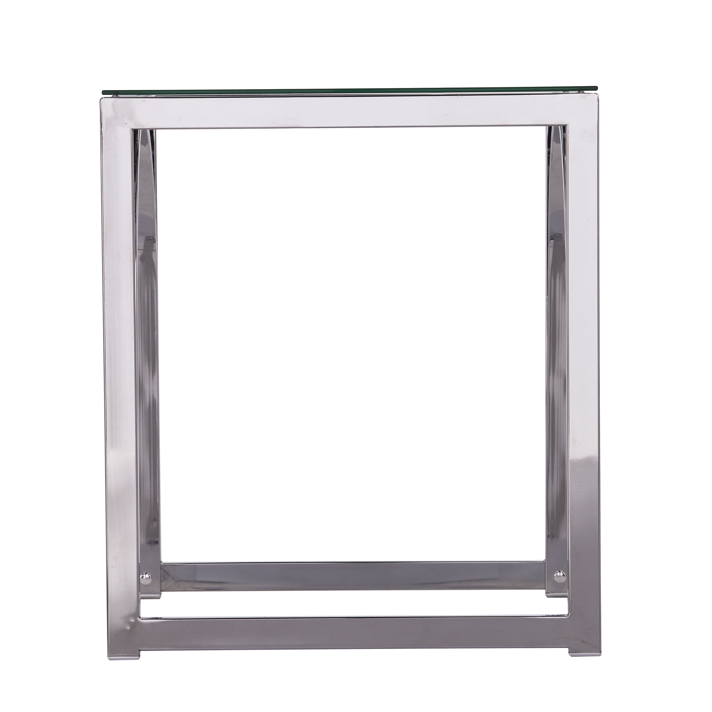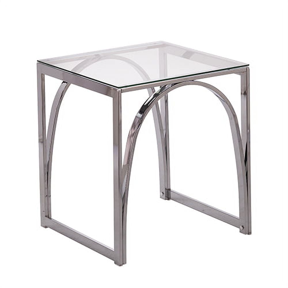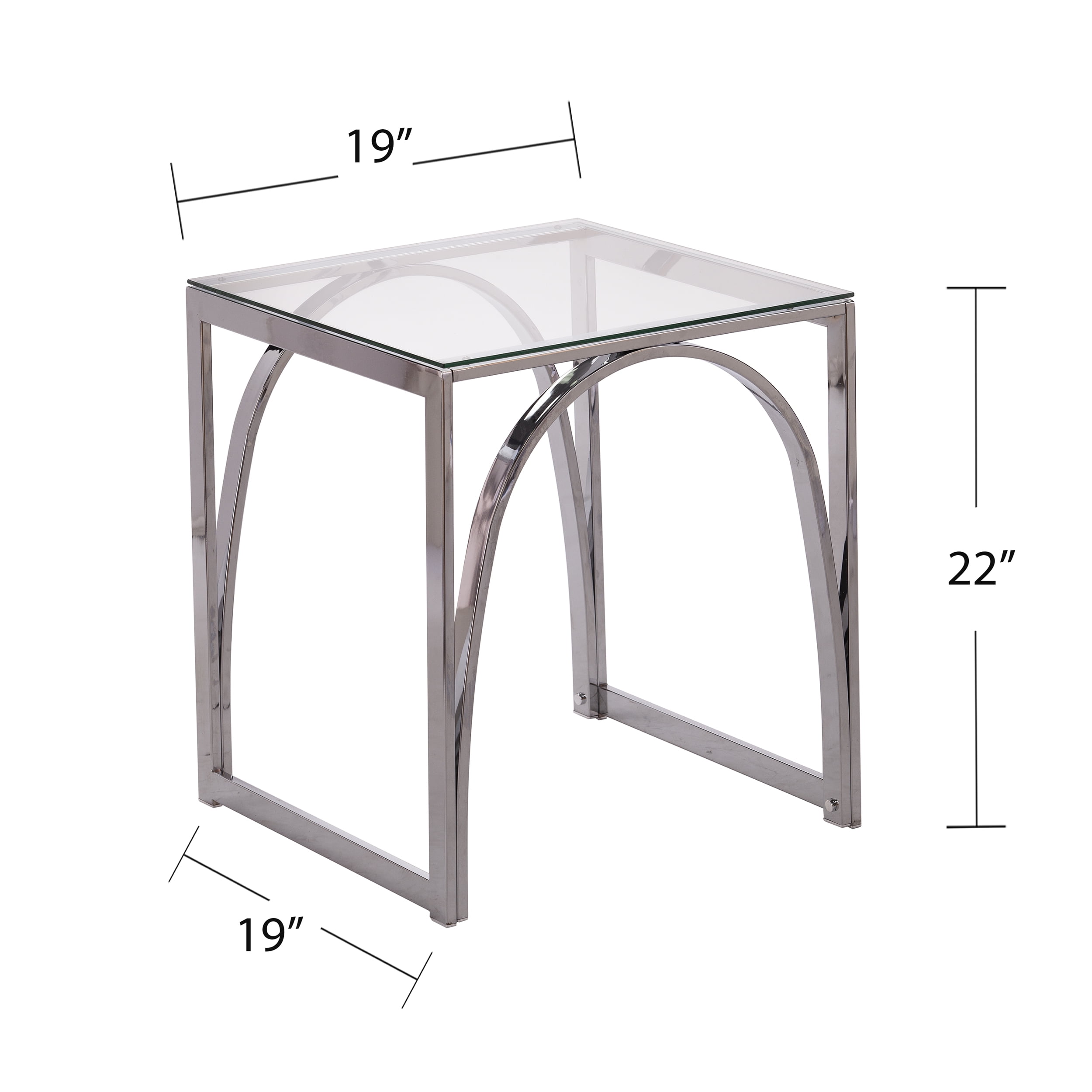 Modernize your living room look with this glass-top end table. An architectural frame forms elegant curves for a sleek, shiny look, while the square glass tabletop offers ample space for a reading lamp and your morning cup of coffee. Accent your space with sophisticated flair when you top this side table with a single vase for a simple, minimalist feel or with family photos and trinkets for a personalized look. Slide this metal and glass end table alongside your sofa or armchair and keep contemporary convenience by your side.