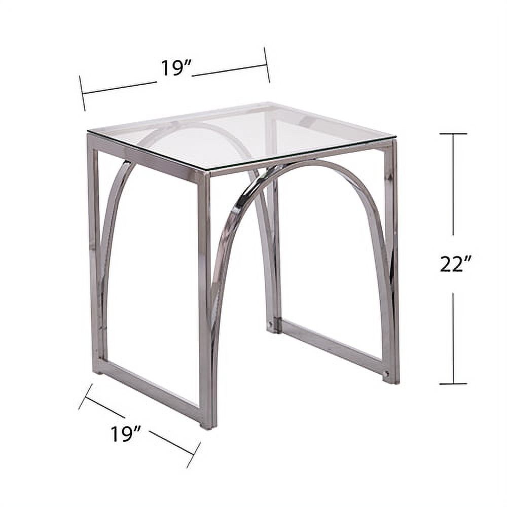 ? Square side table w/ glass top? Arched frame adds an architectural shape to a classic silhouette? Shiny metal and clean lines craft a modern look in a mixed-material profile? Living room or open concept living space? Contemporary style? Chrome finish? Overall: 19? W x 19? D x 22? H? Assembly Required