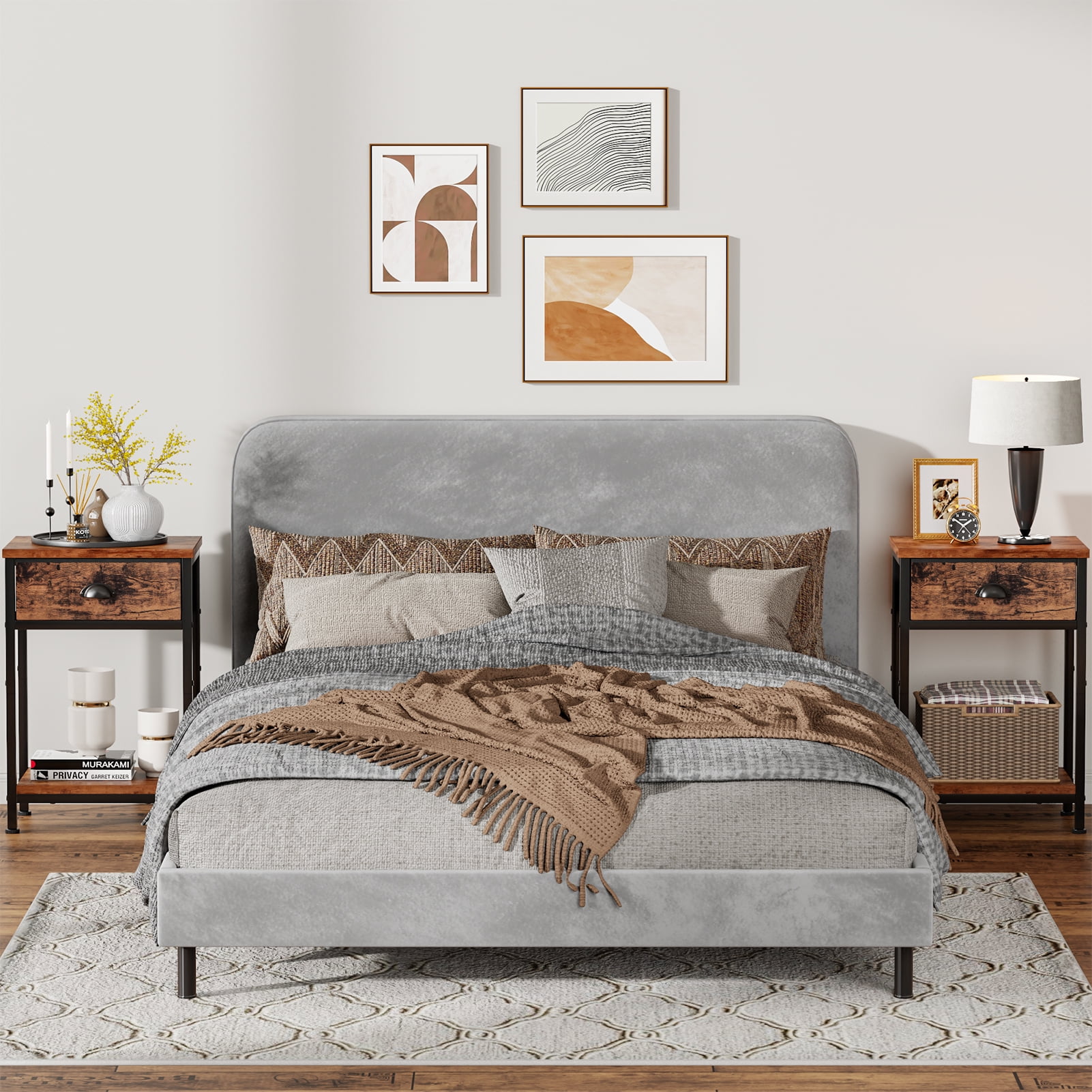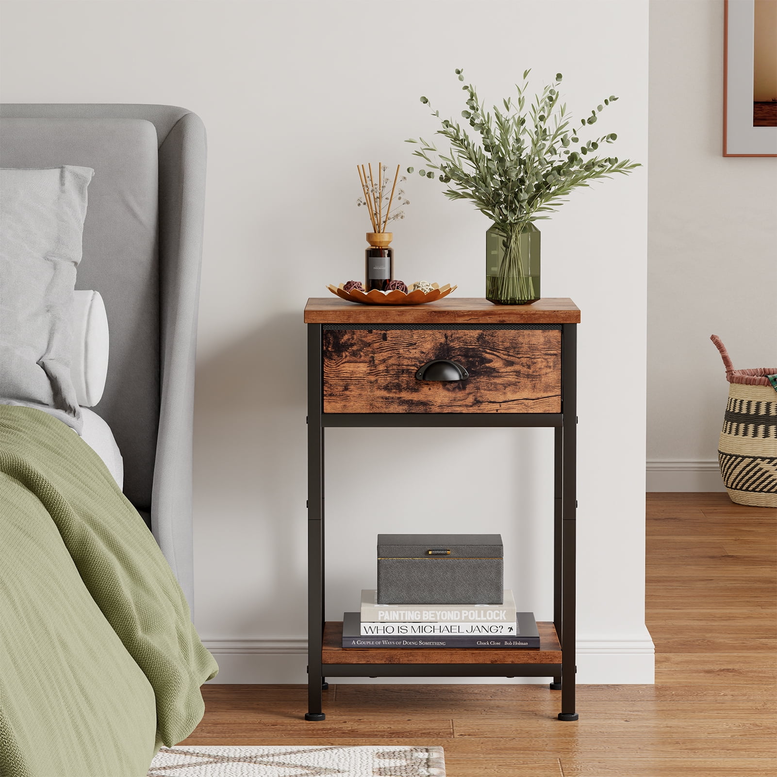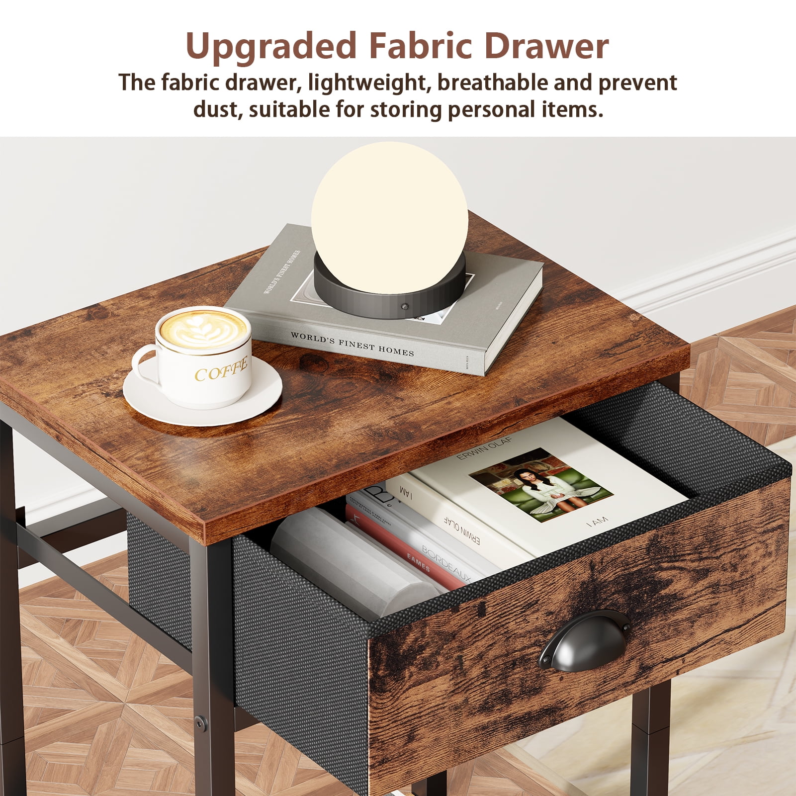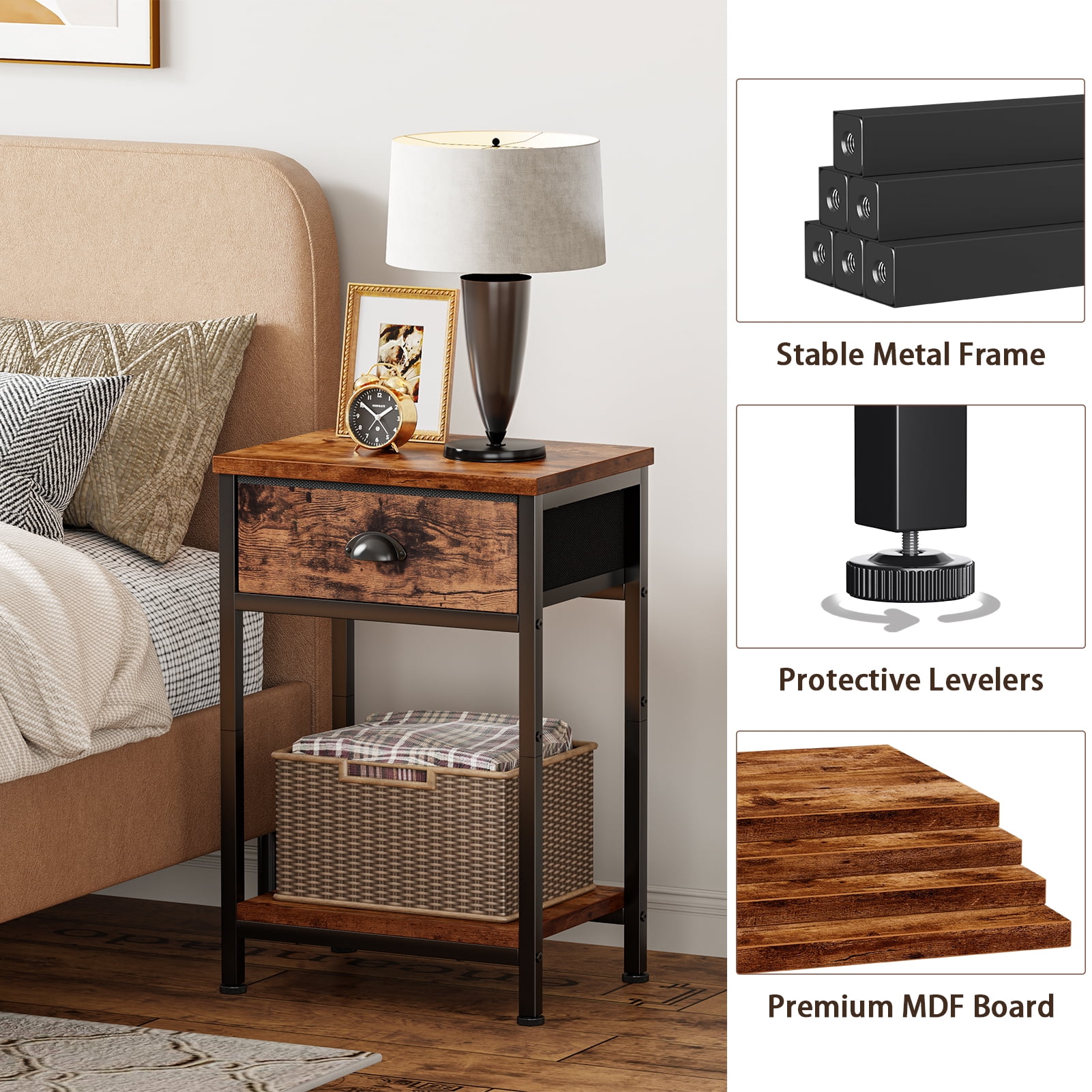 【NIGHTSTAND SET of 2】Our nightstand featuring a sleek outlook design makes this side table with storage easily immerse into any home room. This end table is equipped with a detachable fabric drawer and an open shelf, seamlessly enhancing any decor. They not only bring a sophisticated flair to your environment but also offer generous storage for all your nighttime necessities. 【ADAPTABLE AND PRACTICAL】Our end table is versatile enough to fit in any area of your home. Whether you require a compact dresser for the bedroom, a handy side table next to your sofa, or a toy organizer in your bedroom, this nightstand serves as an ideal choice. Its multifunctional design opens up a world of possibilities. 【UPGRADED STABILITY】We recognize the necessity for stability and balance in furniture. Our compact table features adjustable legs to guarantee a firm and level surface, even on slightly uneven ground. Say goodbye to wobbling! Just tweak the legs to restore the table to perfect steadiness. 【DURABLE AND LONG-LASTING】Built with a sturdy steel frame and a water-resistant wooden top, our nightstand is made to last. The easy-to-grip handles simplify the process of opening and closing the drawers, while the four adjustable feet prevent unsightly scratches on your flooring. You can trust that this nightstand is designed for longevity. 【FAST AND SIMPLE ASSEMBLY】Our package comes with all the essential tools and accessories for a swift assembly. With clear instructions and numbered part, you can set up your nightstand organizer in approximately 15 minutes. Should you face any challenges, our dedicated support team is available to assist you within 24 hours.