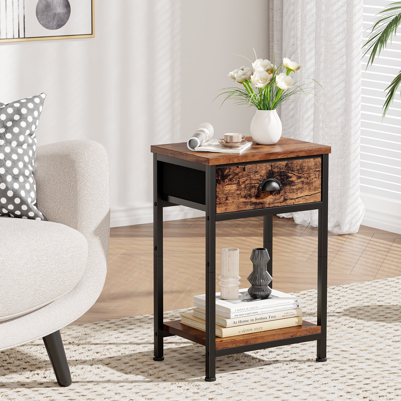 Upgrade your bedroom with Satifur nightstands. Featuring removable fabric drawer and open shelf, these table match any decor style and provide ample storage. Use them as nighstand, beside table, dresser, end table, or toy organizer. With adjustable legs for stability, a strong steel frame, and easy assembly. Its compact size and practical layout ensure it fits seamlessly into any room decor Take it and transform your space with style and functionality! Specification: Color: Rustic Brown Material: Particleboard + Metal Product Dimensions: 11.41″D x 14.56″W x 23.61″H Package include: 2 x Nightstand 1 x Manual Satifur Nightstand with Drawer and Shelf ,Bedside End Table, Sofa Side Table, for Bedroom, Livingroom, Rustic Brown, 2 Pack: