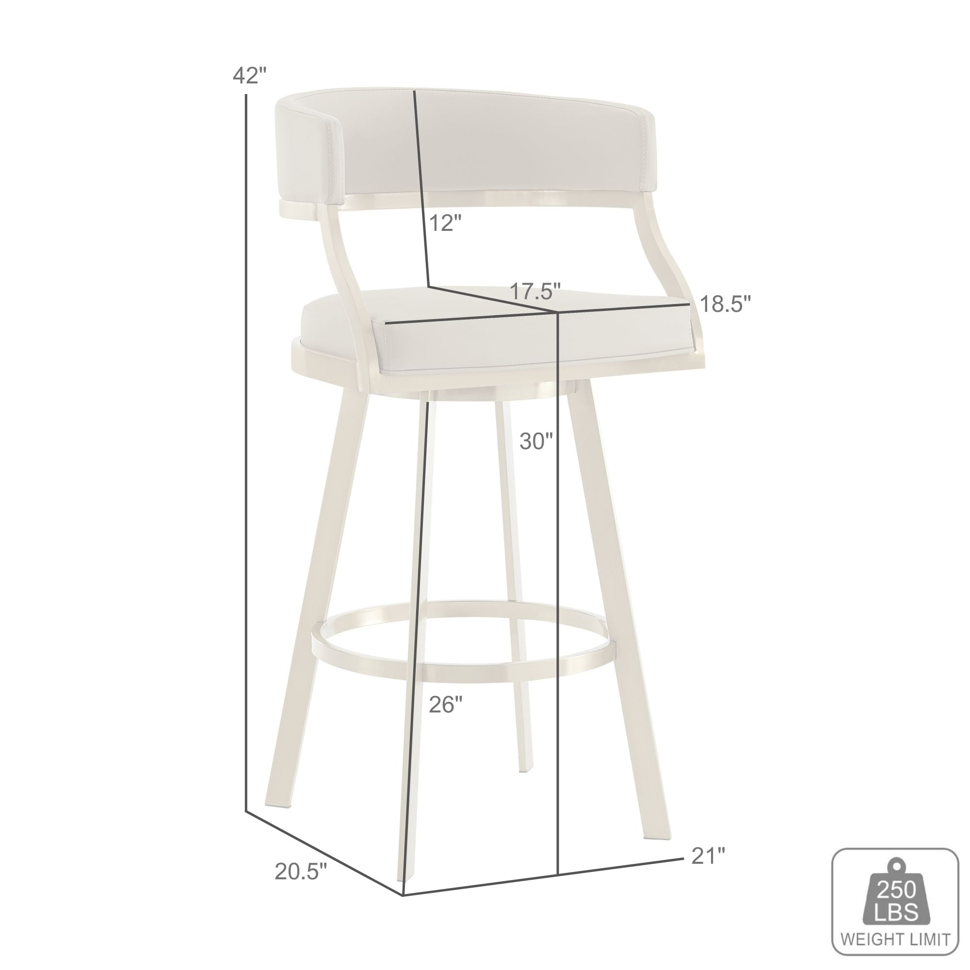 Bring sophisticated elegance and comfort to any corner of your space with the Saturn Swivel Counter or Bar Height Stool in Faux Leather and Stainless Steel by Armen Living. Refined design details and a mix of high-quality materials lend luxurious charm to our barstool. The beautifully stylized armrest and curved back offer a polished and sophisticated look. The generously padded, barrel back flows into the beautifully stylized armrests for maximum comfort and a sophisticated silhouette. Perched upon tapered stainless steel legs, the Saturn barstool effortlessly combines comfort and aesthetics. It adds a dose of style and practicality to your kitchen island, pub table, eat-in kitchen, home bar, or adjustable desk in a home office. This stool includes a built-in circular footstool for an added layer of comfort, along with the high-density foam cushions and supple faux leather. Each leg is tipped with floor protectors, ensuring that the bar stool will not slip on or scratch hardwood or tile floors, making this a durable bar stool that will last for many years to come. Its smooth 360-degree swivel function offers maximum mobility and will become your favorite spot to sit and enjoy conversations with friends and family. The Saturn Swivel Counter and Bar Height Stool is available in a Gold Brushed Stainless finish with Light Sand, White, or Black faux leather, or Brushed Stainless Steel finish in Gray or Black faux leather to bring lasting elegance to your home.