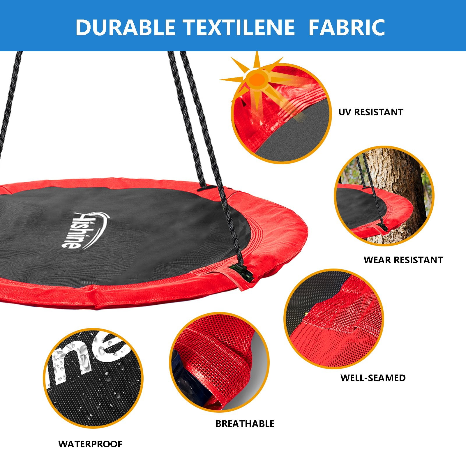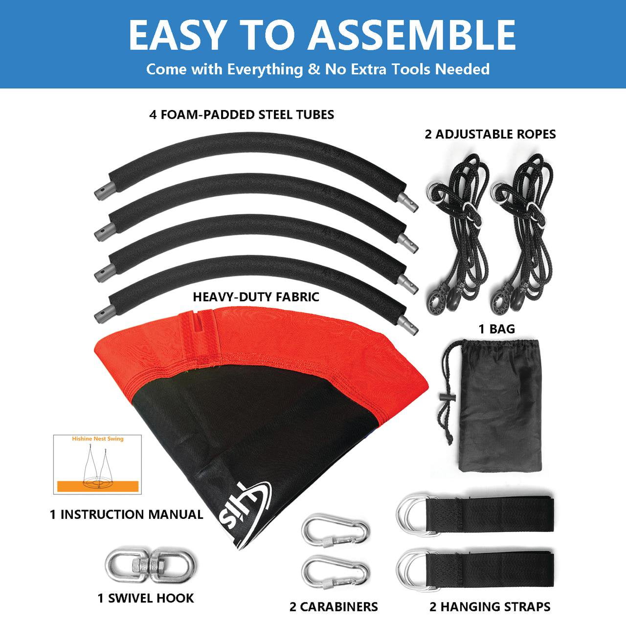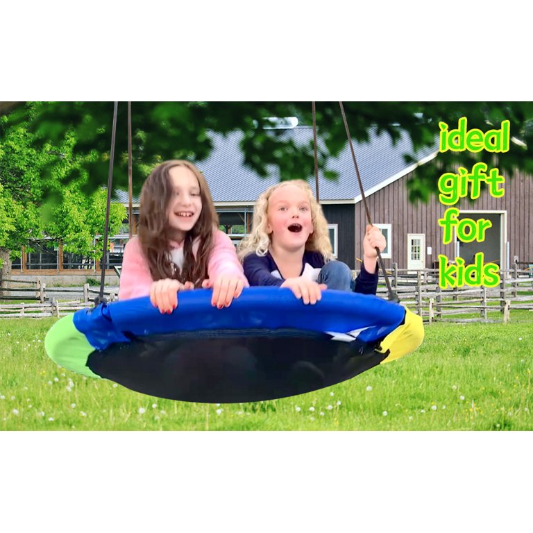 700lbs Weight Capacity- The heavy-duty swing seat and circular steel frame could hold up to 700lbs, strong enough for 3 kids swinging together. Have fun together with your friends. The nest swing is fun for all ages. Your whole family would love it! Easy Installation- The saucer tree swing is easy to set up. Follow the detailed instructions we provide, the swing will be fully assembled in 5 minutes. Please make sure all parts are properly assembled and use it under adult supervision. Strong Integrated connector- Strong integrated connectors connect ropes with frames, better than traditional screw assembly ways where screws are easily rusted and fall out. It shortens the installation steps, reduces the assembly difficulty, prolongs the swing use time, makes kids safer and away from danger. Durable Fabric Seat- We use tightly- woven, well-seamed Textilene fabric to make the round mat swing seat. The swing mat is much thicker and stronger than normal oxford fabric, won’t fade, break, tear apart or sag down for years. It is also waterproof, UV-resistant, wear-resistant and long-lasting. Adjustable Length & Height- The length of the swing can be adjusted from 44″ to 91″ by ropes and straps. Multistrand ropes are adjustable in length. 12mm multistrand ropes ensure your kids’ safety. Heavy-duty straps also can be adjusted, help to hang your swing on a tree or a swing set. You will find endless fun in your backyard. 3 Hanging Options-360° rotating swivel -Customize your fun with a swivel ring! Hang the spinner swing with a swivel hook to enjoy swinging like a flying saucer. 2 point hanging- swing back and forth to enjoy a wonderful quiet leisure time. 1 point hanging- easily hang the swing on one point to swing freely. Everything Included- Textilene fabric seat1x | Stainless steel frame parts 4x | Adjustable ropes 2x | Heavy duty hanging straps 2x | Reinforced carabiners 2x | Swivel hook 1x | Instruction mannual 1x | Storage bag 1x