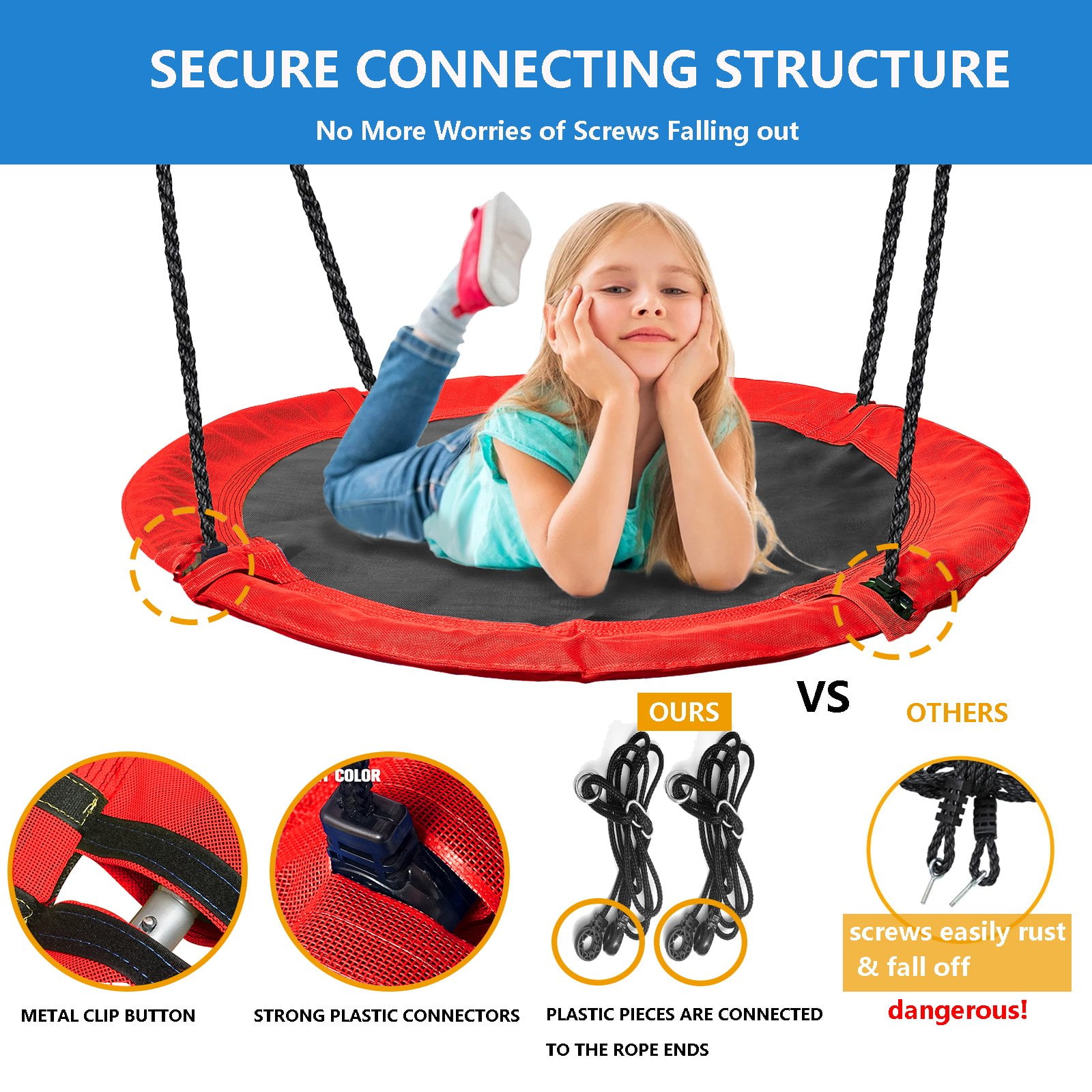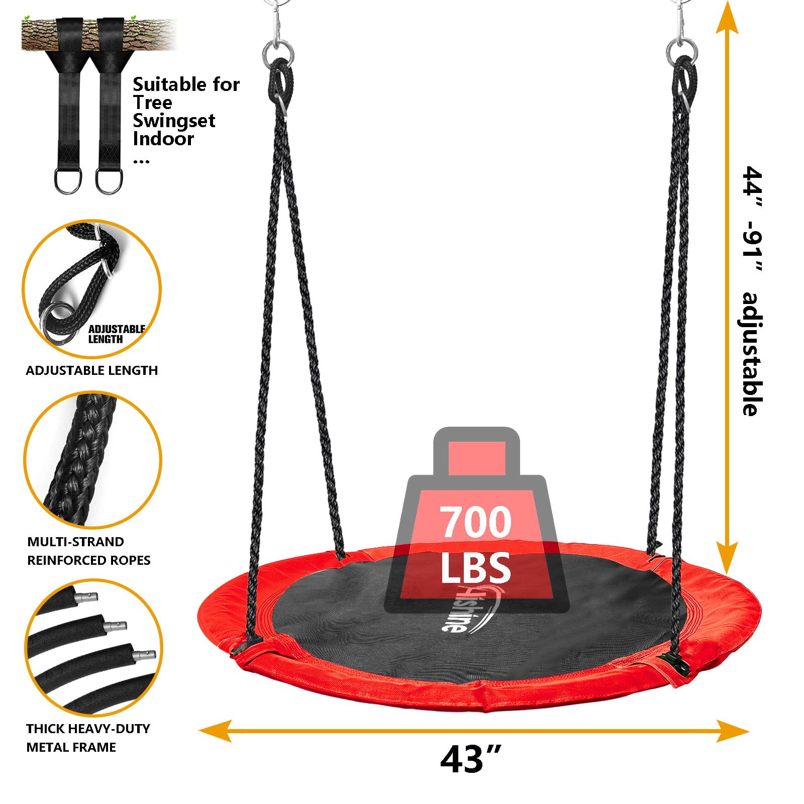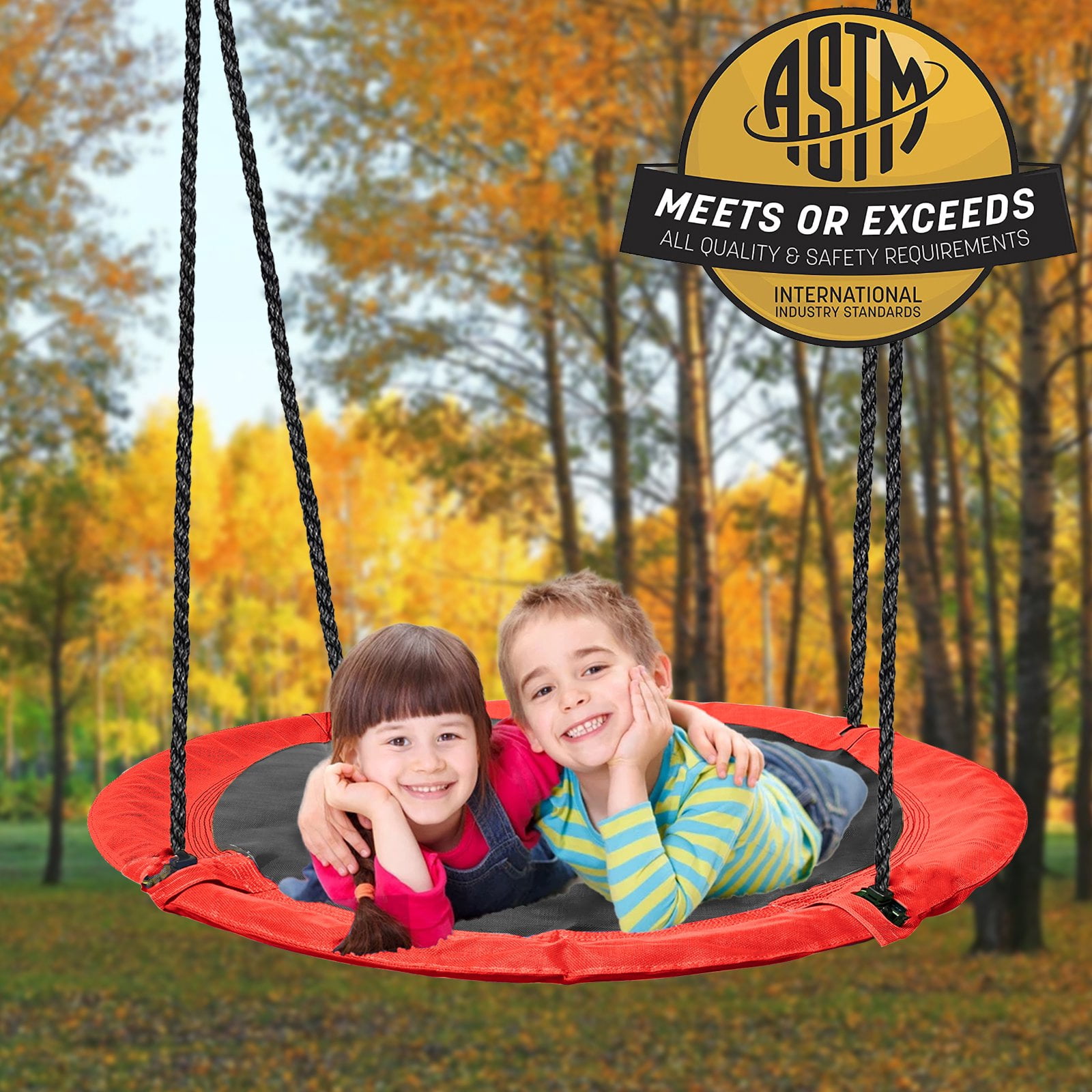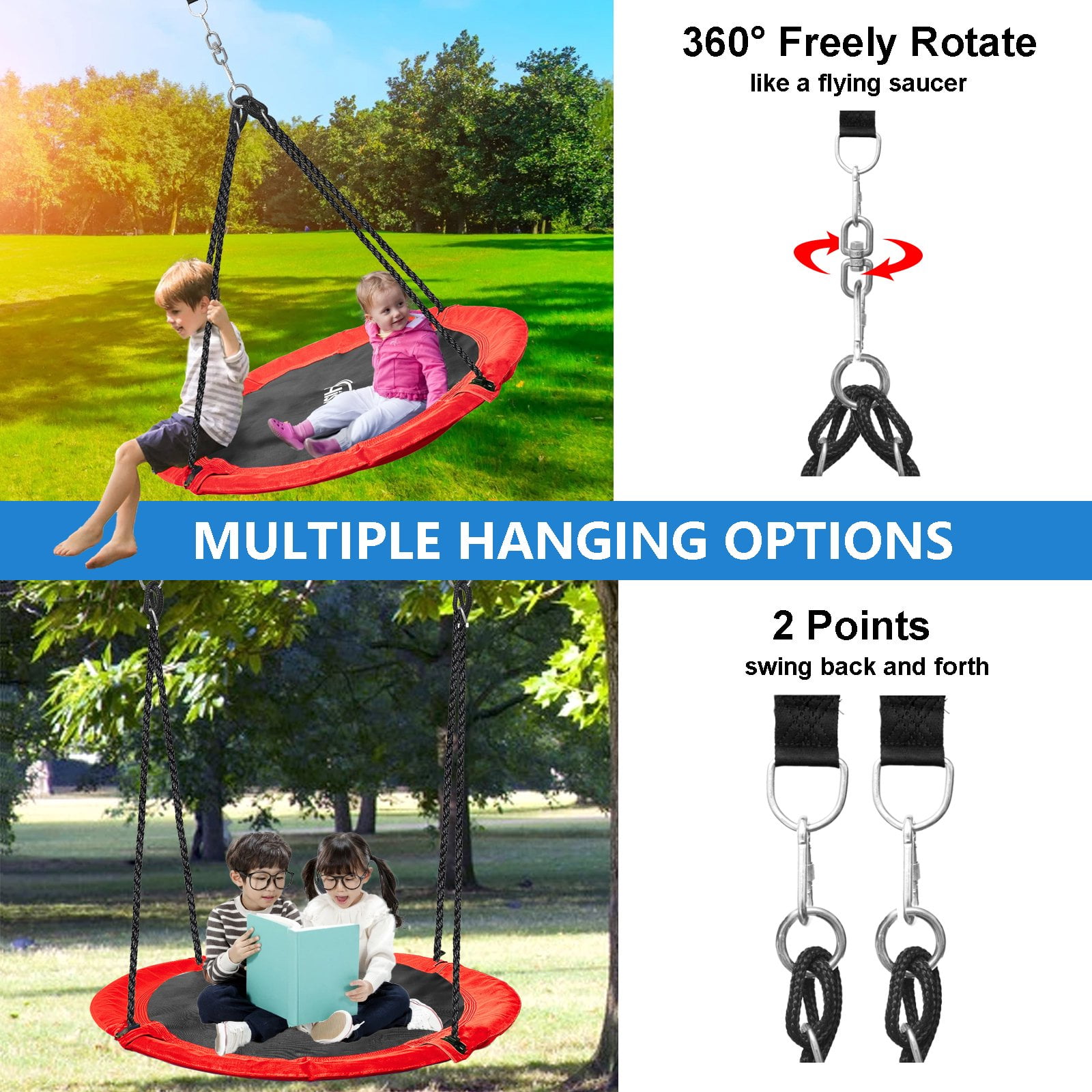 Saucer Tree Swing for Kids, 43″ Waterproof Flying Saucer Swing with A Swivel, Hanging Straps, Adjustable Ropes, Galvanized steel frame, padded with foam, Easy to Install Round Mat Spinner Swing, Red