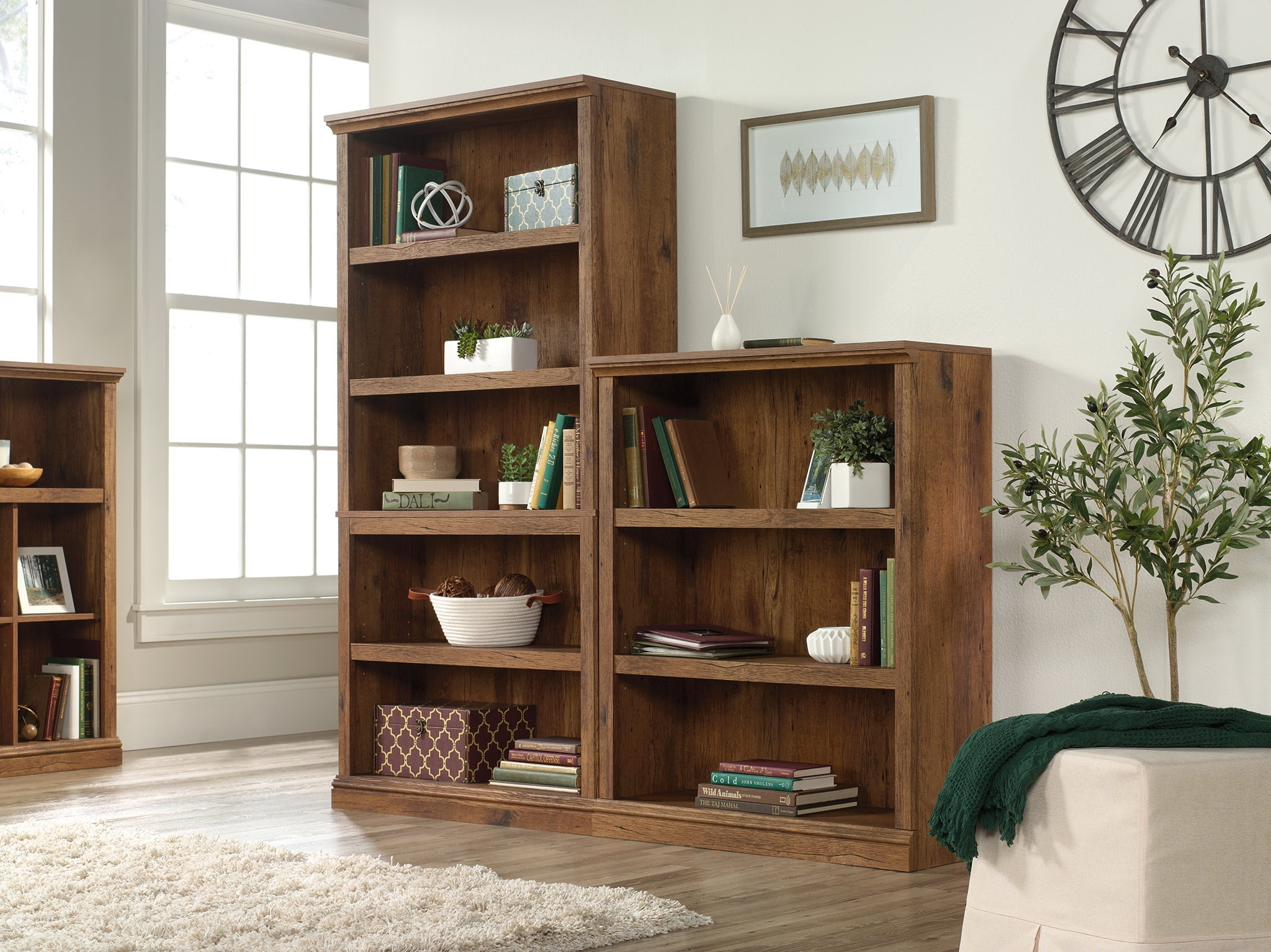 Is the lack of storage space in your home becoming an issue? Look no further! This 5-shelf bookcase from the Sauder Select collection is the solution to all your storage woes. This living room bookcase features five large shelves that provide you with the ideal amount of space to store a variety of items like work binders, your collection of cookbooks, and organizing bins. These spacious shelves also make a great place to display home decor items like decorative plants, knick-knacks, awards and framed family photos. Theres a place for all your things! This display bookcase includes three adjustable shelves that can move to different heights to create flexible storage and display for items of all shapes and sizes. Its charming good looks and versatile design make this 5-shelf bookcase a great addition to any room in your home. Finished in Vintage Oak, this stunning bookshelf will have you feeling organized in no time.