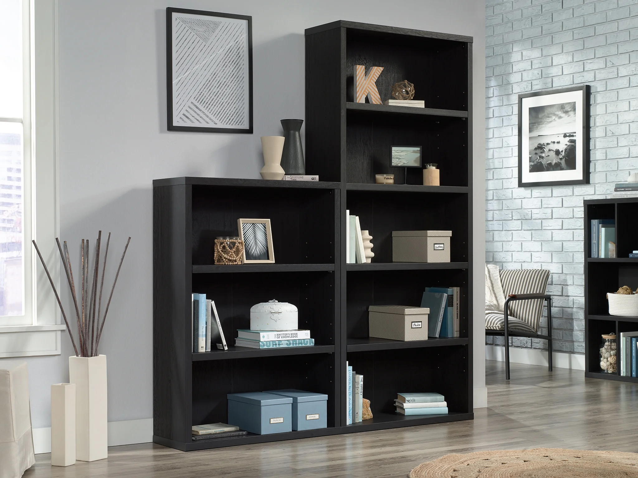 Versatile open storage is a must in the 21st century home. For adaptable storage solutions, look to the 5-shelf bookcase from the Sauder Select collection. This display bookcase is constructed of strong and lightweight 1 panelsmeaning it is light enough to move around your home as often as you redecorate, but sturdy enough to hold all of your bookcase essentials. This wood bookcase also features three adjustable shelves, which allows you to customize your bookshelf to fit your needs. The adjustable shelves make it easy to store and display items of various heights like books and vacation photo albums, treasured family objects, or simply your favorite home decor. Whatever your storage wants, this living room bookcase allows you to customize its use to best suit your needs. With a dark Raven Oak finish, this 5 shelf bookshelf blends in, while standing out, in any room of your home. We hope you like what you see. Our designers travel the world and bring back the best and latest in style, finish, and color trends. This inspiring world travel is evident in the cutting edge and innovative furniture solutions we offer to you! Other affordable furnishings from the collection (sold separately) are available to complete the look. For assistance after the purchase, you can to reach out to our award-winning and friendly Midwest based customer service. They are ready to help you every step of the way with any questions you might have about the product. Please contact us at 1-800-523-3987.