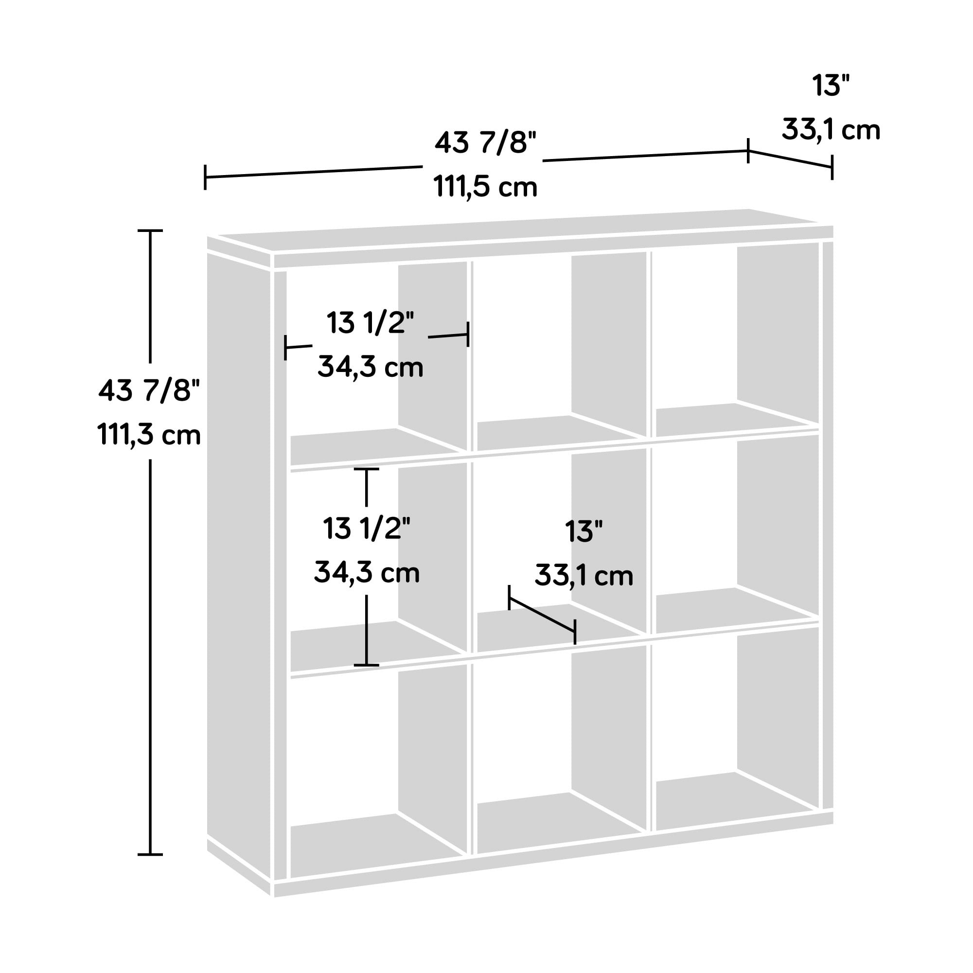 Assembled Dimensions: 43.9″ L x 13.03″ W x 43.82″ H Versatile design creates multiple storage solutions Nine cubbyhole areas for a variety of storage and display options Holds 13″ x 13″ storage bins (sold separately) Finished on all sides for versatile placement in any room of your home Mystic Oak finish Model #: 431287 Box Dimensions: 49.21″ L x 15.83″ W x 7.64″ H For additional questions or any issues, please contact the manufacturer at 1-800-523-3987. Be sure to check out the Sauder Miscellaneous Storage collection for more great items!