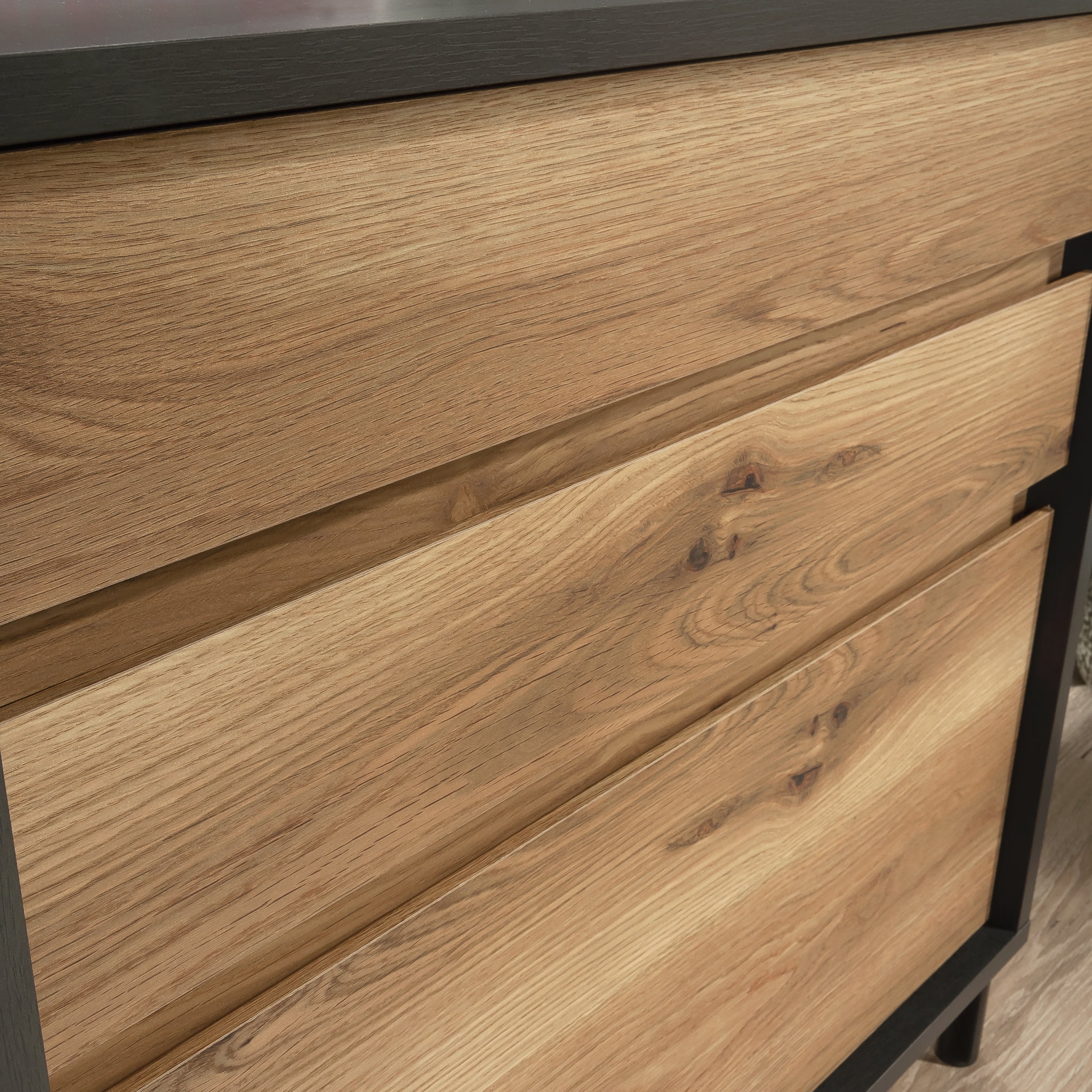 No matter how daring your home aesthetic, there’s a lateral file for everyone. This 3-drawer lateral file cabinet from the Acadia Way collection brings a new status quo to file storage. This 3-drawer file cabinet features two storage drawers with metal runners and safety stops for home office supplies like extra pens and pencils, your planner, your sticky note collection, and more. The lower file drawer with full extension slides accommodates legal or letter-size hanging files so you can keep all your important documents organized. Designed with a T-lock drawer system, this file cabinet with drawers is quick and easy to assemble. The spacious top surface of this wood lateral file cabinet makes a great place for additional storage and display of items like an accent lamp, your printer, and photos of your family. Detailed with metal feet for durability and finished on all sides for versatile placement, this lateral file will look great no matter where it stands. Finished in Raven Oak with Timber Oak accents, this legal-size filing cabinet turns something boring into something tasteful.
