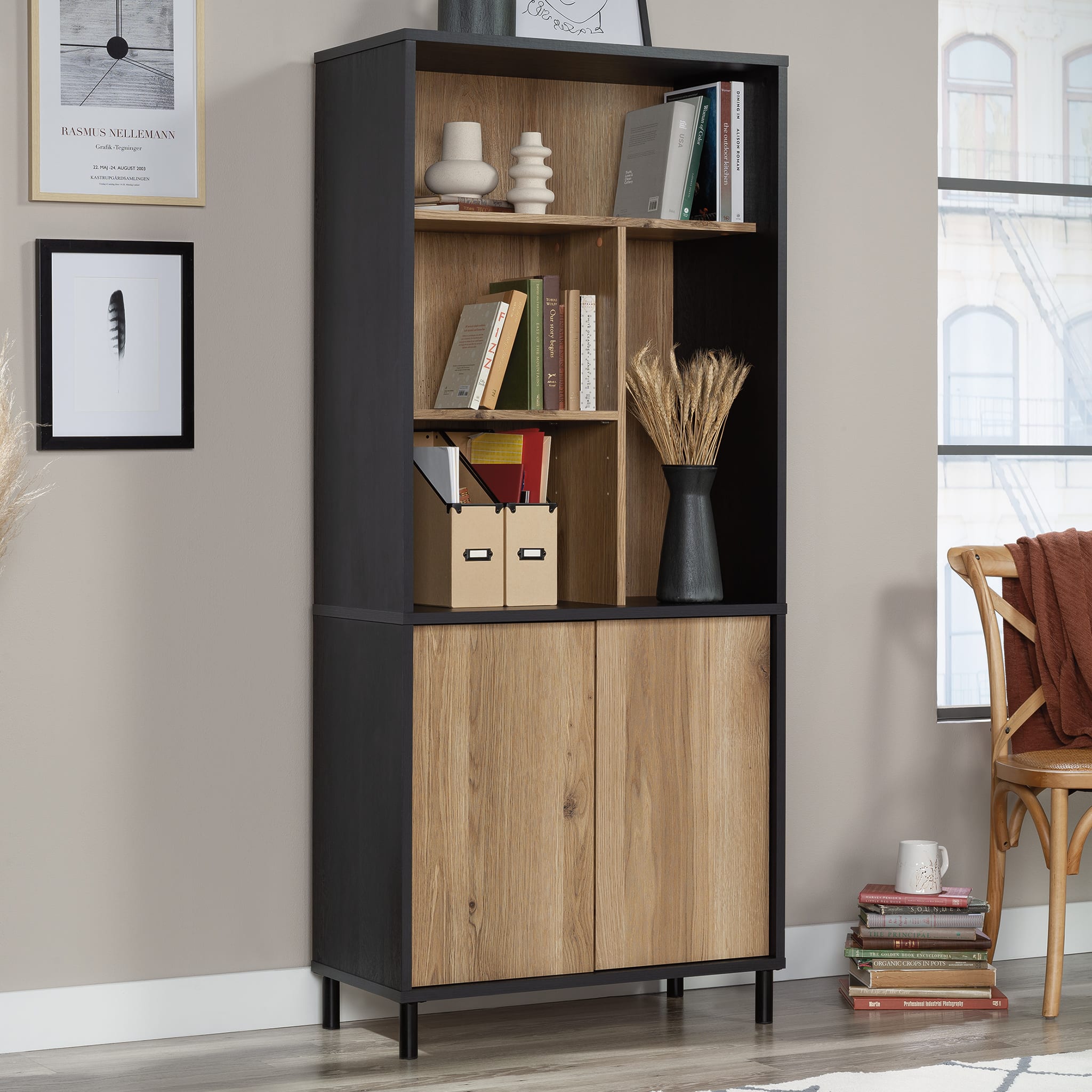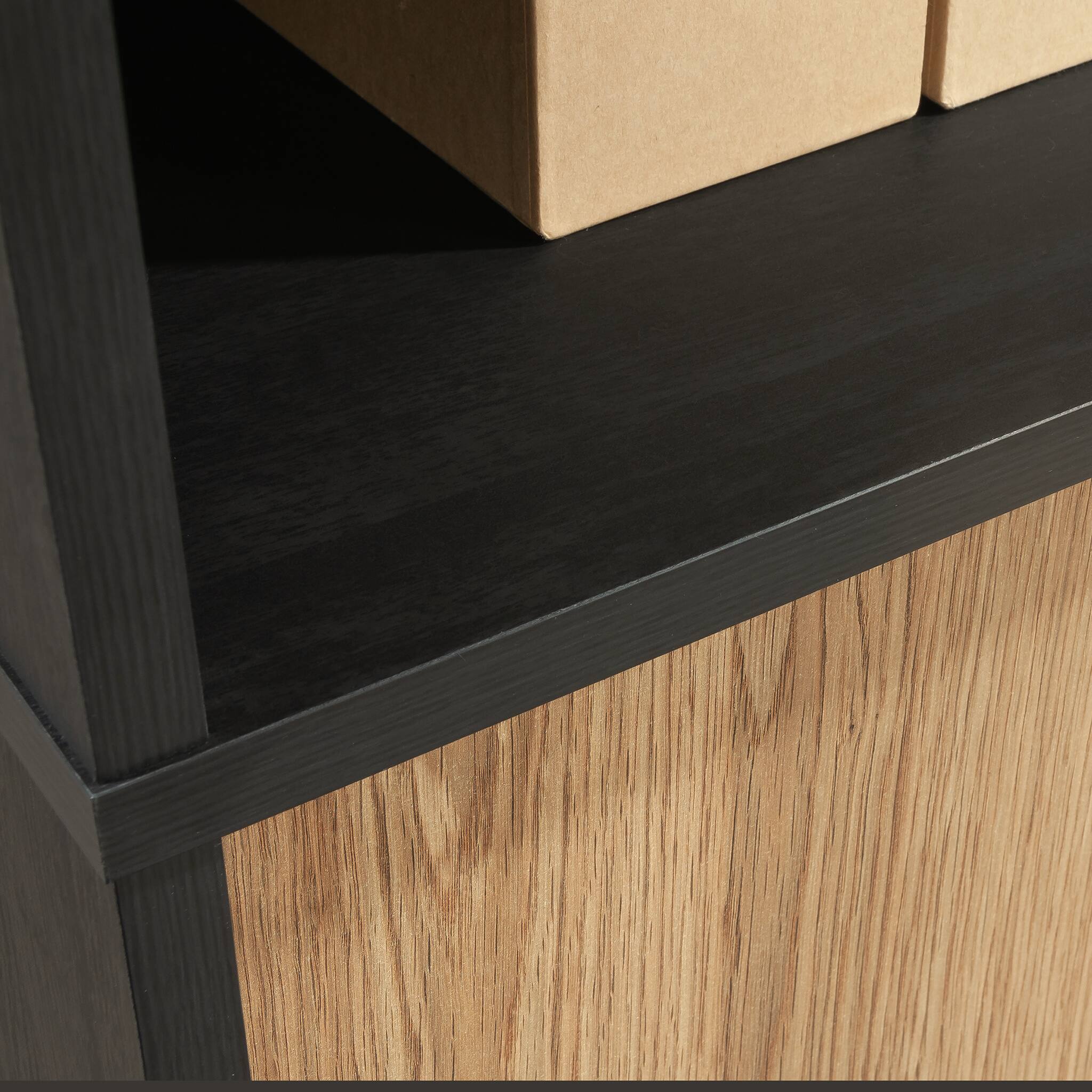 Open shelving for storage and display of books, magazines, and home decor. Hidden storage behind sliding door to display what you want and forget the rest. Two small adjustable shelves to accommodate items of various heights. Designed with a durable, powder coated metal frame. Finished in Sindoori Mango with White accents.
