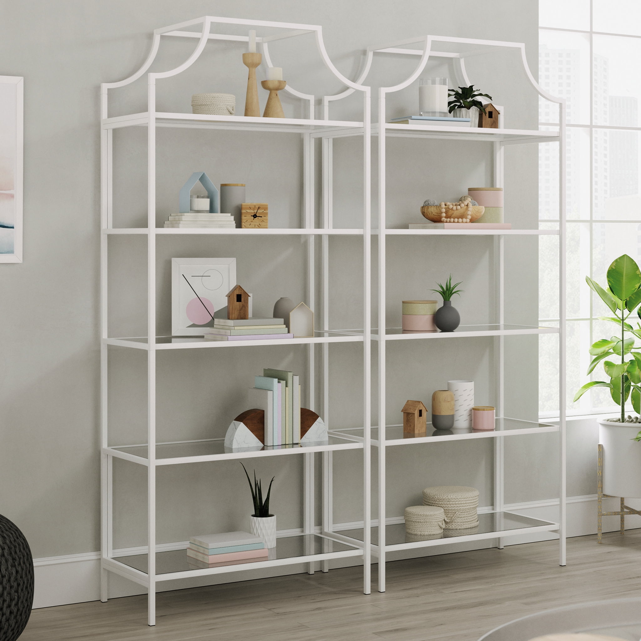 A simple addition can change the look of an entire room. Create a sophisticated look in any room of your home with the modern style and design of this bookcase from the Anda Norr collection. This narrow bookcase includes five open shelves for storage and display. Each shelf features safety-tempered glass for an extra touch of style that is sure to stand out. The spacious shelves are ideal for showcasing all your favorite home decorations such as a vase full of flowers, your array of knick-knacks, and framed photos of your family and friends. These large shelves also make a great spot to store items like your cookbooks, gardening magazines, and organizing bins. Its rounded edges and curved indent design give it a stunningly unique appearance that is sure to grab the attention of your friends and family. Constructed from sturdy metal and finished on all sides in white, this elegant bookcase will elevate the style in any room of your home.