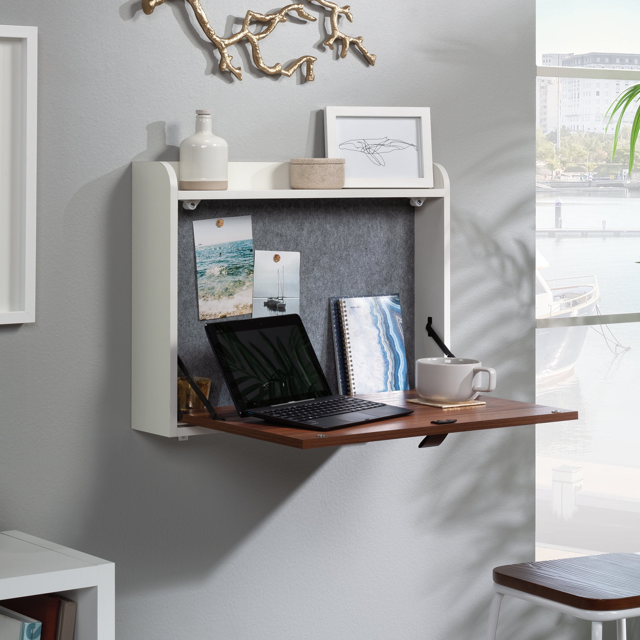Is limited space in your home bringing you down? Not for long! Create the convenient spot you need to work on projects or write out your bills without having to take up a huge amount of space in your home with this wall desk from the Anda Norr collection. This floating desk features a space-saving design that offers versatile placement throughout any room in your home – the guest room, home office, living room, or other location! The door of this wall mounted desk flips down to create a spacious work surface that can accommodate your laptop, stacks of notepads, a cup full of pens, and of course your favorite coffee mug. Behind the flip-down door is a gray felt tack board that is perfect for hanging reminders, important papers, and your mail. This space saving desk also includes an upper display shelf for smaller home décor items and knick-knacks. Finished in Pearl Oak with Blaze Acacia accents, this hanging desk is everything you need and more.