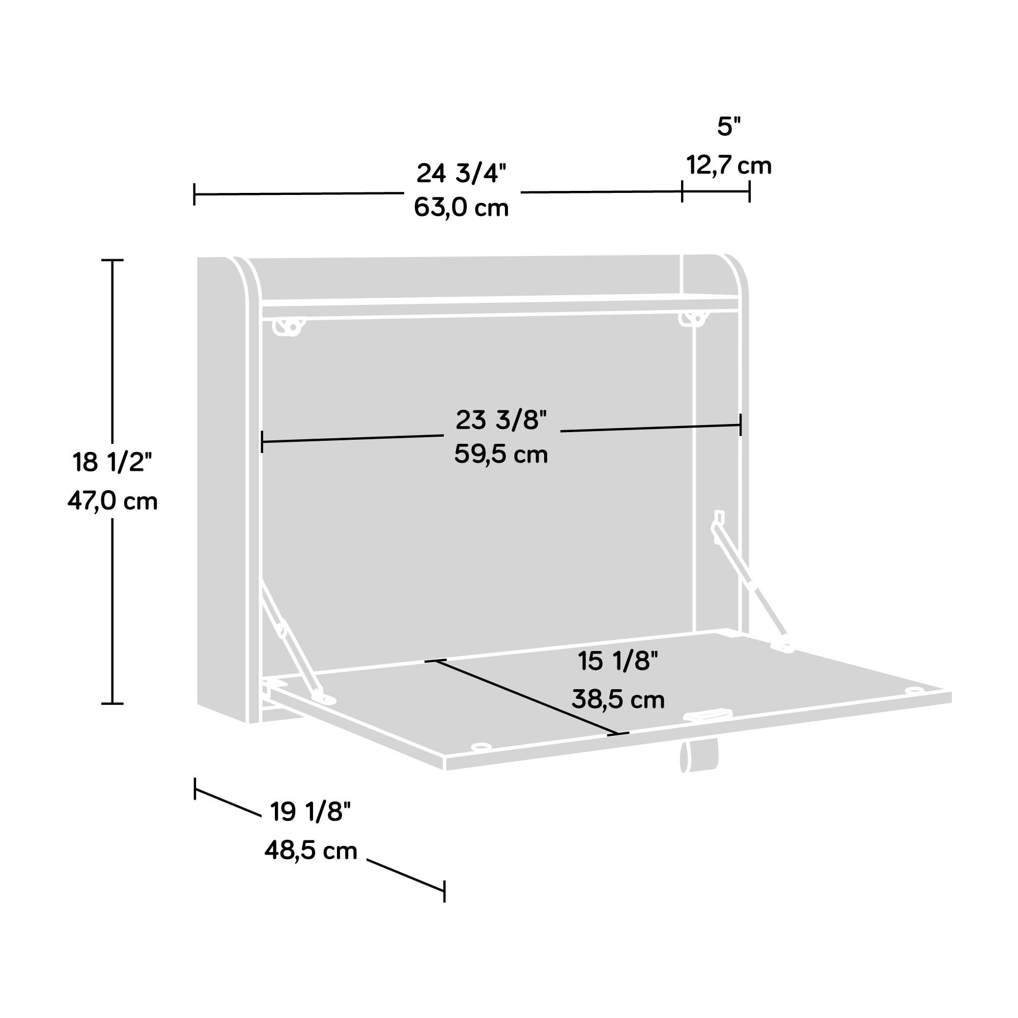 Assembled Dimensions: 24.80″ L x 5.00″ W x 18.50″ H Space-saving hanging design offers versatile placement Space-saving hanging design offers versatile placement Tack board with gray felt behind door for mail, to-do lists, and more Upper display shelf for small items Accented with leather pull for durability and design Pearl Oak finish with Blaze Acacia accent Model #: 431222 Box Dimensions: 29.53″ L x 22.05″ W x 6.89″ H For additional questions or any issues, please contact the manufacturer at 1-800-523-3987. Be sure to check out the Sauder Anda Norr collection for more great items!