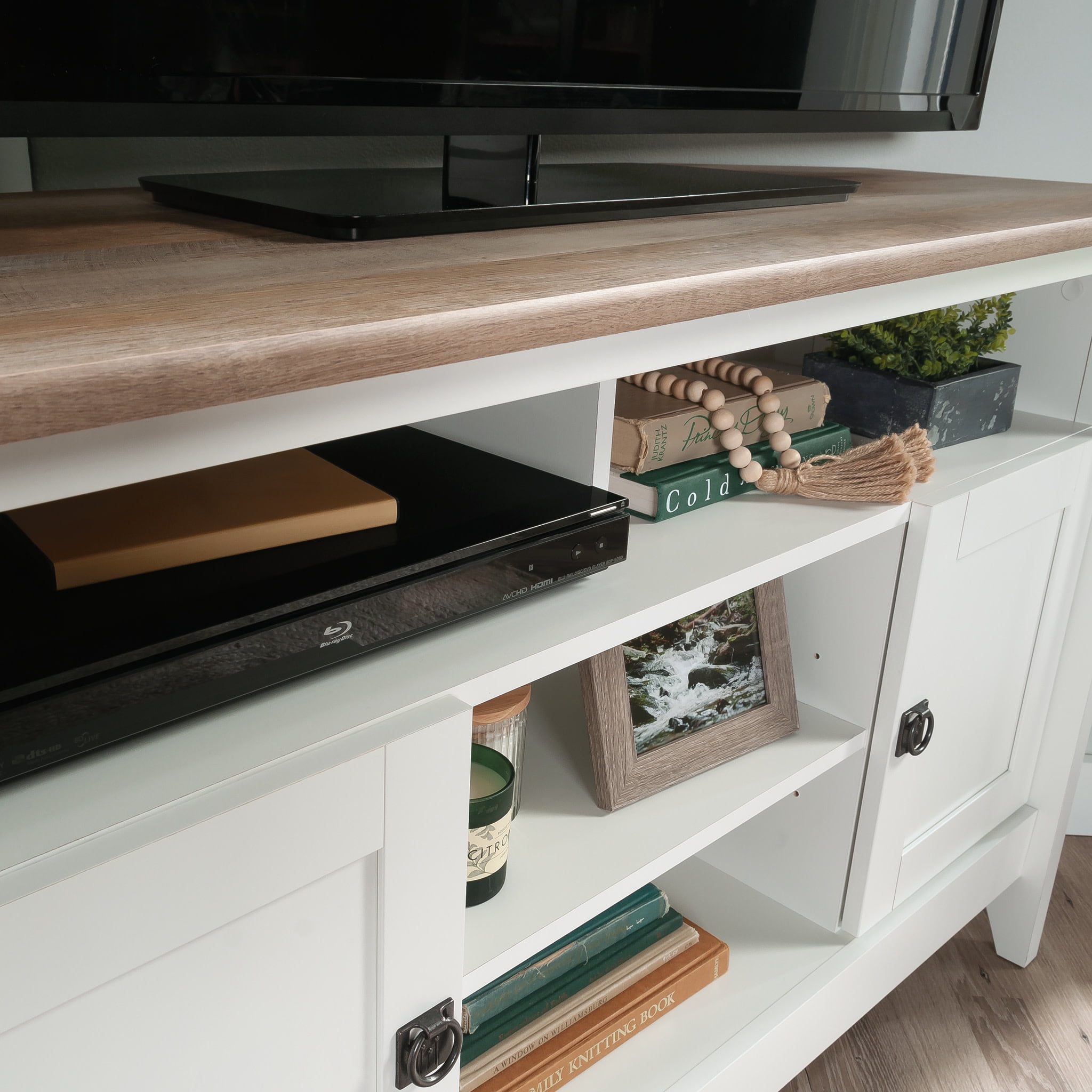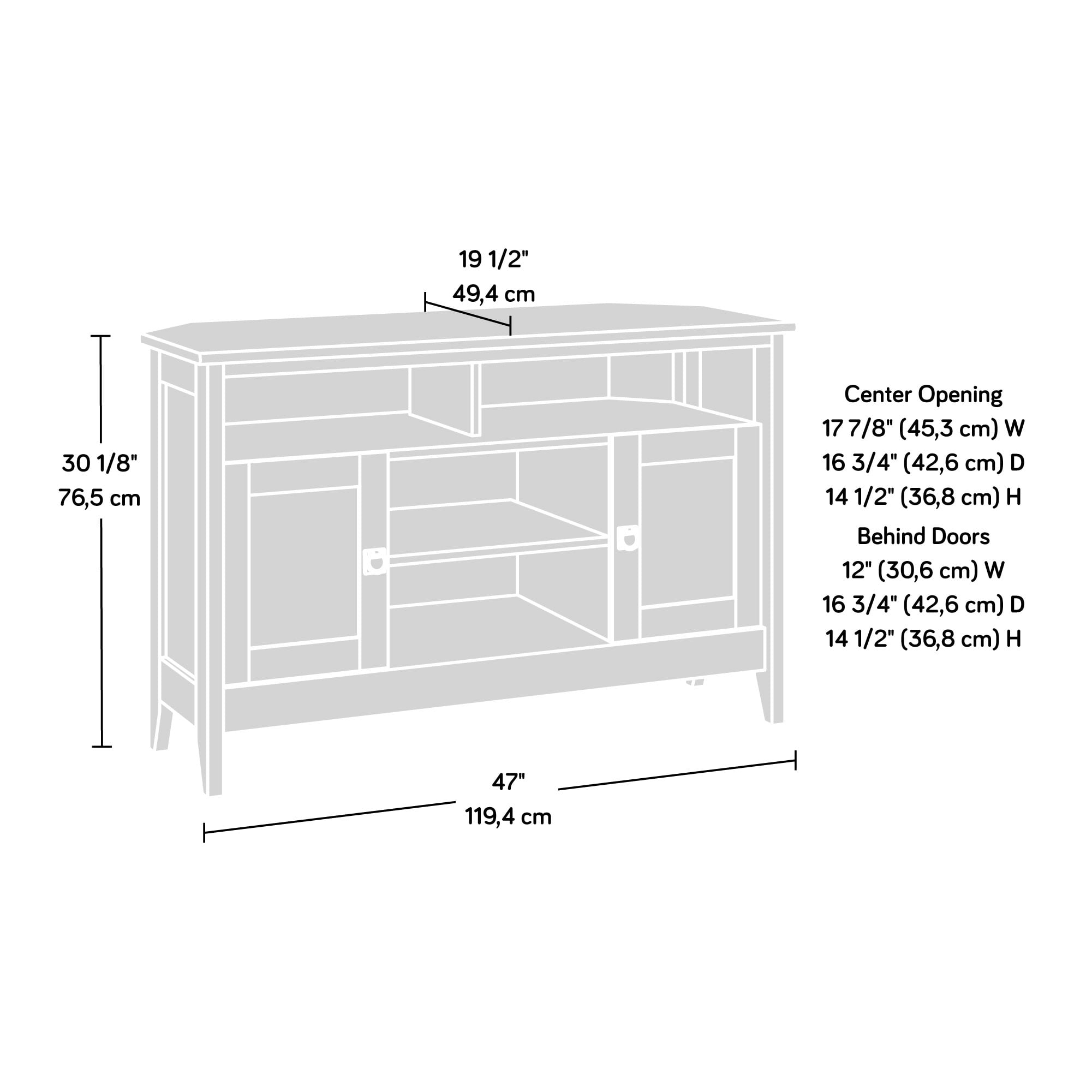 Assembled Dimensions: 47.01″ L x 19.45″ W x 30.12″ H Accommodates up to a 50″ TV weighing 50 lbs or less Divided storage holds audio/video equipment Adjustable shelf behind each door accommodates items of various sizes Adjustable center shelf for dcor, DVDs, and more Cord management to reduce cable clutter Soft White finish with Lintel Oak accent Model #: 433851 Box Dimensions: 51.88″ L x 20.13″ W x 5.63″ H For additional questions or any issues, please contact the manufacturer at 1-800-523-3987. Be sure to check out the Sauder August Hill collection for more great items!