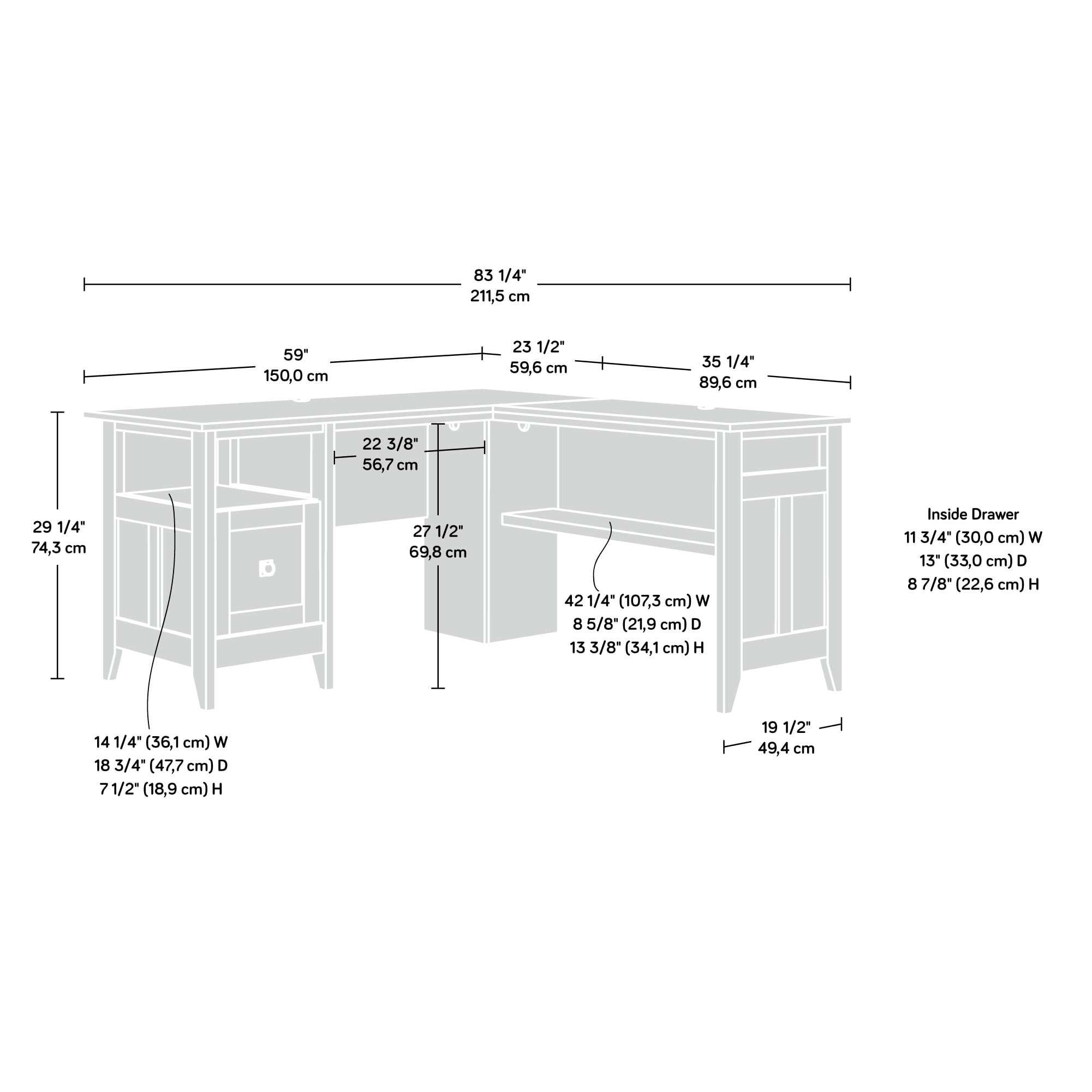 Assembled Dimensions: 59.06″ L x 58.74″ W x 29.25″ H File drawer with full extension slides holds letter-size hanging files Grommet holes and pass-throughs for cord management Lower shelf for additional storage Dover Oak finish with Slate finish accents Model #: 412320 Box Dimensions: 64.75″ L x 25.00″ W x 5.37″ H For additional questions or any issues, please contact the manufacturer at 1-800-523-3987. Be sure to check out the Sauder August Hill collection for more great items!