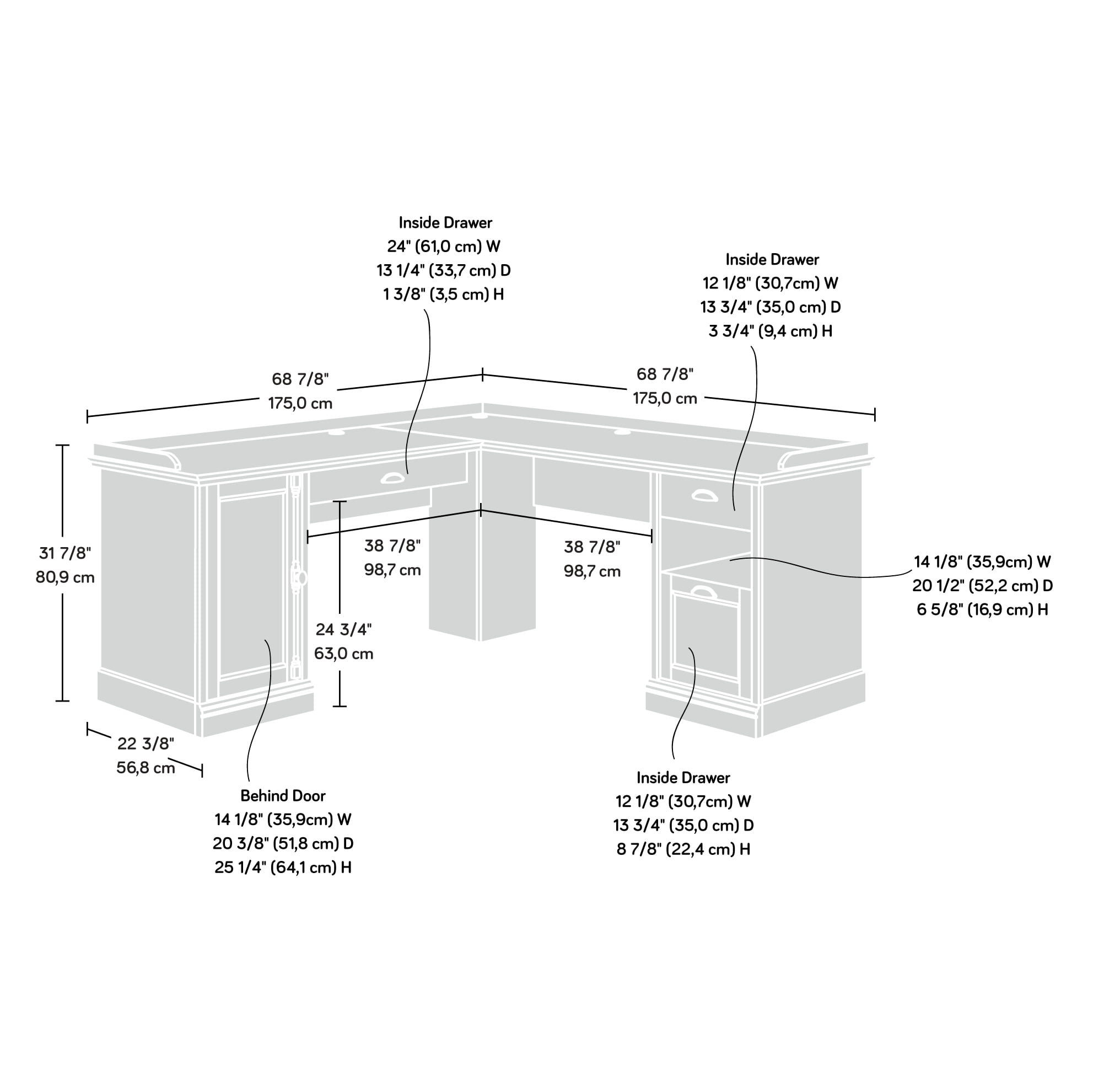 Assembled Dimensions: 68.9″ L x 68.9″ W x 31.85″ H Two drawers feature metal runners and safety stops File drawer with full extension slides holds letter or legal size hanging files to help keep you organized Storage area behind door holds a vertical CPU tower and has an adjustable shelf for flexible storage options Pencil drawer can be fastened on the left or right side – you decide what fits you best Desk top has grommet holes providing a convenient path for electrical cords Finished on all sides for versatile placement anywhere in your home Quick and easy assembly with patented T-lock drawer system Salt Oak finish Model #: 418270 Box 1 Dimensions: 24.0″ L x 74.38″ W x 2.81″ H Box 2 Dimensions: 24.06″ L x 51.0″ W x 4.44″ H For additional questions or any issues, please contact the manufacturer at 1-800-523-3987. Be sure to check out the Sauder Barrister Lane collection for more great items! This items ships in multiple cartons. If picking up in stores, please ensure you have enough room in your vehicle.