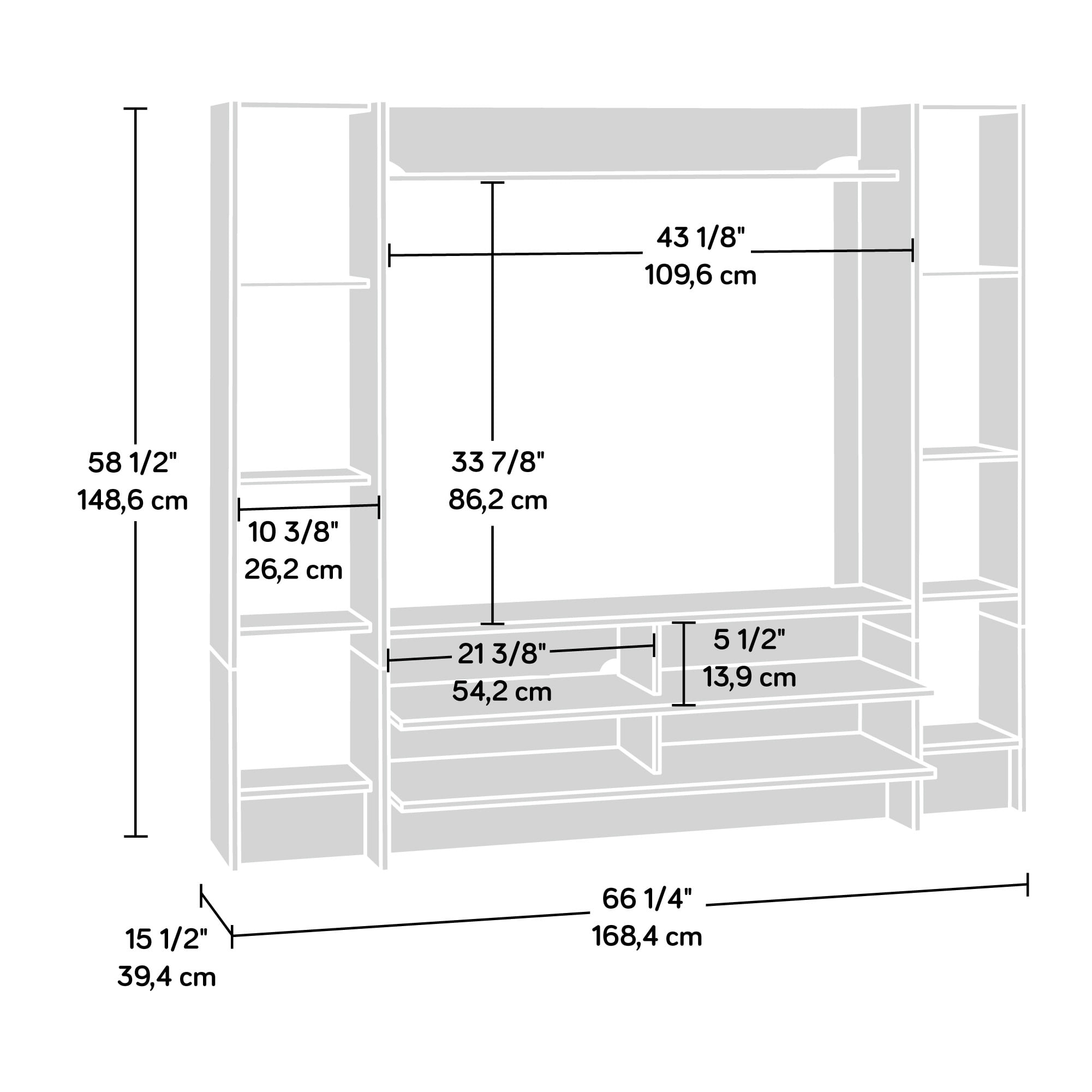 Assembled Dimensions: 66.30″ L x 15.51″ W x 58.50″ H Accommodates up to a 42″ TV weighing 50 lbs. or less Divided shelving holds audio/video equipment Four adjustable shelves Cord management Silver Sycamore finish Model #: 428240 Box Dimensions: 48.90″ L x 16.81″ W x 7.28″ H For additional questions or any issues, please contact the manufacturer at 1-800-523-3987. Be sure to check out the Sauder Beginnings collection for more great items!