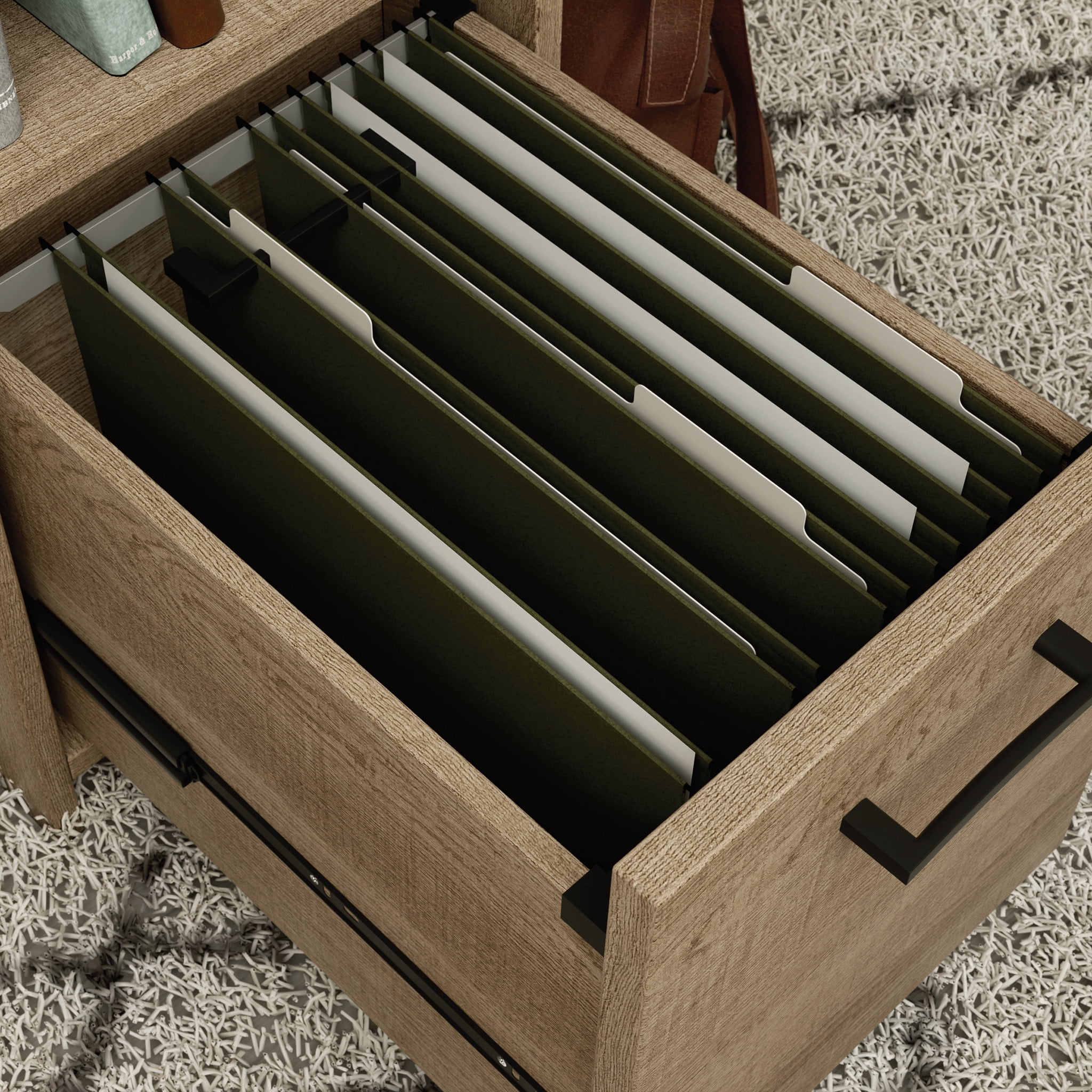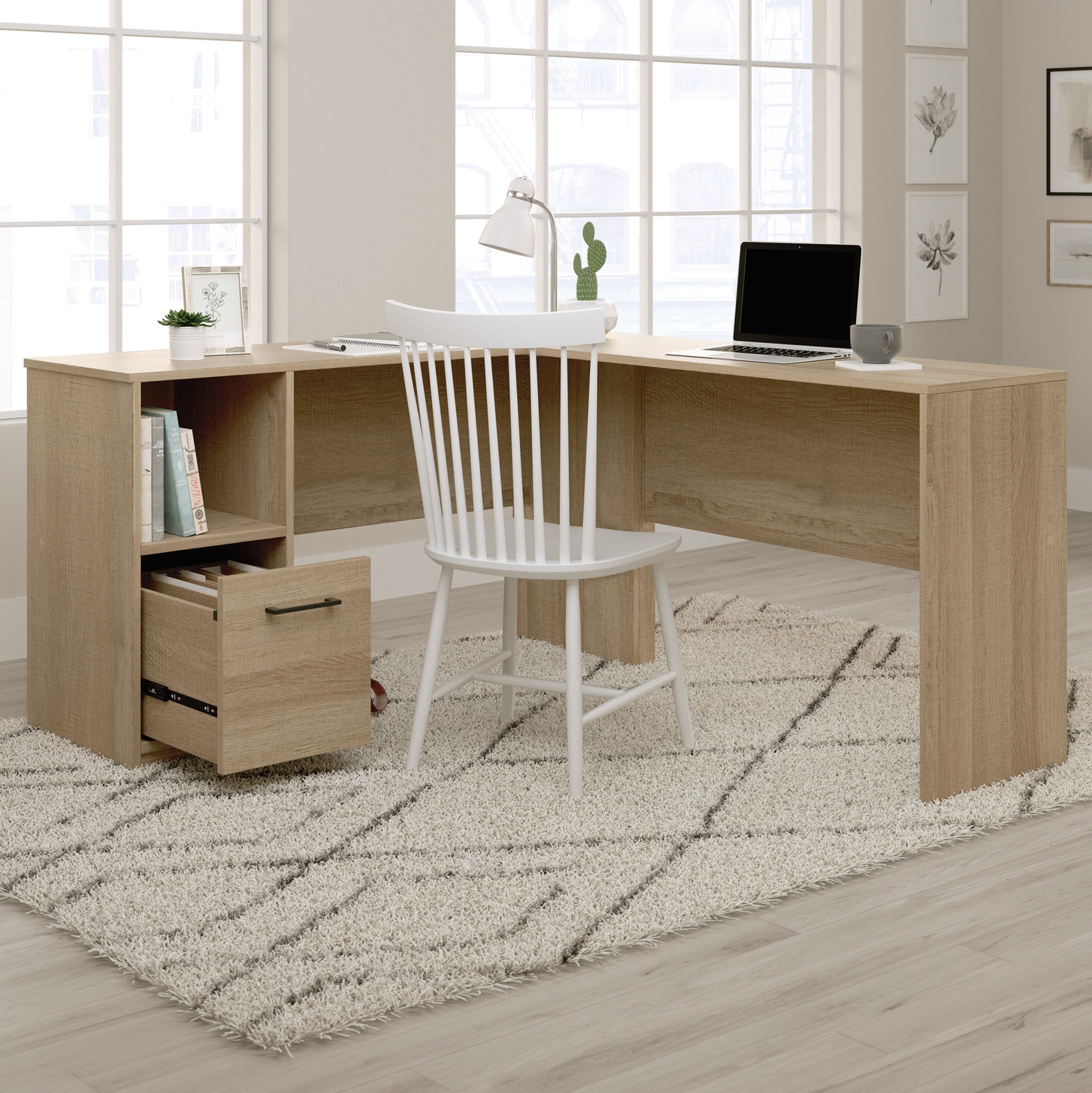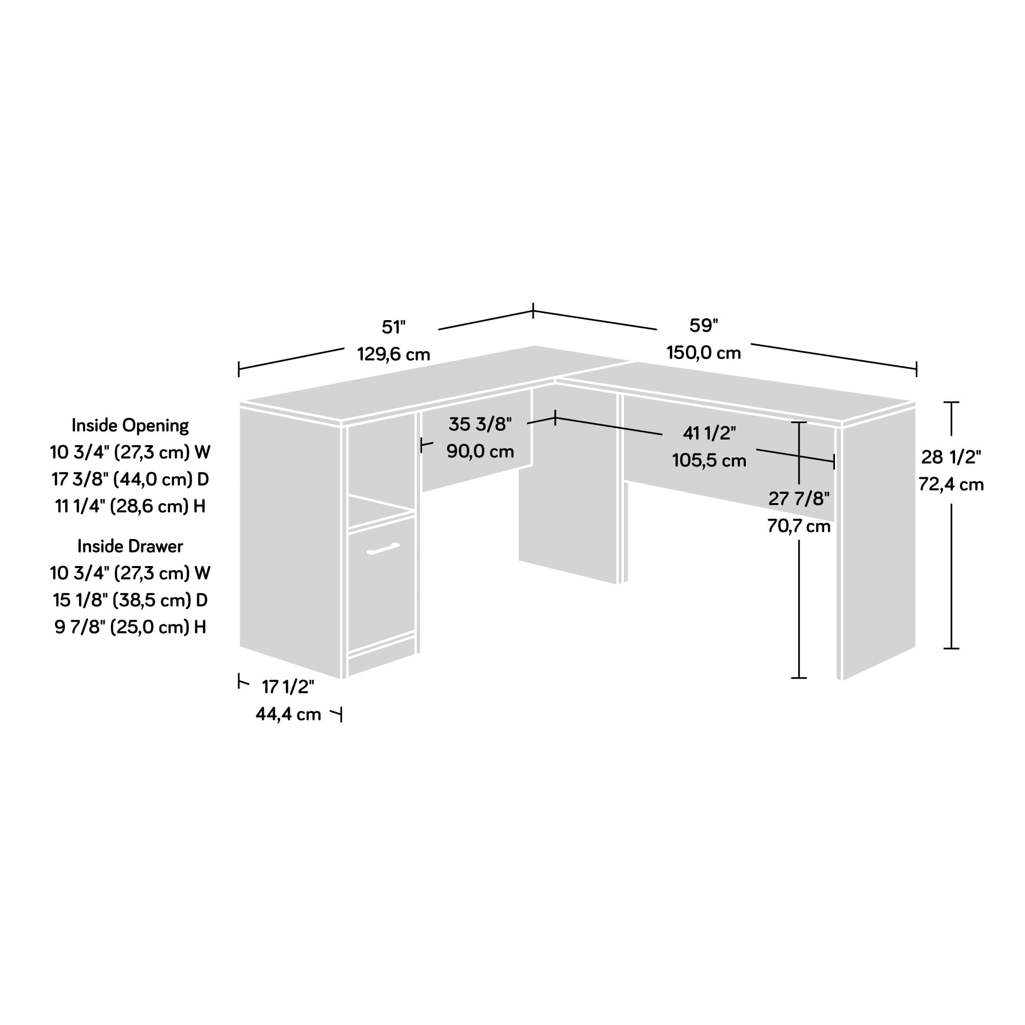 Assembled Dimensions: 51.02″ L x 59.06″ W x 28.50″ H Spacious work surface for laptop, notepads, lamp, etc File drawer with full extension slides holds letter-size hanging files to help keep you organized Open shelf for additional storage of office supplies Finished on all sides for versatile placement anywhere in your home Summer Oak finish Model #: 425092 Box Dimensions: 57.97″ L x 20.09″ W x 6.63″ H For additional questions or any issues, please contact the manufacturer at 1-800-523-3987. Be sure to check out the Sauder Beginnings collection for more great items!