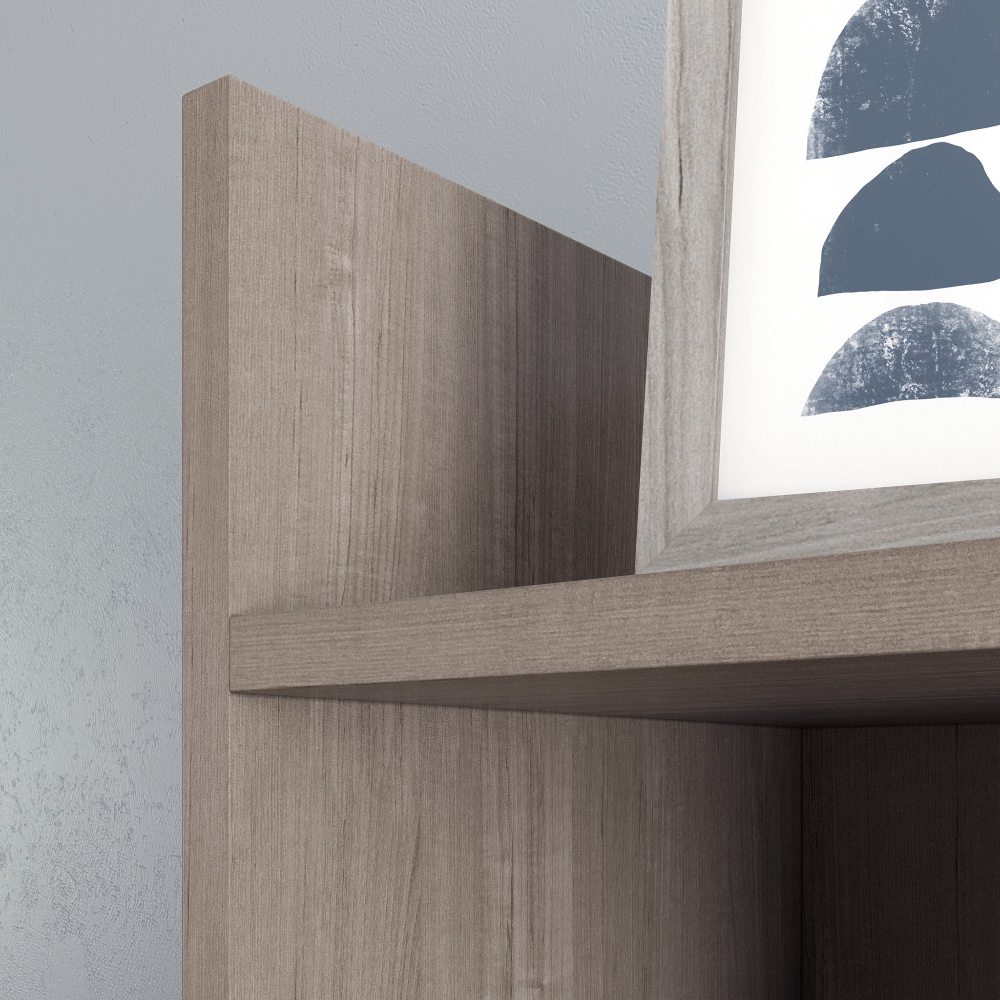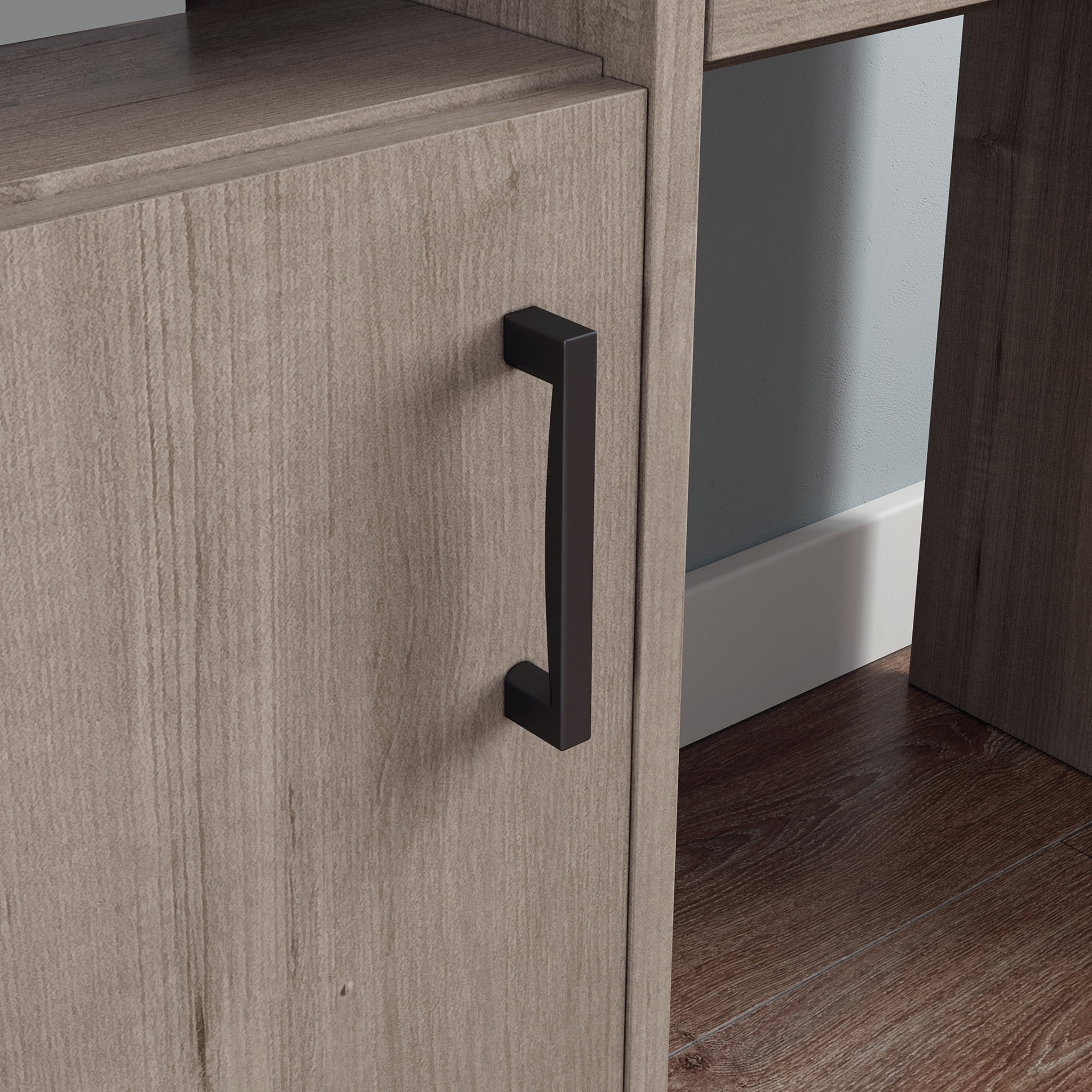 Looking to update your home office? Weve got you covered! Give your home office the stylish upgrade it needs with this computer desk with hutch from the Beginnings collection. This modern small office desk offers a spacious top surface that provides you with the room you need for desk essentials like your laptop, notepads, stacks of folders, and your hot cup of coffee. The storage drawer opens and closes on smooth metal runners and includes safety stops. This drawer is perfect for storing miscellaneous supplies like pencils and pens. Behind the door is a hidden storage area that includes an adjustable shelf that can move to different heights to accommodate binders and other items of various heights. The desk hutch features a full upper shelf along with an adjustable shelf for easy access storage and display of items like small organizing bins, office decor and framed photos. The appearance of cords wont compromise your home office style as this computer desk with storage also includes cord management with a desktop grommet. Finished in Silver Sycamore and detailed with attractive hardware, this small office desk is as stylish and as hardworking as you are.