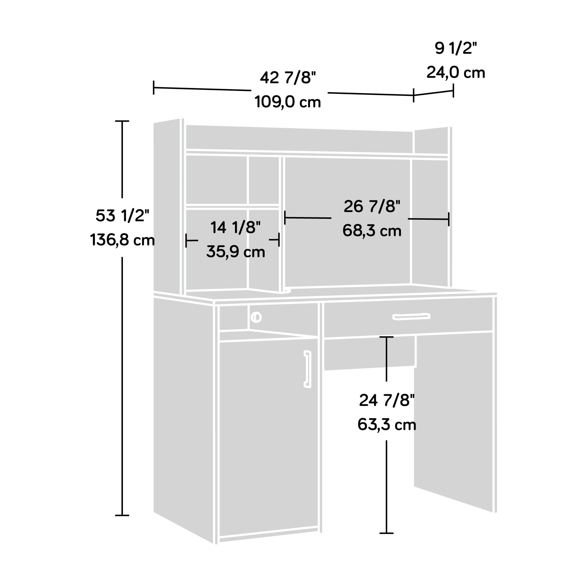 Assembled Dimensions: 42.91″ L x 19.45″ W x 53.47″ H Adjustable shelf behind door to accommodate items of various heights Drawer features smooth metal runners and safety stops Hutch features full upper shelf and small adjustable shelf for storage customization Cord management with desktop grommet to keep your electronics organized Finished in a cool Silver Sycamore” Assembly Required Model #: 428238 Box Dimensions: 48.03″ L x 19.96″ W x 6.18″ H For additional questions or any issues, please contact the manufacturer at 1-800-523-3987. Be sure to check out the Sauder Beginnings collection for more great items!